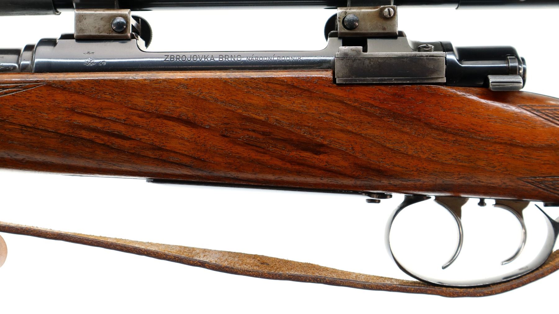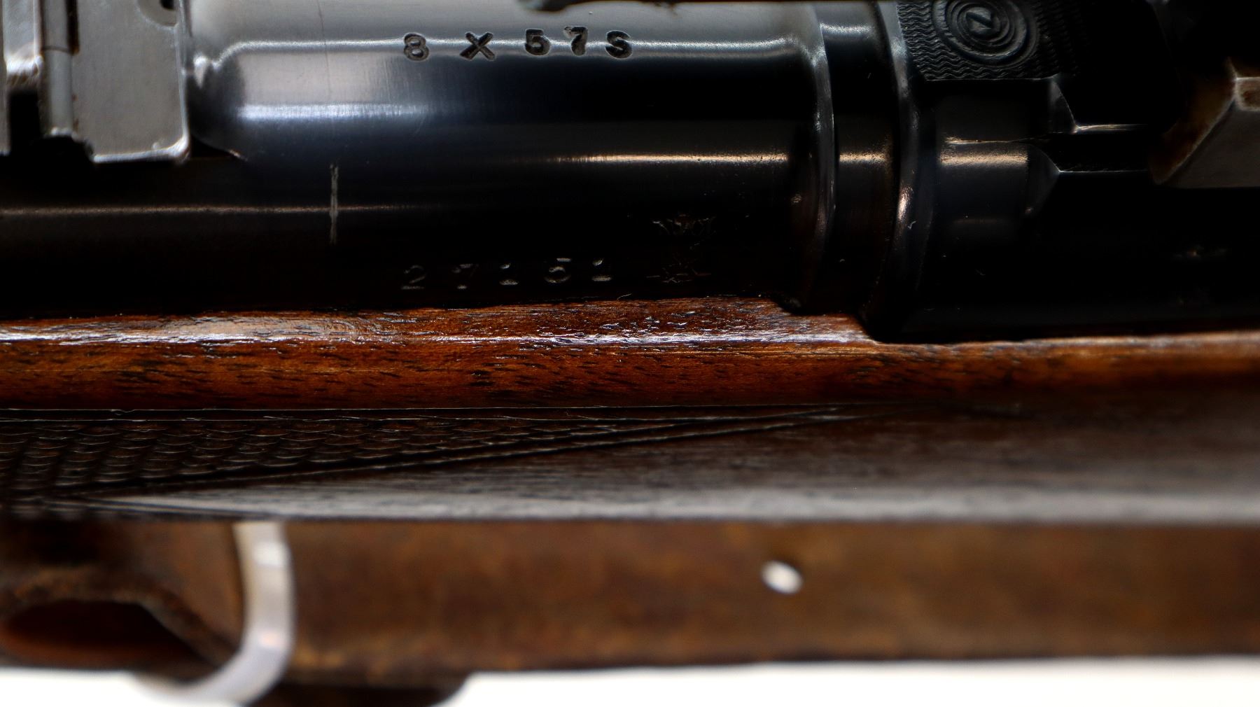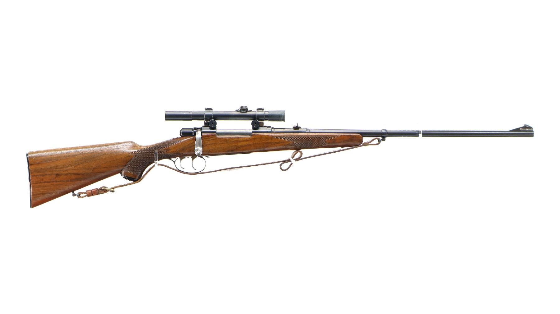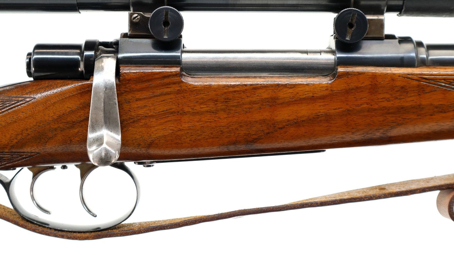 Main Description: Dated 1949. Blade front sight with ramp, adjustable u notched rear sight with one fixed and one folding leaf, polish blued finish, receiver has integral scope bases with Vintage rings and Zeiss fixed power scope numbered 3012130, clear optics with German NO1 reticle, butter knife bolt handle, double set triggers. One piece wood stock, checkered forearm, pistol grip and black polymer butt plate, European cheek rest, grip cap, swivels with brown leather sling.