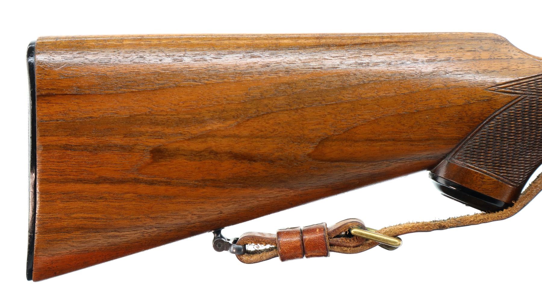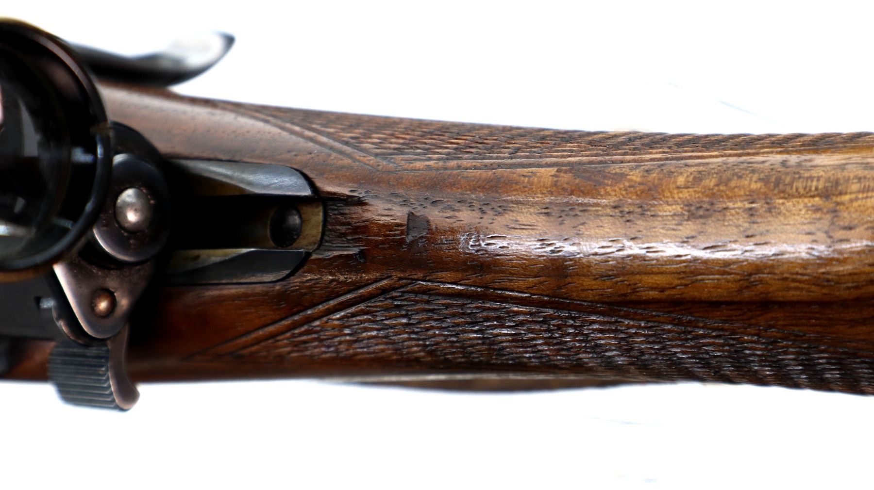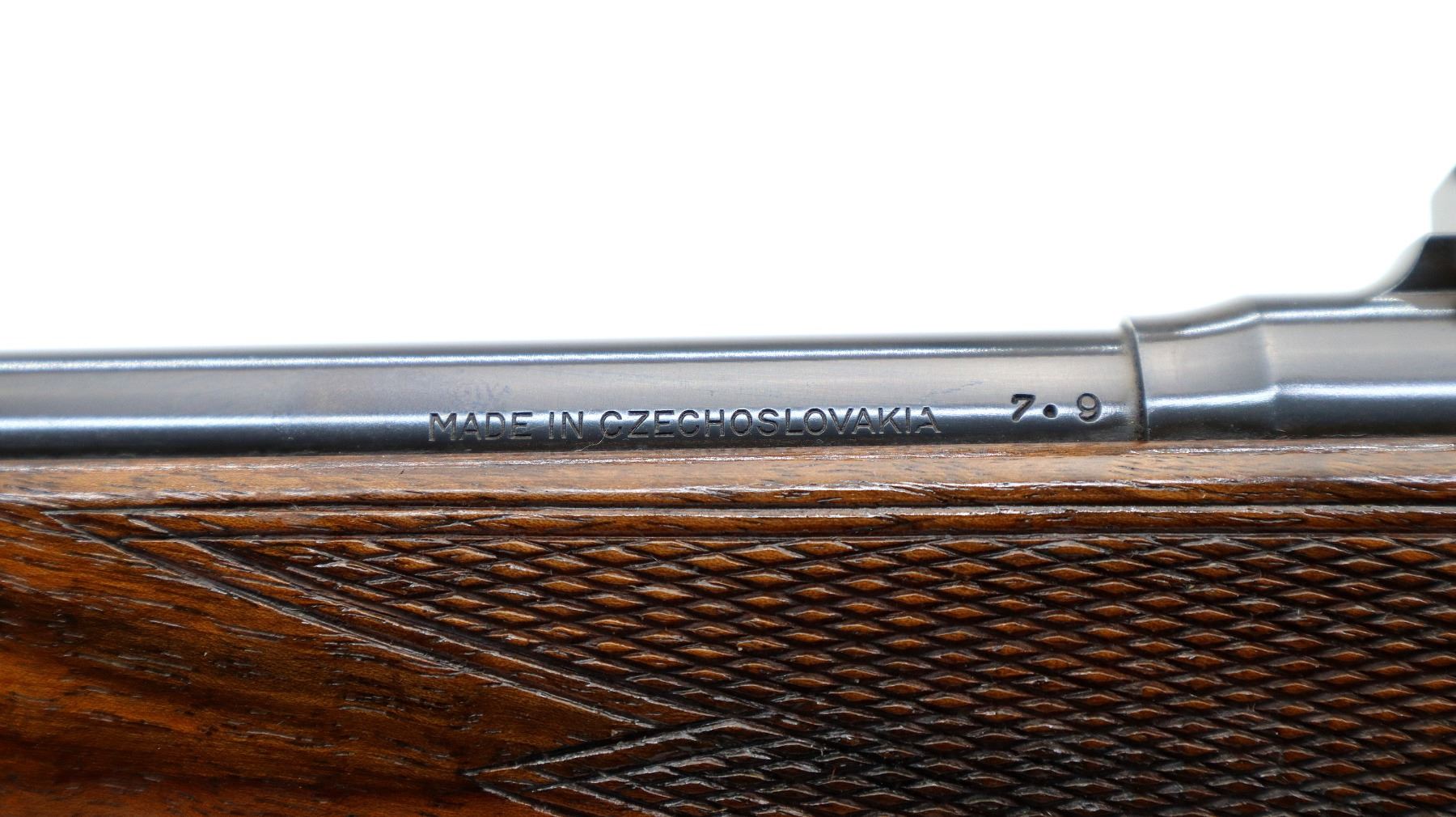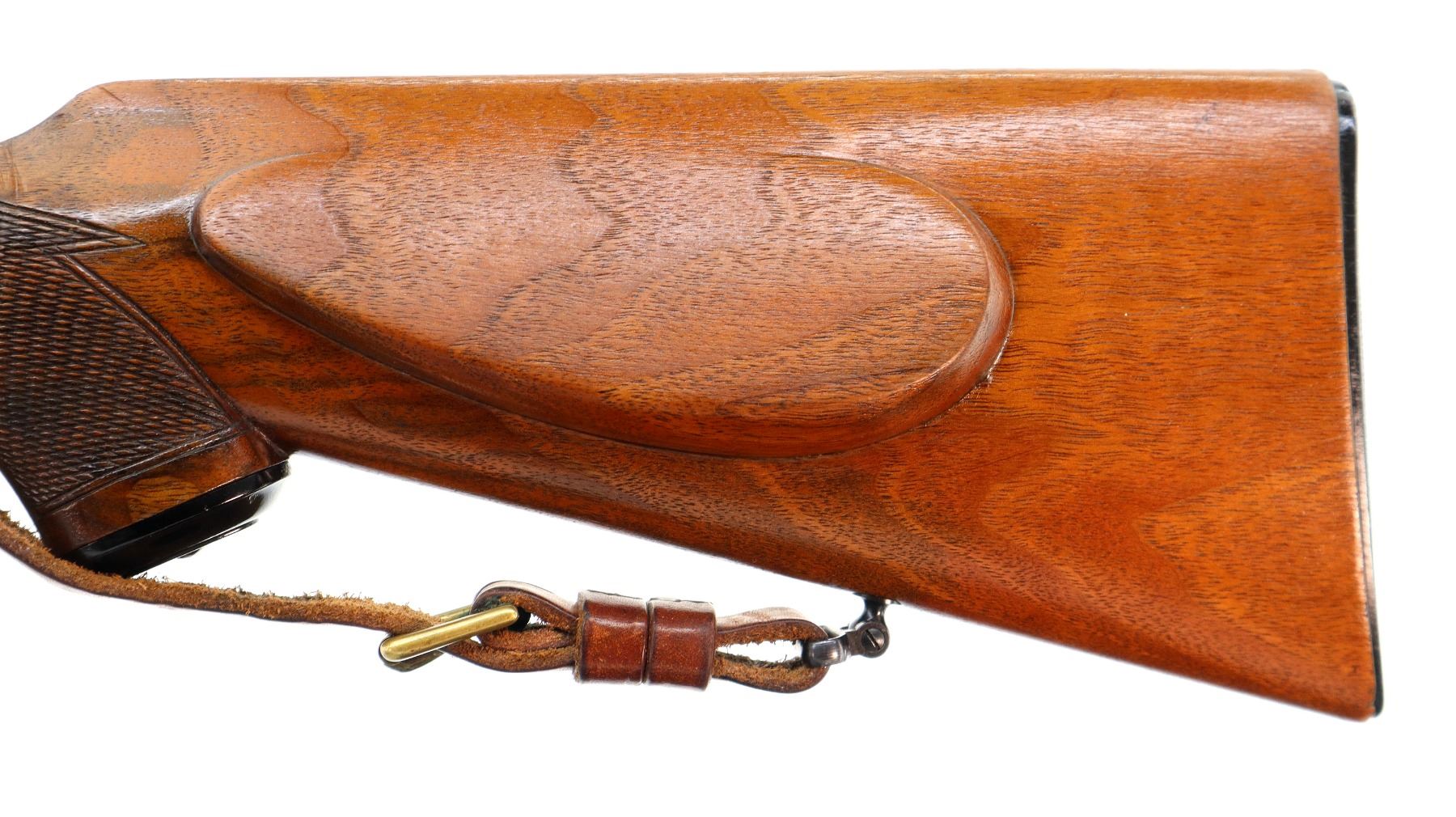 Main Description: Dated 1949. Blade front sight with ramp, adjustable u notched rear sight with one fixed and one folding leaf, polish blued finish, receiver has integral scope bases with Vintage rings and Zeiss fixed power scope numbered 3012130, clear optics with German NO1 reticle, butter knife bolt handle, double set triggers. One piece wood stock, checkered forearm, pistol grip and black polymer butt plate, European cheek rest, grip cap, swivels with brown leather sling.