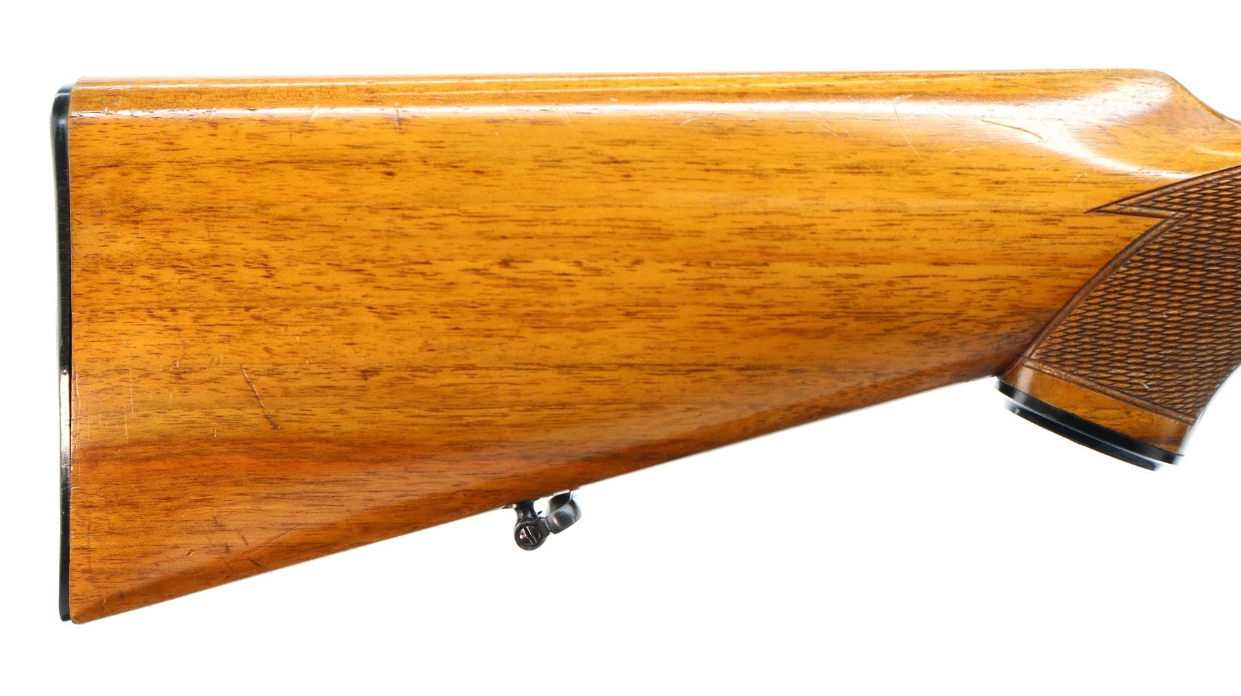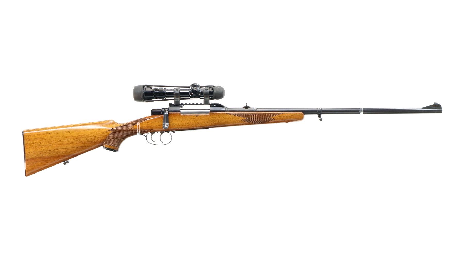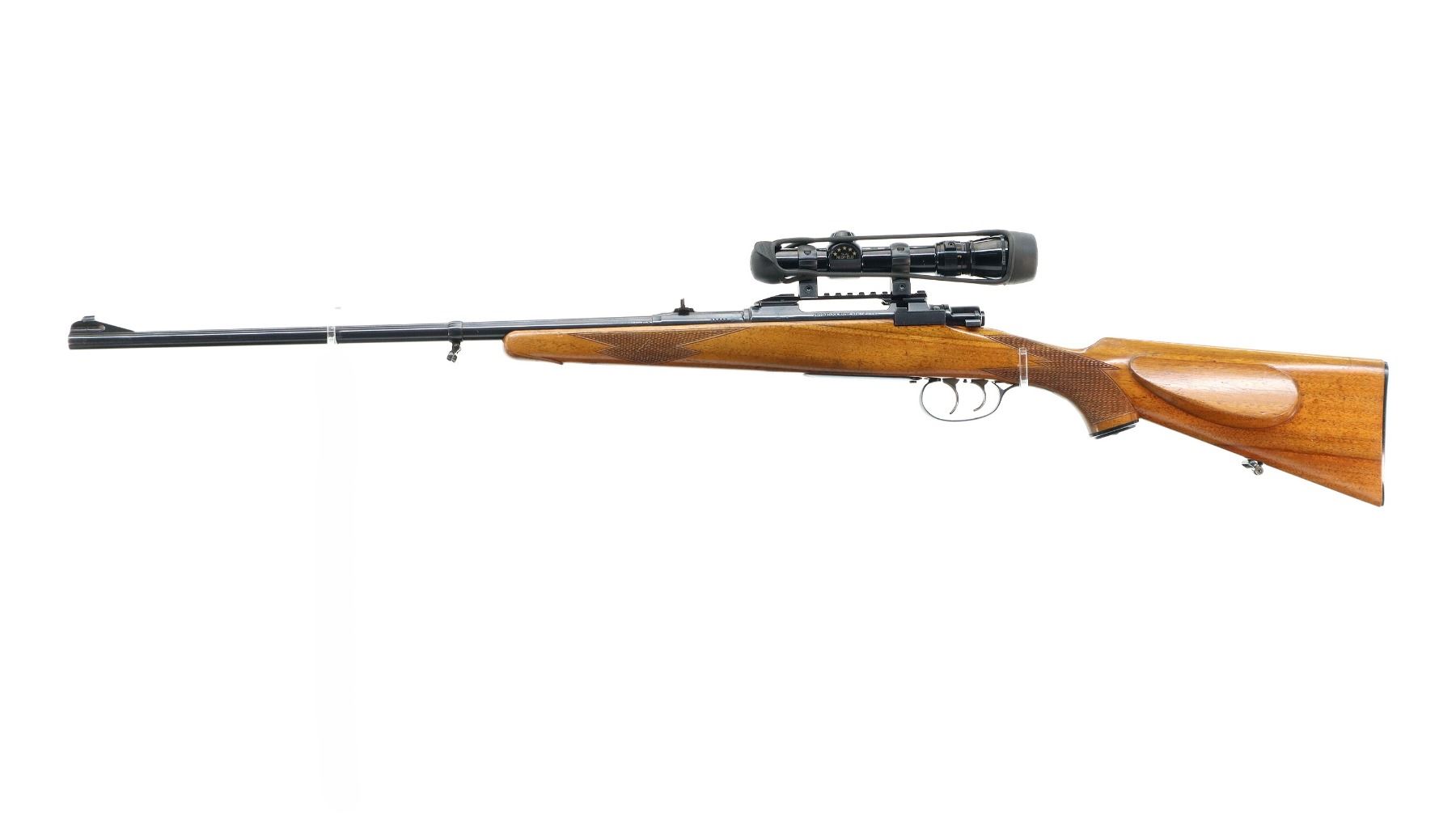 Main Description: Dated 1955. Blade front sight with ramp, adjustable u notched rear sight with one fixed and one folding leaf, polish blued finish, receiver has integral scope bases with one piece rail installed, Redfield 1-4X Scope installed, clear optics with duplex crosshair. Butter knife bolt handle, double set triggers. One piece wood stock, checkered forearm, pistol grip and black polymer butt plate, European cheek rest, grip cap, sling swivels.