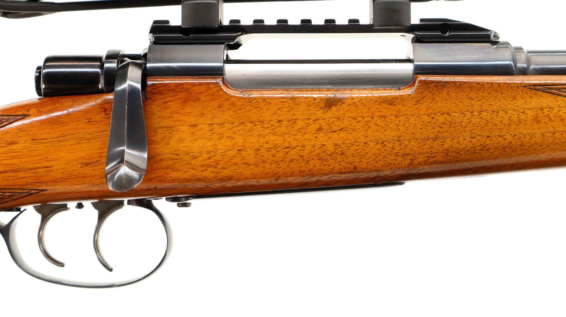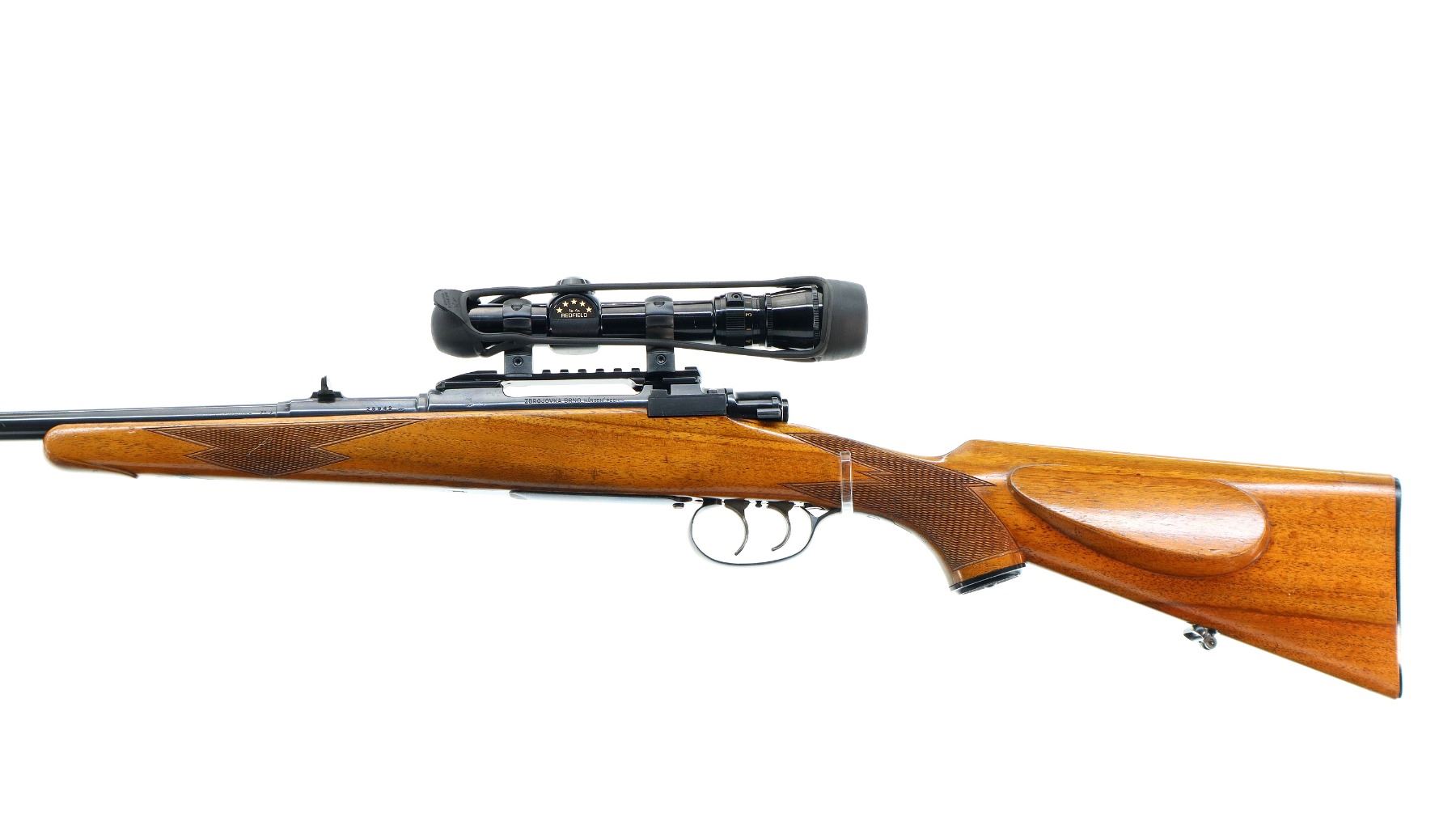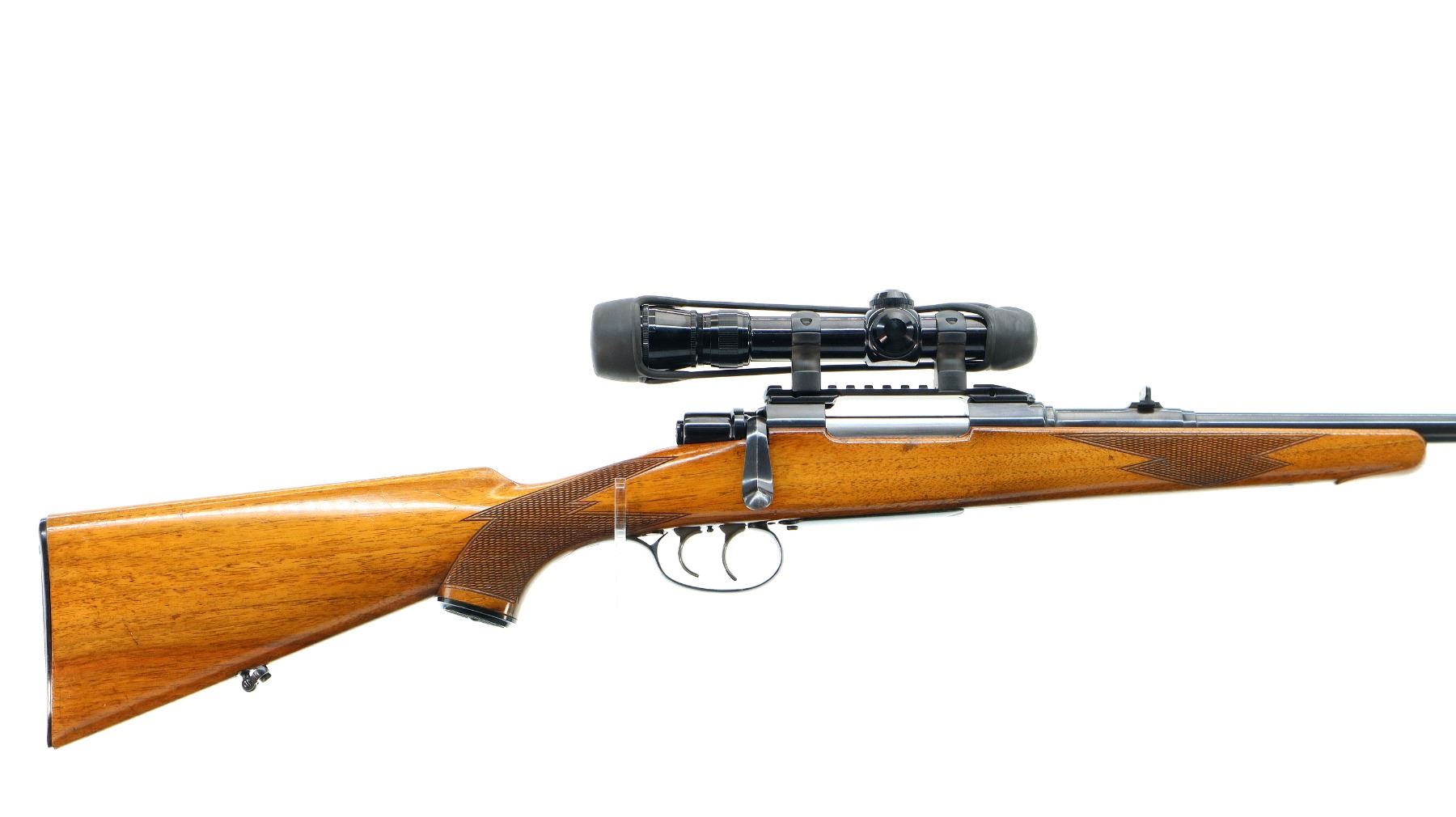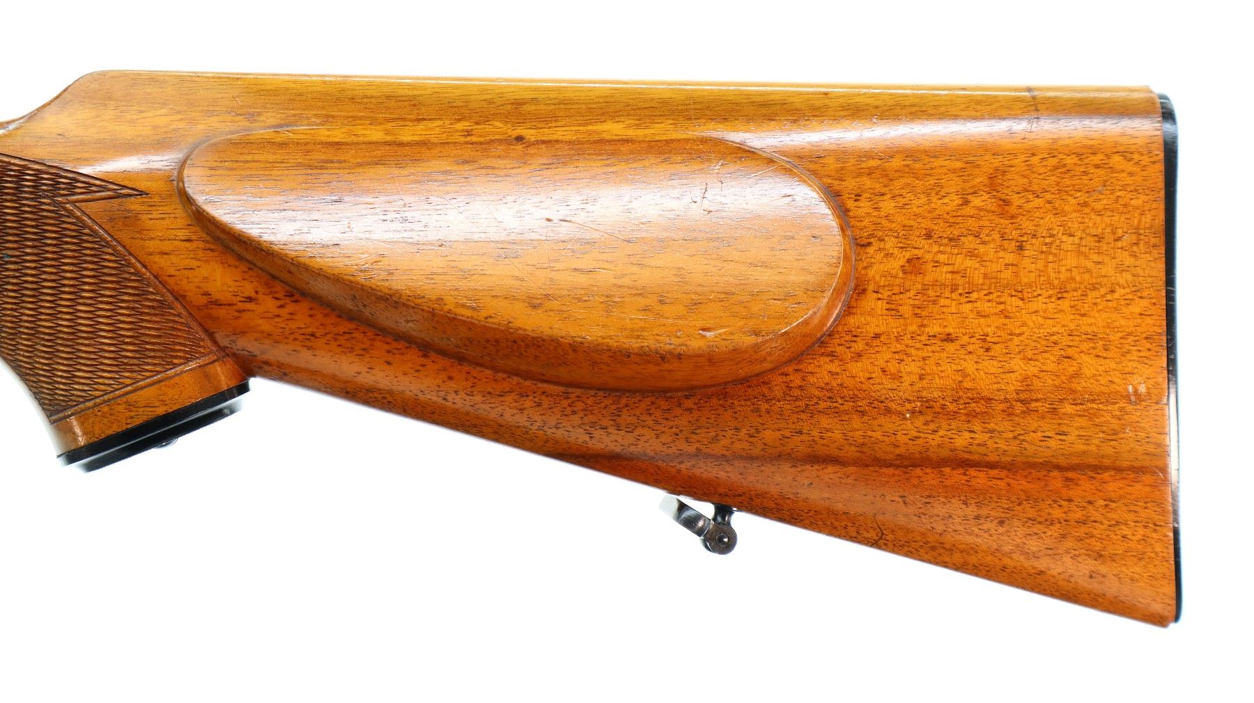 Main Description: Dated 1955. Blade front sight with ramp, adjustable u notched rear sight with one fixed and one folding leaf, polish blued finish, receiver has integral scope bases with one piece rail installed, Redfield 1-4X Scope installed, clear optics with duplex crosshair. Butter knife bolt handle, double set triggers. One piece wood stock, checkered forearm, pistol grip and black polymer butt plate, European cheek rest, grip cap, sling swivels.