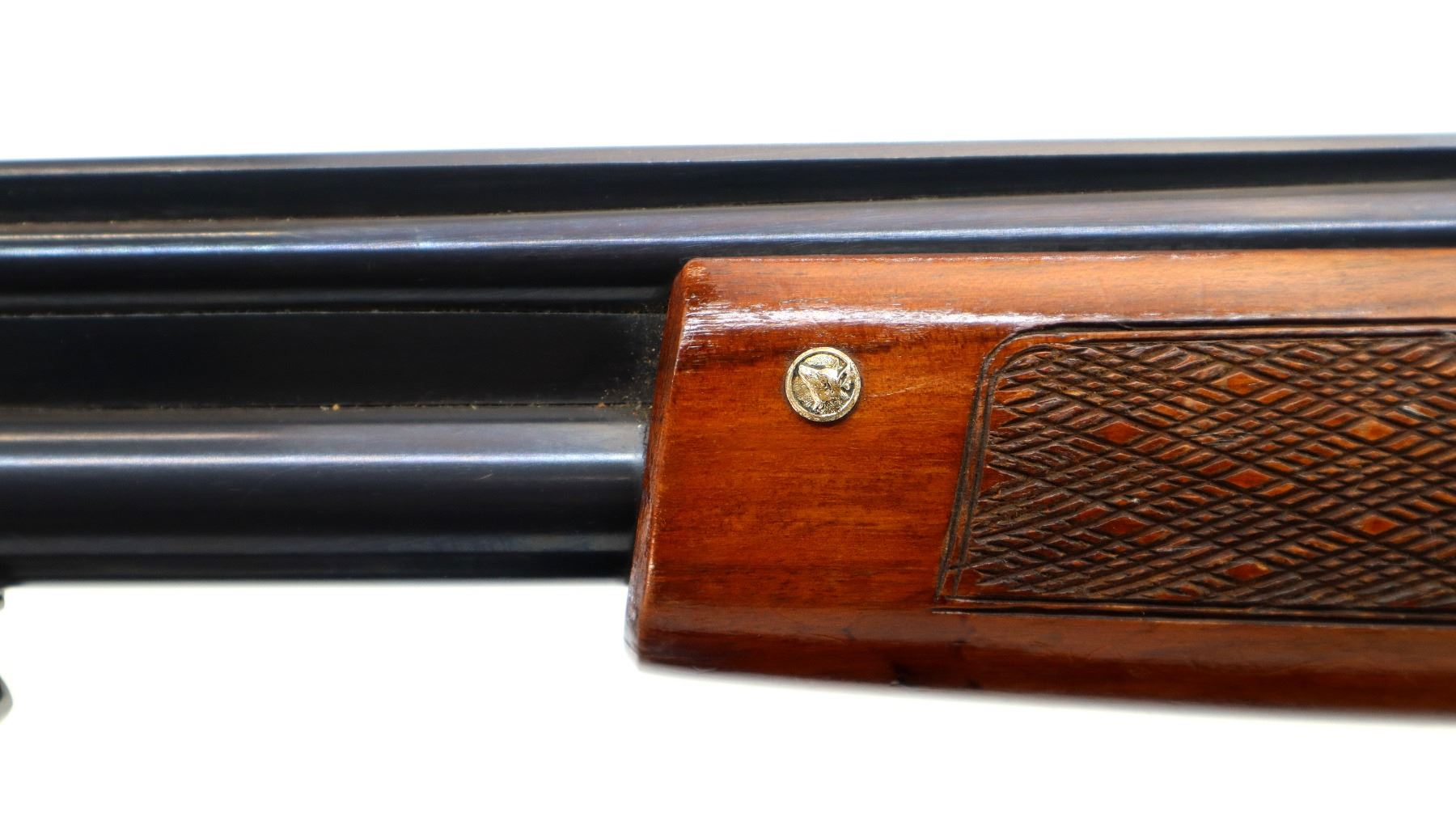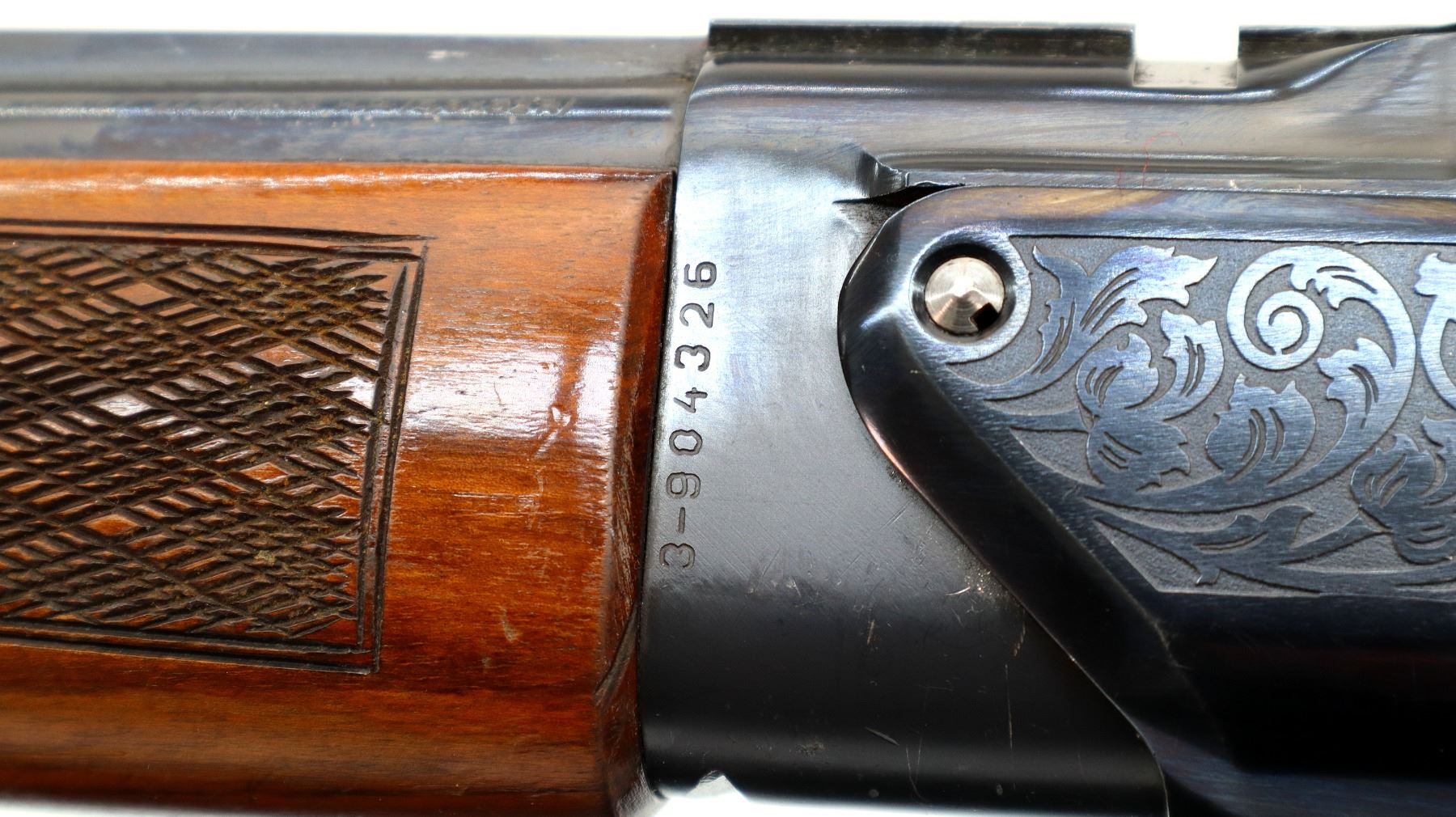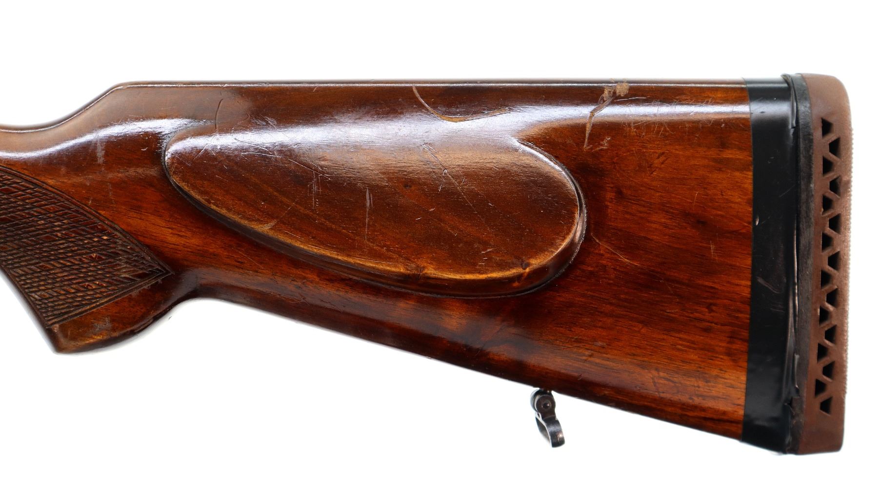 Main Description: Missing front sight, ramp present, adjustable u notched rear sight, blued finish, barrel has solid rib with integral scope base at rear, engraved receiver, automatic safety, extractor, double triggers. Two piece wood stocks, checkered forearm and pistol grip, stock is slightly loose, European cheek rest, brown vented rubber recoil pad wrapped with tape requires fitting. Sling swivels.