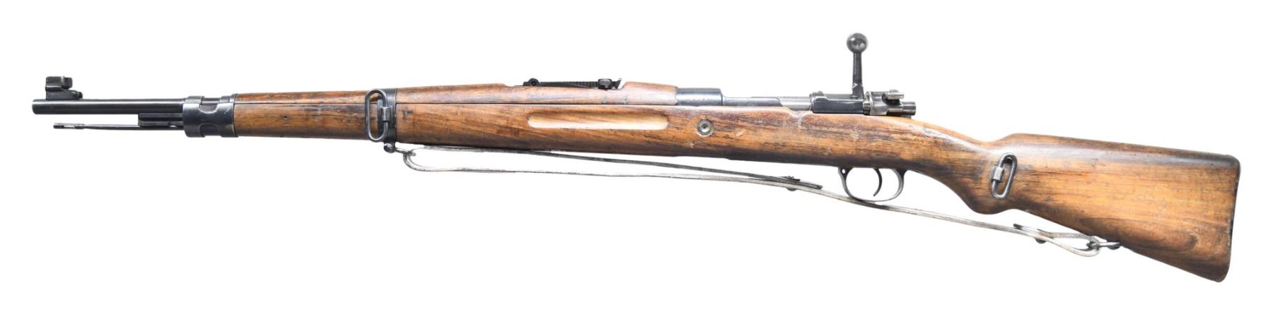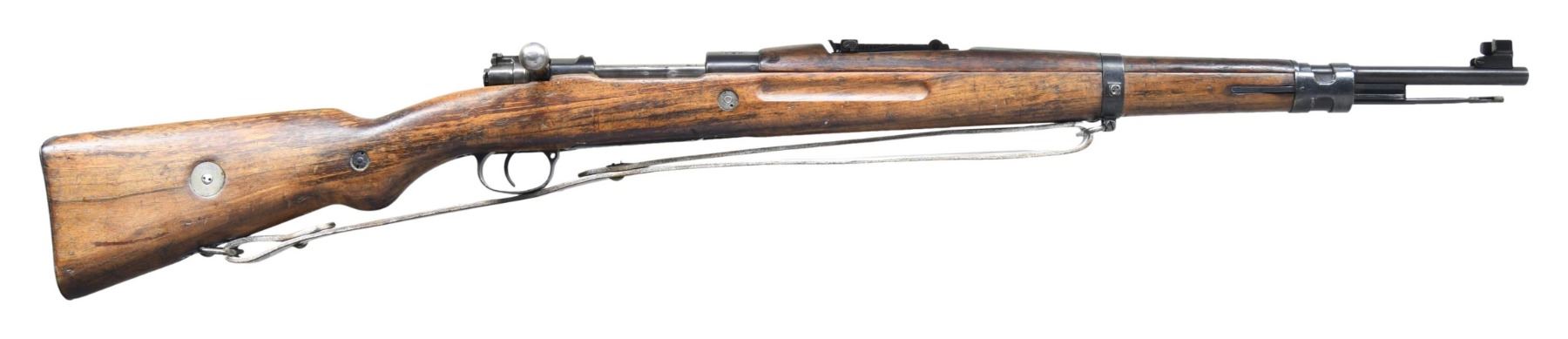 Cal. 8mm Mauser. S# 8227Y4. Bbl. 23 1/4" with Century import marking. Blade front sight with protective ears. Tangent rear sight graduated to 2000m. Mismatched numbers throughout with Romanian contract bolt. Receiver top has fully intact Czech lion crest. Left side of receiver has 1938 Czech acceptance stamp. Arsenal rework type blue finish. European hardwood stock set with both bottom & left side sling swivels. Leather sling present that shows overall white staining. Cleaning rod also present. CONDITION: lightly sanded stock set with added oil finish, a crack behind upper tang, a couple handguard cracks, scattered white staining, dings & handling marks. Bolt appears cleaned with some oxidation, light pitting & dings. Balance of metal retains 90% arsenal rework type blue with some pitting beneath the finish, white staining on bottom metal, edge wear, oxidation & handling marks. Action functions properly when hand cycled. Good bore with scattered frosting but strong rifling. (25-2193/MJC). CURIO. $300-500.