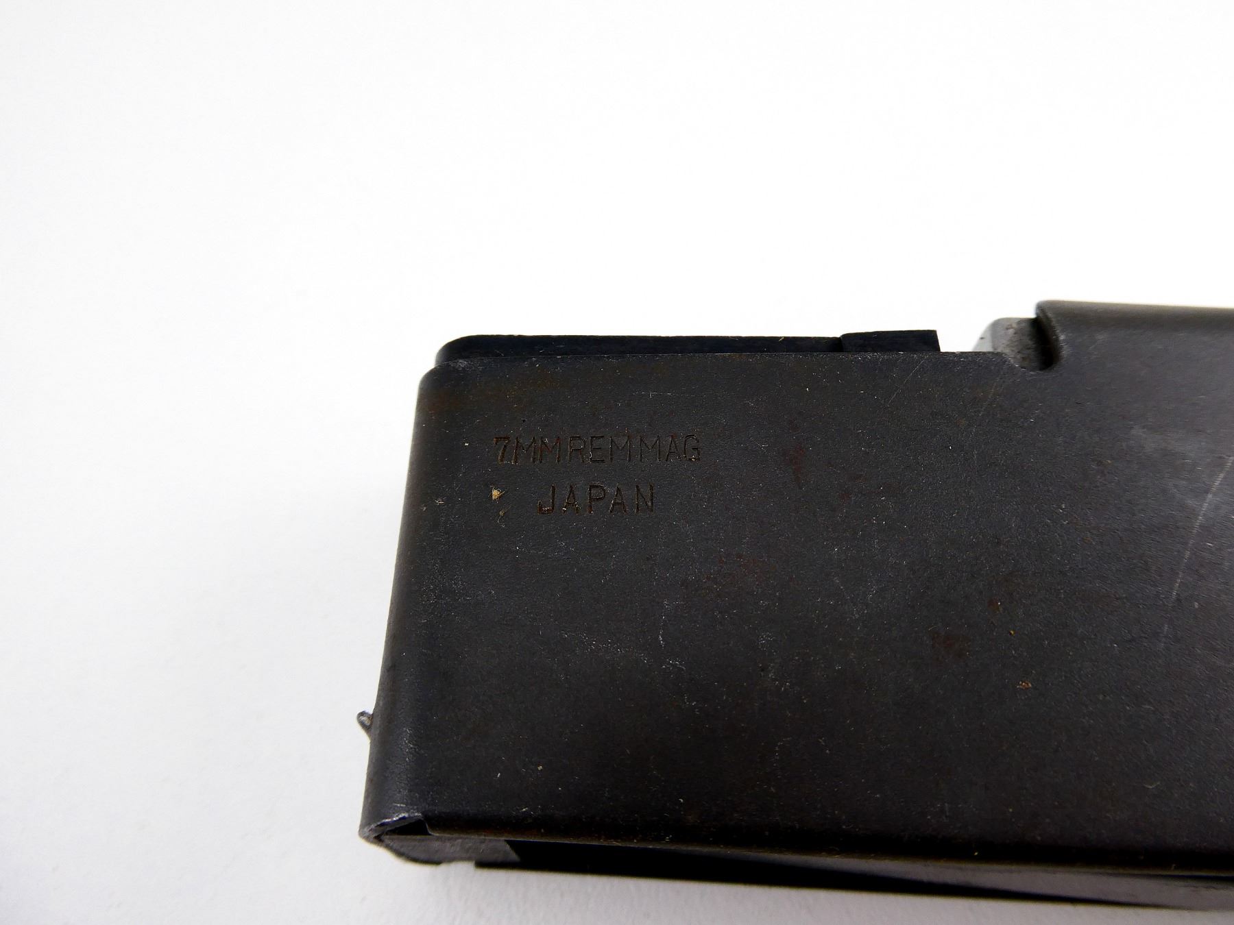 (1) 7MM REM MAG MAGAZINE, 3 RNDS, BLUED STEEL CONSTRUCTION, MARKED: "7MMREMMAG, JAPAN". SEE PHOTOS. PAL REQUIRED.