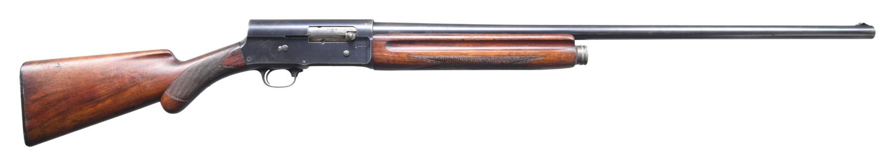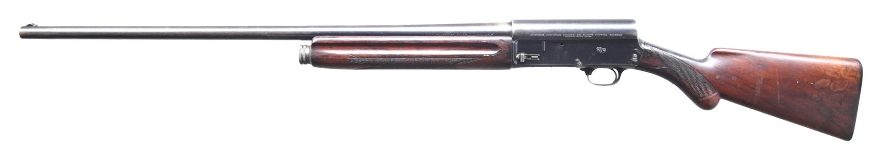 SHOTGUN. Cal. 12 GA. S# 143609. Bbl. 29 1/2" plain of Special Steel. Fixed Full choke. Ramp style front sight is missing bead. Recoil operated action with sliding front safety. Blue finish. Finger groove walnut forearm and rnd. knob walnut stock with hand checkering and original buttplate. CONDITION: 70% dull blue showing areas of wear with scattered spots of corrosion. Stocks have age darkened worn appearance with numerous scratches and marks. Forearm has large cracks on both mag. cap and action ends. Stock has cracks extending from both sides of the receiver and near the toe. Pitted bore. (25-3337/DS). CURIO. $200-400.