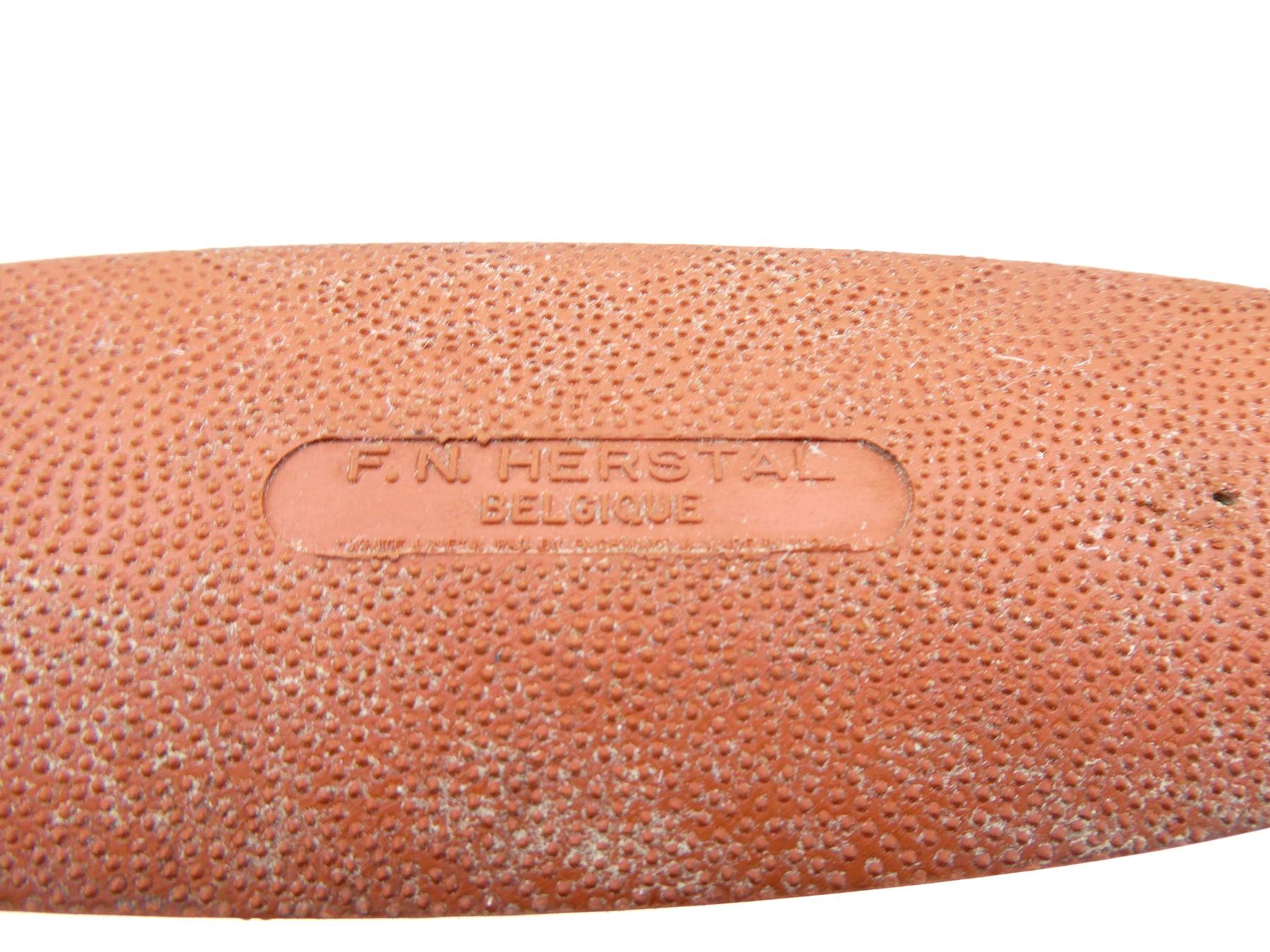 (1) WOODEN CONSTRUCTION, CHECKERED, UNMARKED, WITH F.N. HERSTAL RECOIL PAD, OVERALL LENGTH APPROX. 13.25". MAY REQUIRE FITTING. SEE PHOTOS.