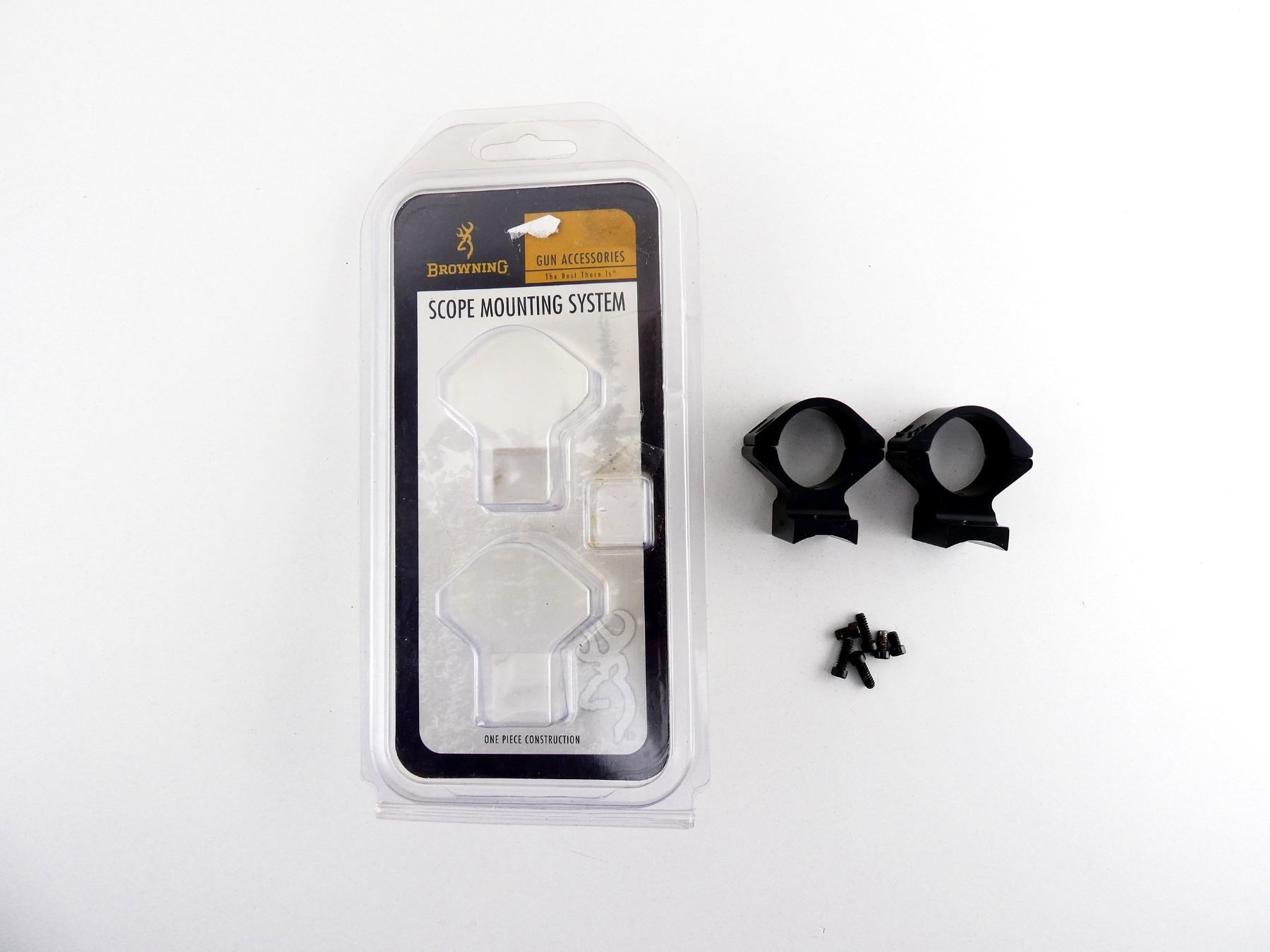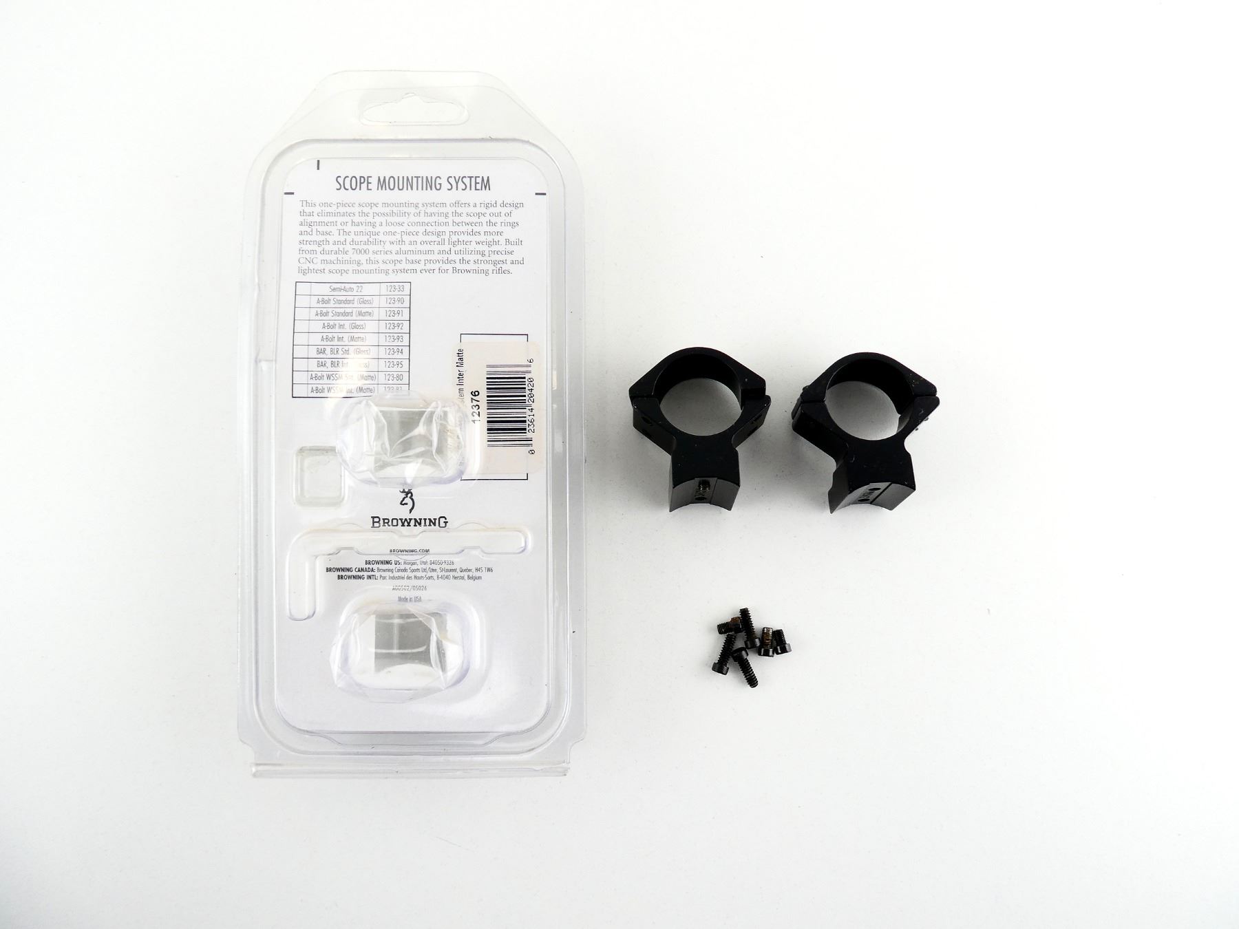 (1) SET OF 1" SCOPE RINGS / ONE-PIECE MOUNTING SYSTEM, MATTE BLACK ALLOY CONSTRUCTION, INTERMEDIATE, PART #: 123-76, APPEARS NEW OLD STOCK IN ORIGINAL PACKAGING, PACKAGE MAY NOT BE COMPLETE. MAY REQUIRE FITTING. SEE PHOTOS.