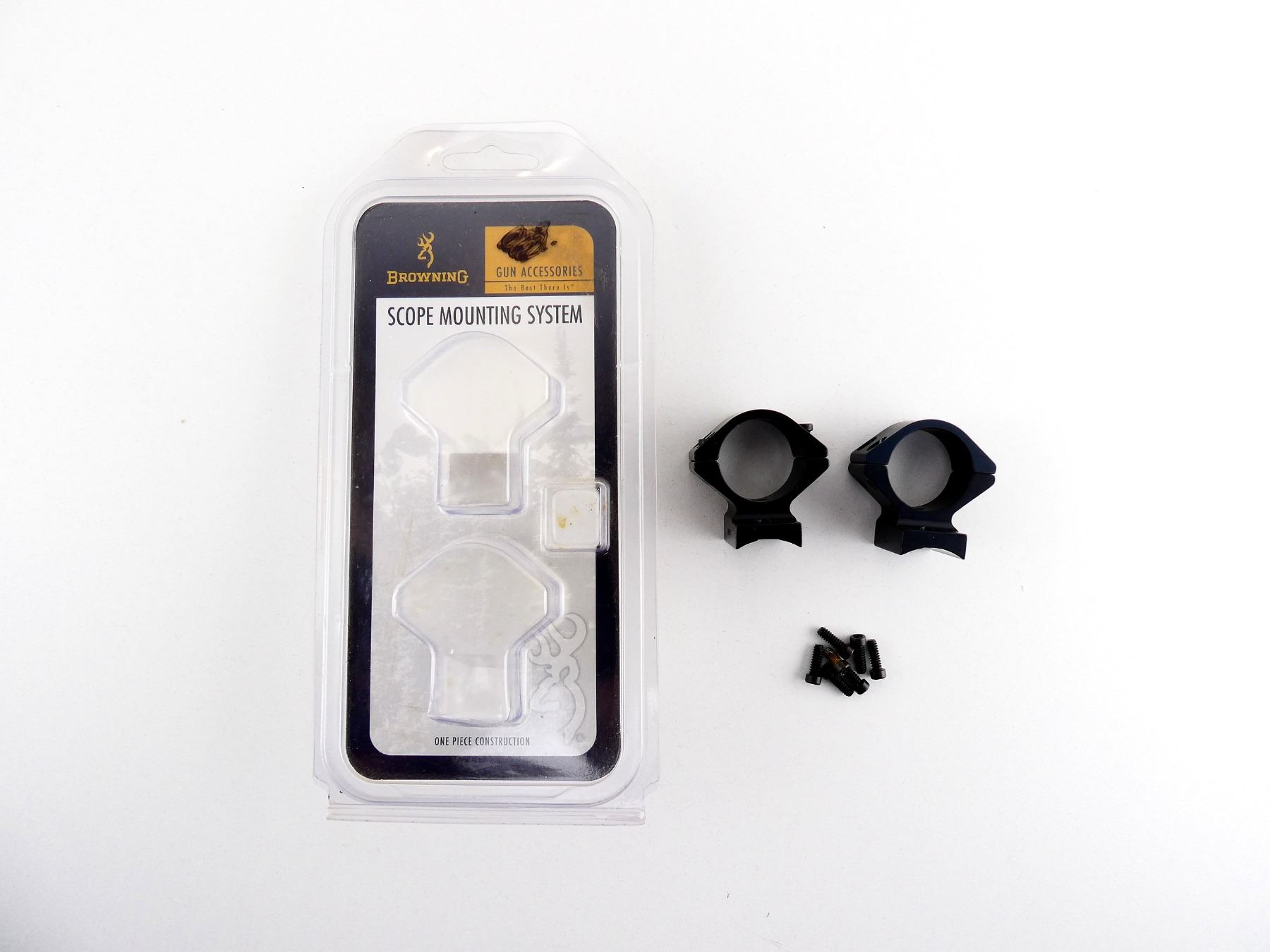 (1) SET OF 1" SCOPE RINGS / ONE-PIECE MOUNTING SYSTEM, MATTE BLACK ALLOY CONSTRUCTION, STANDARD, PART #: 123-77, IN ORIGINAL PACKAGING, PACKAGE MAY NOT BE COMPLETE. MAY REQUIRE FITTING. SEE PHOTOS.