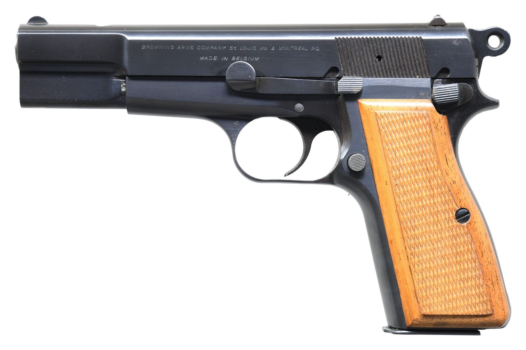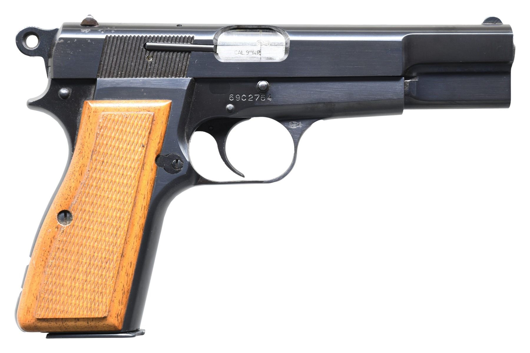Cal. 9MM Luger. S# 69C2764. Bbl. 4 5/8" with Belgian proof; marked "9m/mP." Mfg. 1969 in Belgium with Browning Arms Company marking on left side of slide. Has external extractor and ring hammer; 1962-1970. "C" in serial numbers used 1969-1977; this variation made only 1969 and 1970. Blued finish with fixed sights; windage drift adjustable rear. Light colored European walnut grips having raised checkered panels and orange colored backs. MAGS: 1 factory 13 rd. with push button base and black plastic follower. CONDITION: all aspects near excellent with new, unfired appearance.(25-3266/NW). CURIO. $900-1,400.