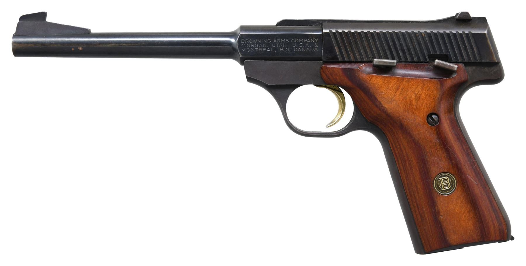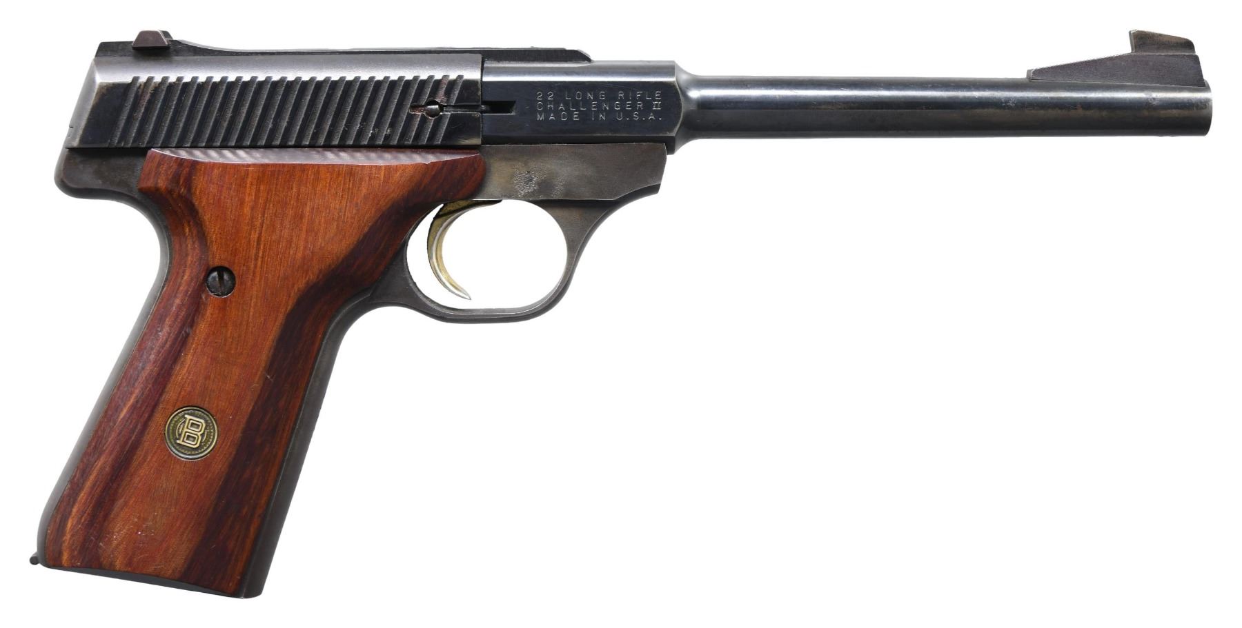 Cal. 22 LR. S# 655RP04706. Bbl. 6 3/4". Challenger II semi-automatic pistol mfg. by Browning. Left side of the bbl. is marked with Browning's mfg. information, with the model and cal. designations marked on the right. Metal components exhibit a blue finish overall, save for on the trigger, which exhibits a gold plated finish. Frame is mounted with 2-piece Browning medallion plain wood grips. Ramped blade front sight, with dovetailed square notch rear sight. MAGS: 1 10-rd. CONDITION: metal components retain large amounts of their original factory blue finish, exhibiting areas of wear and thinning that show through to gray and brown patinas, with scattered spots/areas of light to mild surface oxidation present overall. Right side of frame exhibits a concentrated area of moderate pitting. Mirror bore, retaining strong rifling throughout. Grips show scattered superficial marks from handling and storage, but otherwise remain sturdy and serviceable. (25-2357/MLW). MODERN. $300-400.