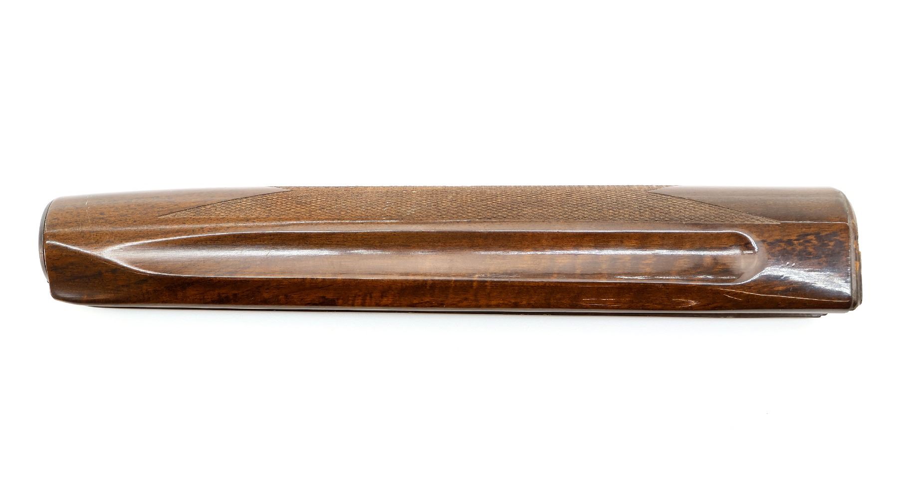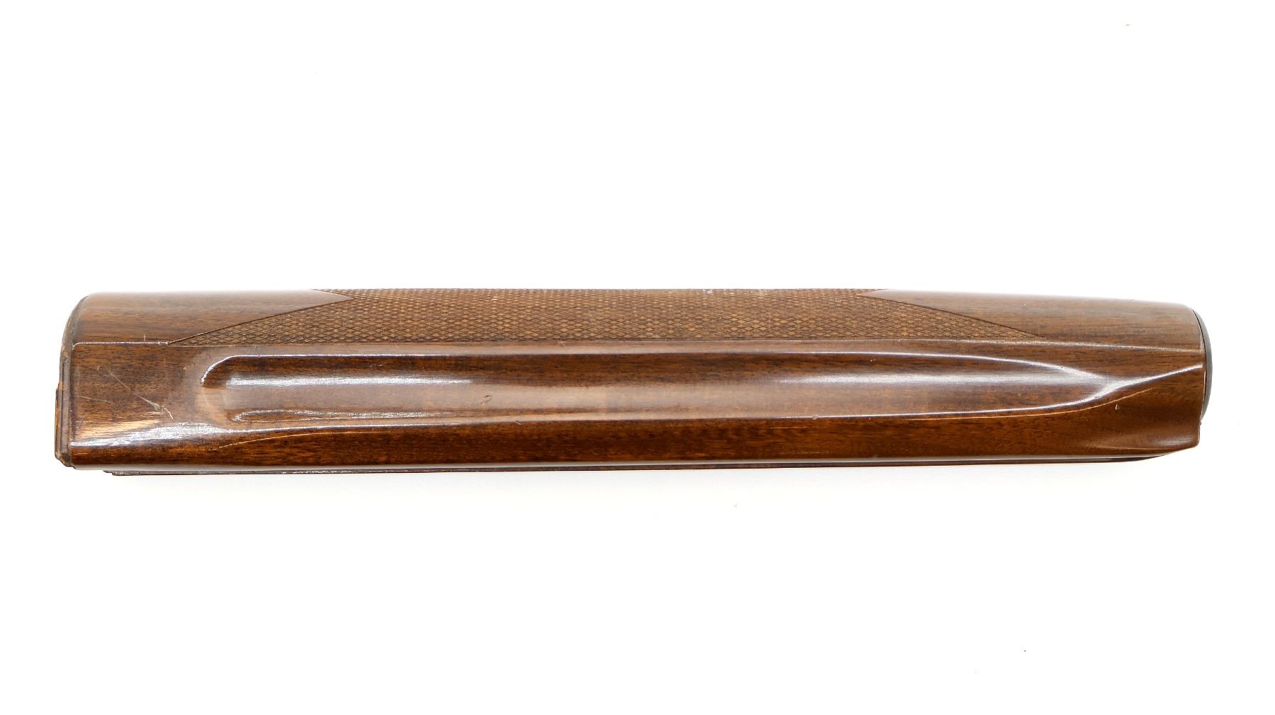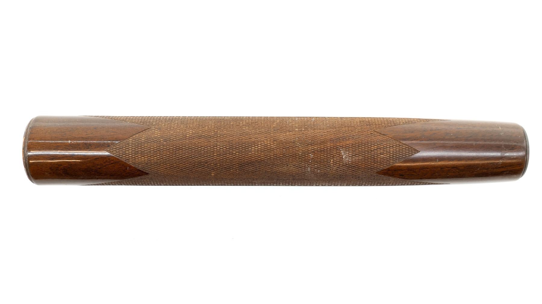 (1) WOODEN FOREND, CHECKERED, UNMARKED, MAY HAVE SMALL CRACKS & CHIPS, OVERALL LENGTH APPROX. 13". MAY REQUIRE FITTING. SEE PHOTOS.