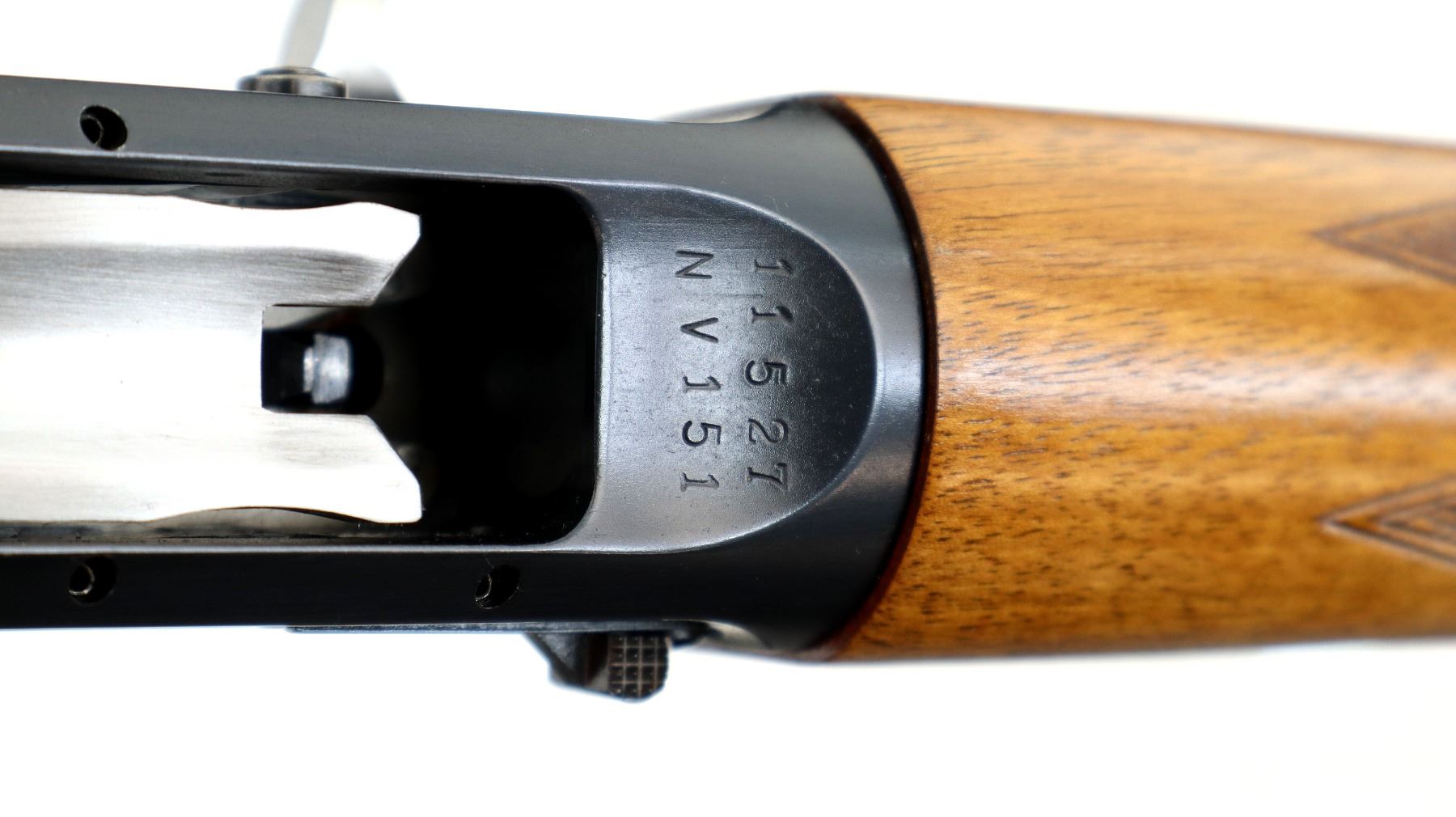 Main Description: Blade front sight with ramp, adjustable u notched rear sight, polish blued finish, round barrel, engraved receiver. Two piece Satin finish wood stocks, finger grooved checkered forearm and pistol grip, brown vented rubber recoil pad