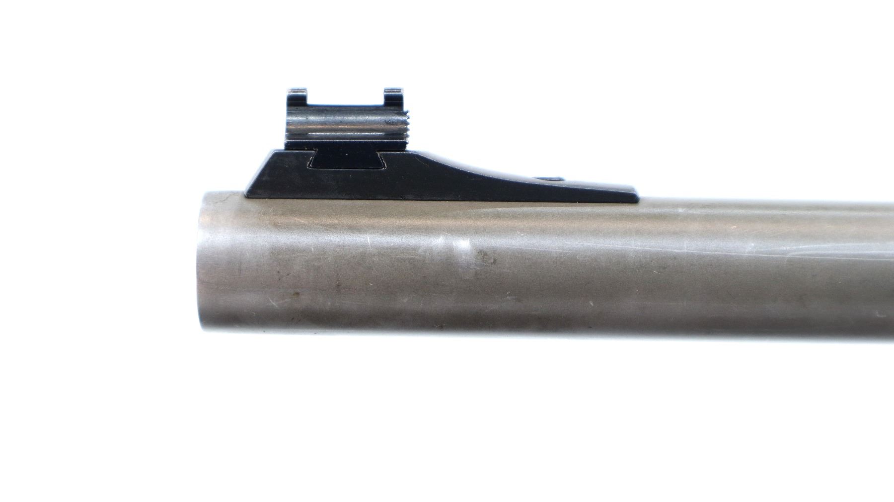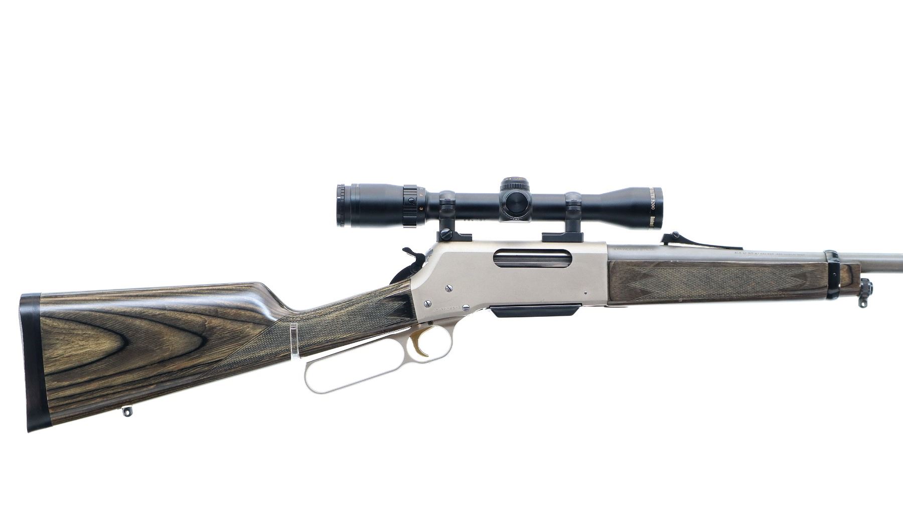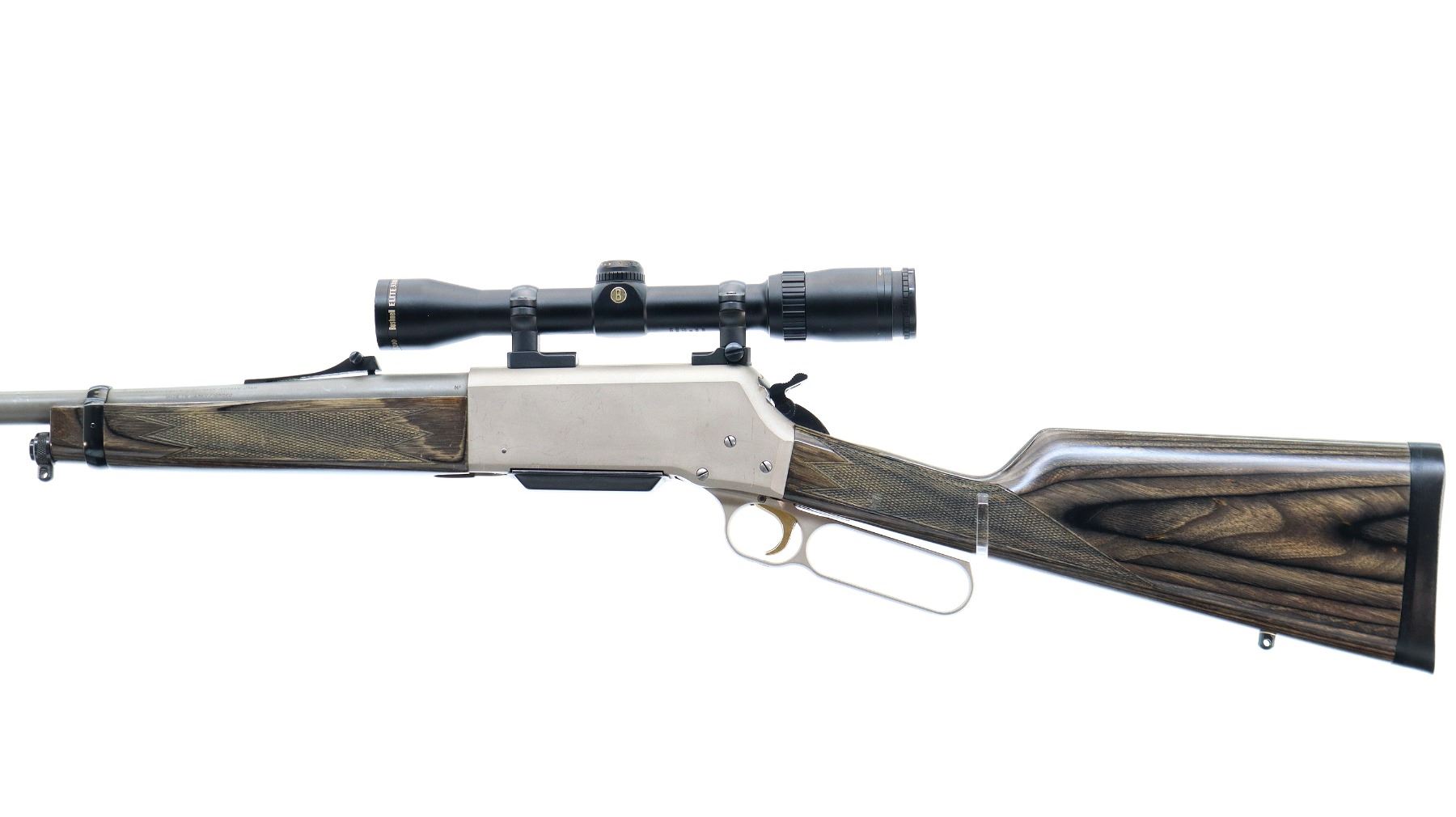 Main Description: Blade front sight missing fiber optic insert, has the ramp, has adjustable u notched rear sight, matte stainless barrel, silver alloy receiver with Bushnell Elite 3200 2-7x32 scope installed, clear optics with duplex crosshair. Grooved spur hammer and gold trigger. Two piece grey laminate wood stocks, checkered forearm and straight grip, black rubber recoil pad, swivel studs, small chip behind rear one.