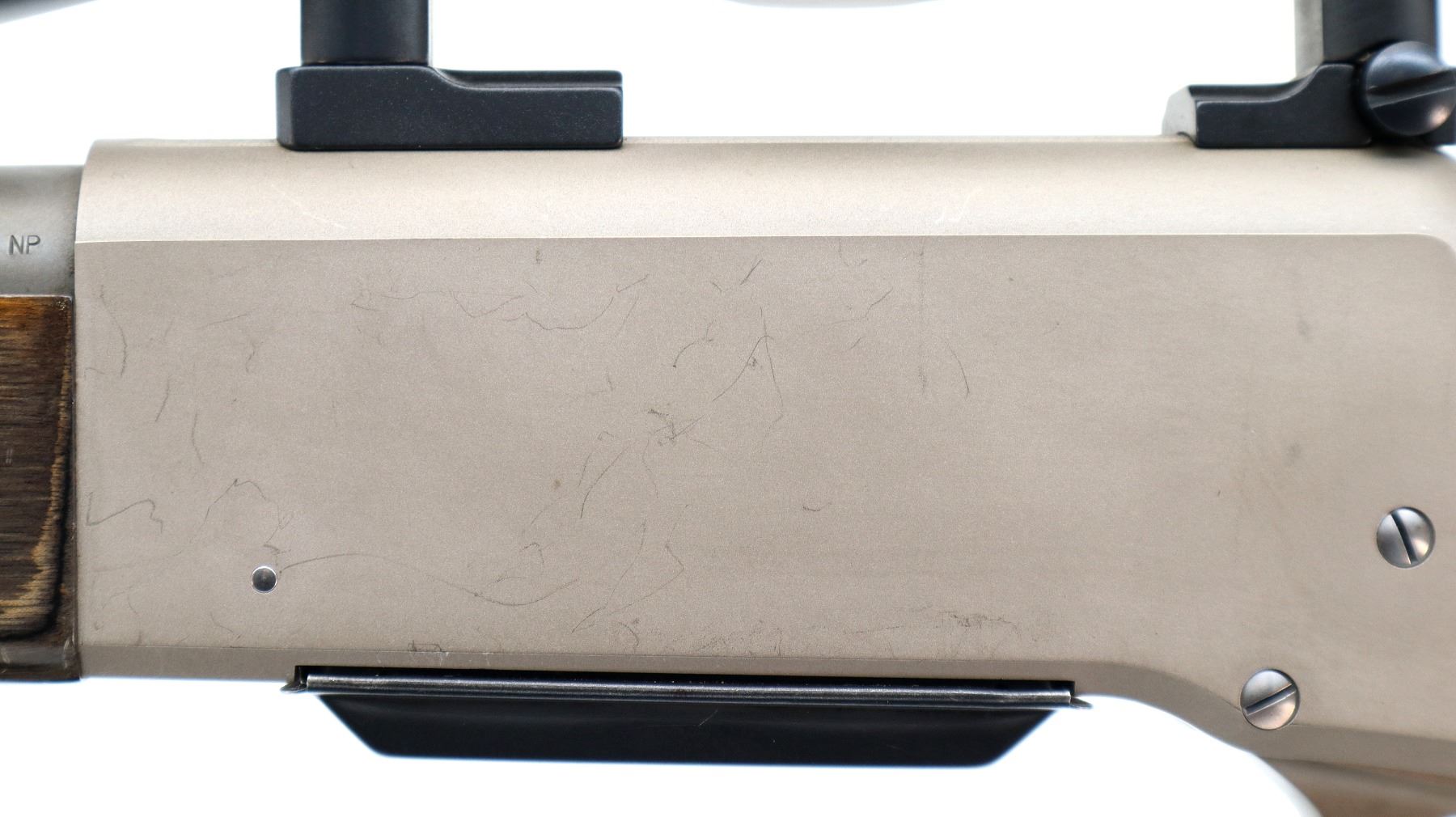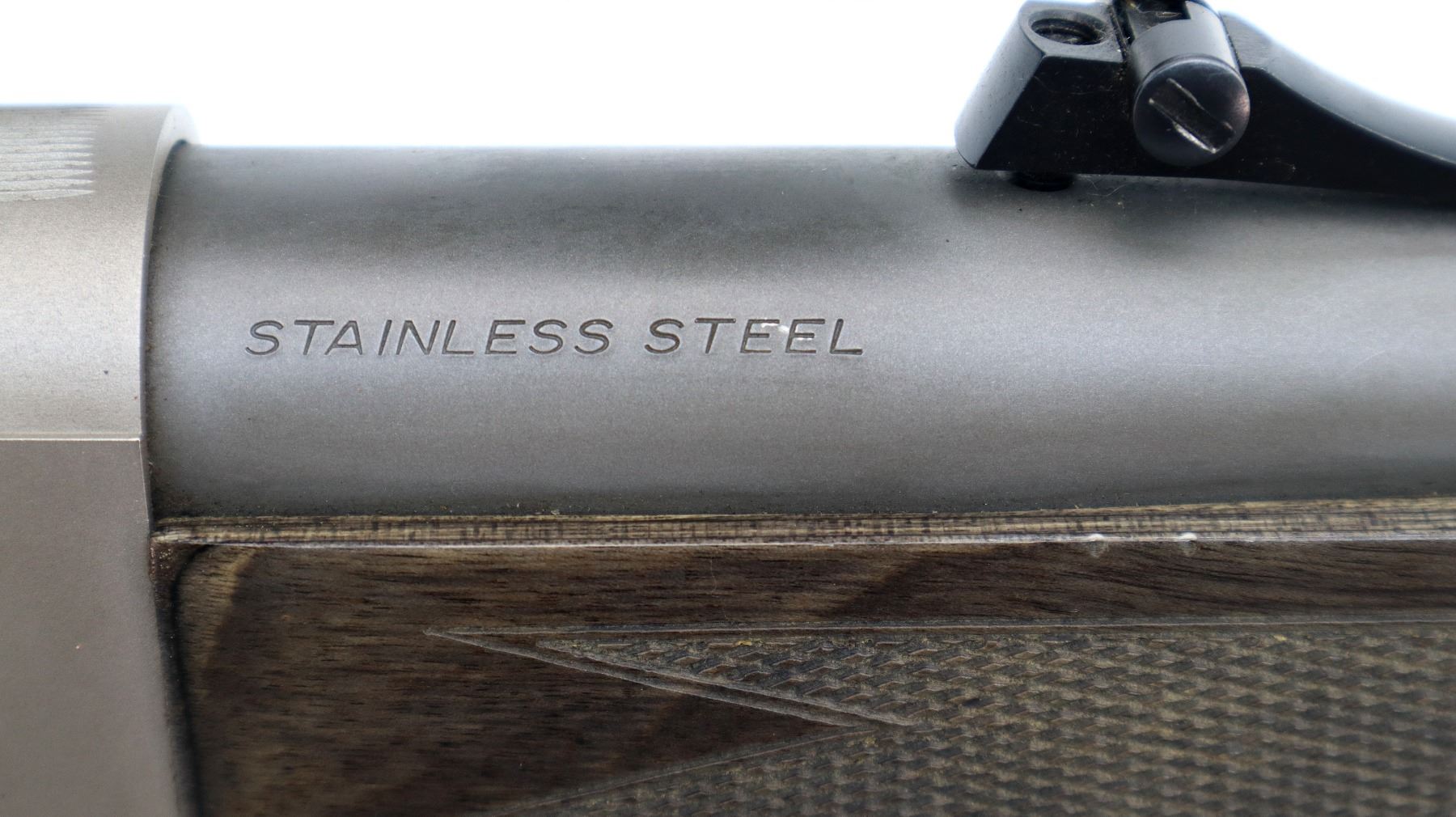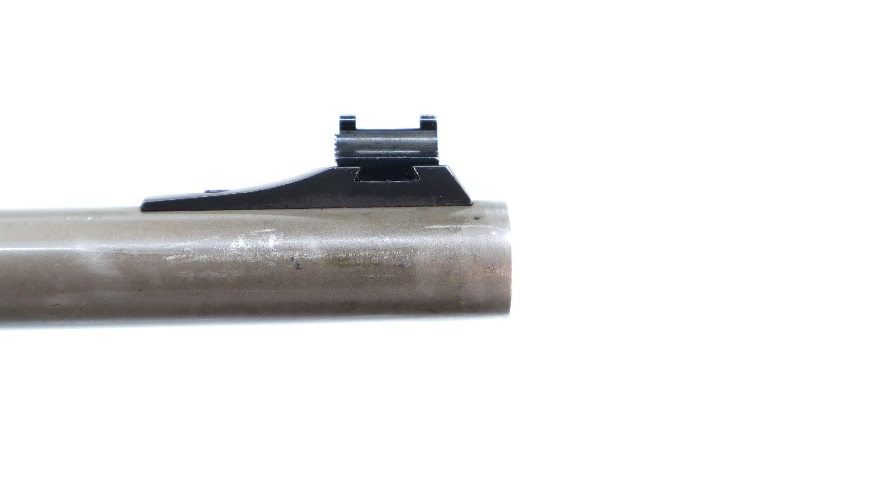 Main Description: Blade front sight missing fiber optic insert, has the ramp, has adjustable u notched rear sight, matte stainless barrel, silver alloy receiver with Bushnell Elite 3200 2-7x32 scope installed, clear optics with duplex crosshair. Grooved spur hammer and gold trigger. Two piece grey laminate wood stocks, checkered forearm and straight grip, black rubber recoil pad, swivel studs, small chip behind rear one.