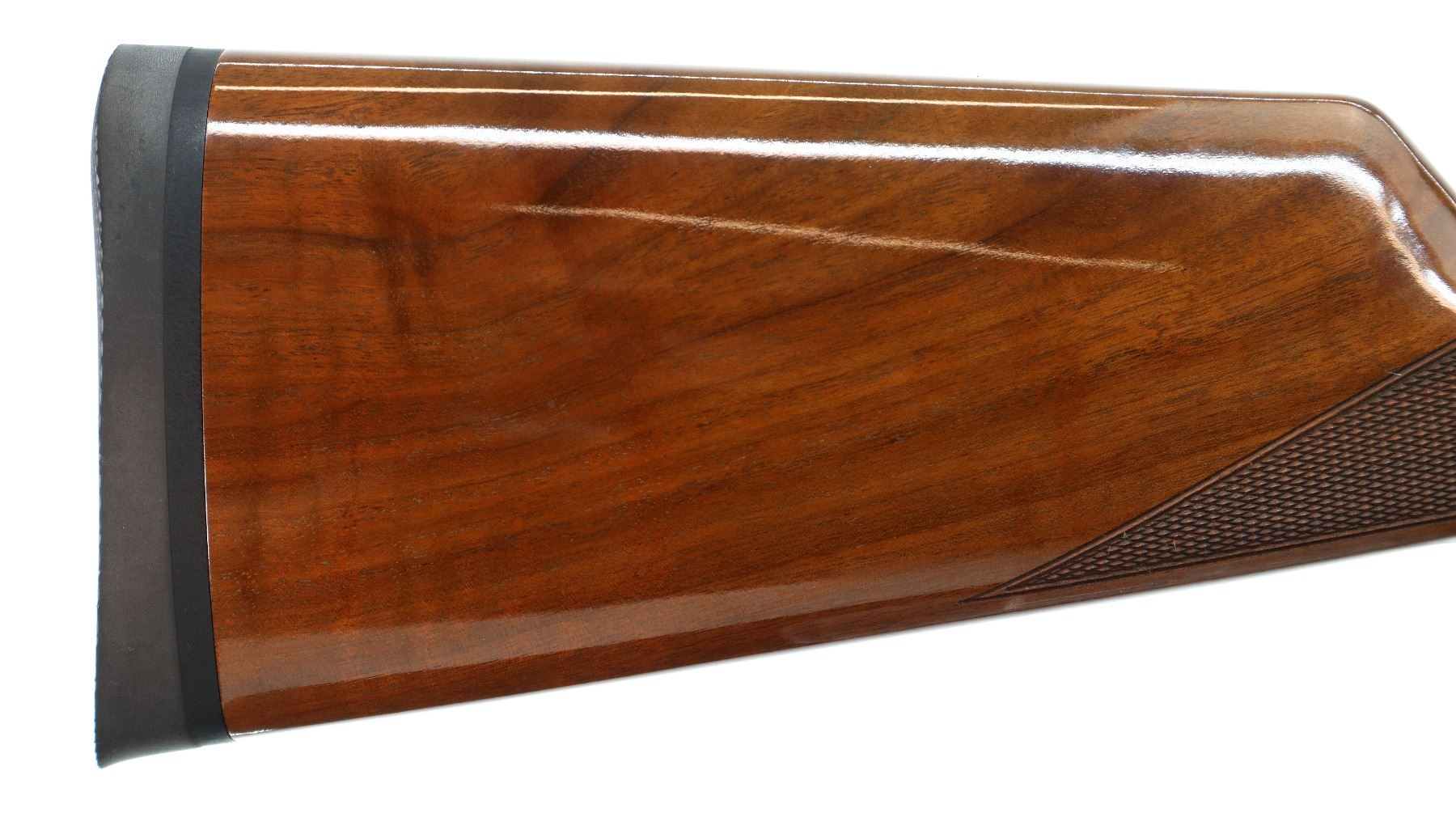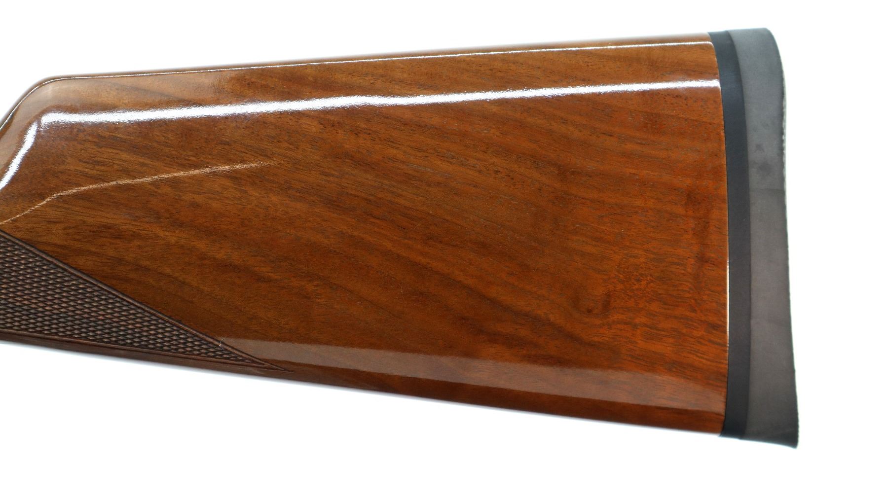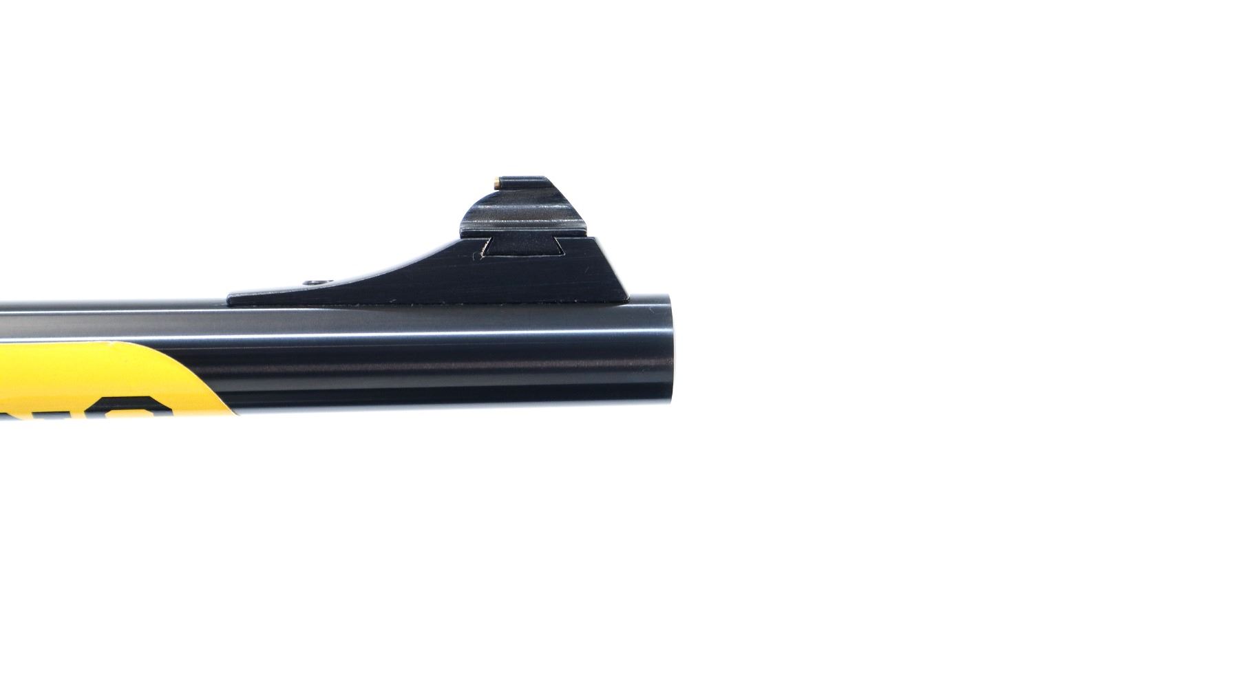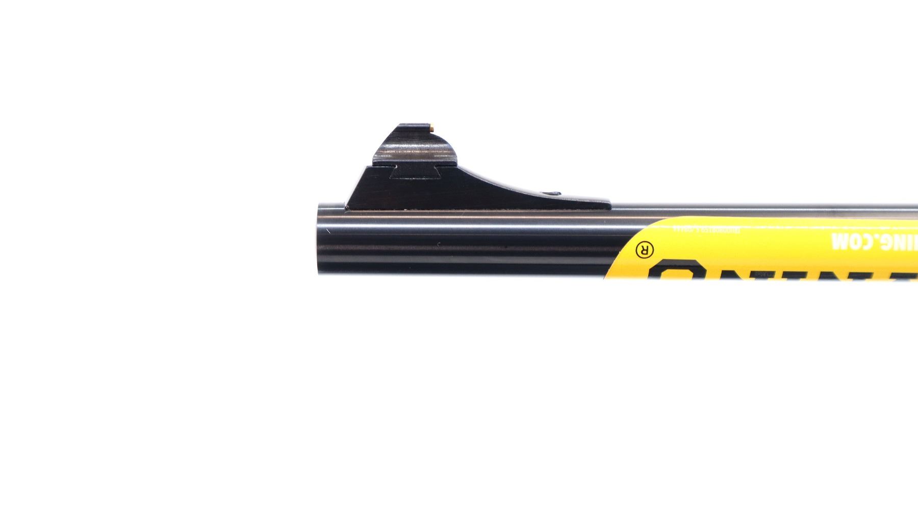 Main Description: Blade front sight with ramp, adjustable u notched rear sight, polish blued barrel, black alloy receiver drilled and tapped with plug screws installed, grooved spur hammer and gold trigger. Two piece gloss finish wood stocks, checkered forearm and straight grip, black rubber recoil pad, retains factory hang tag