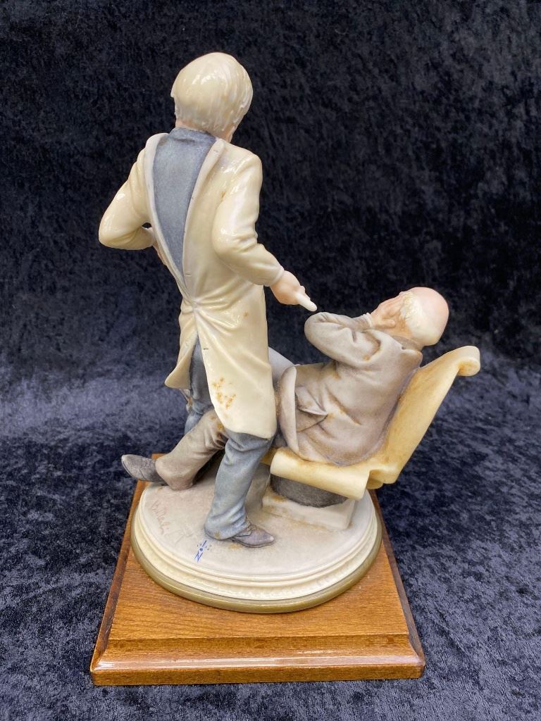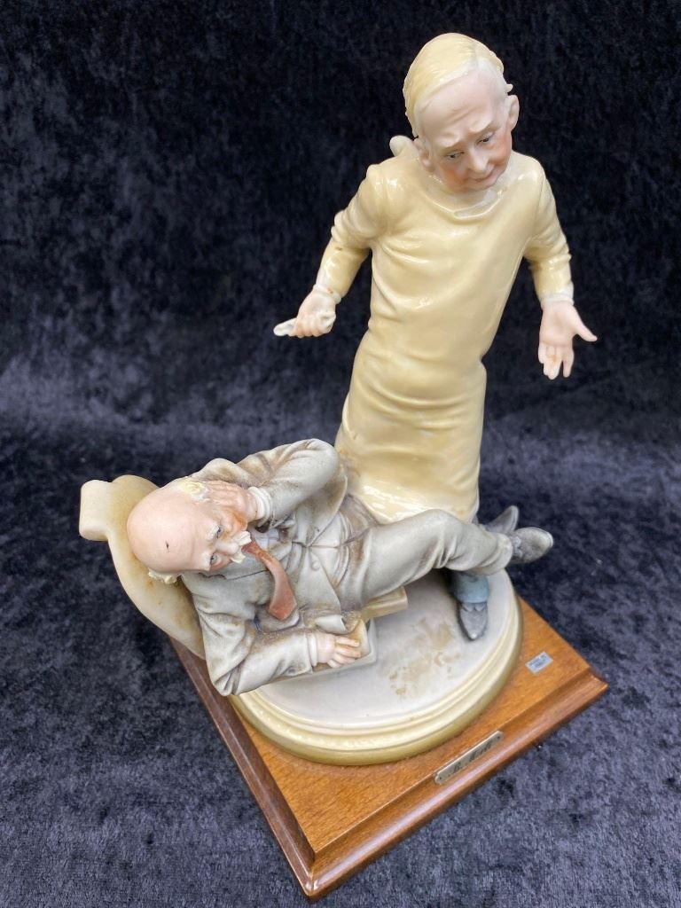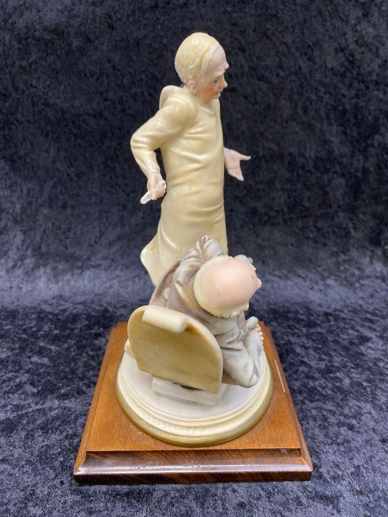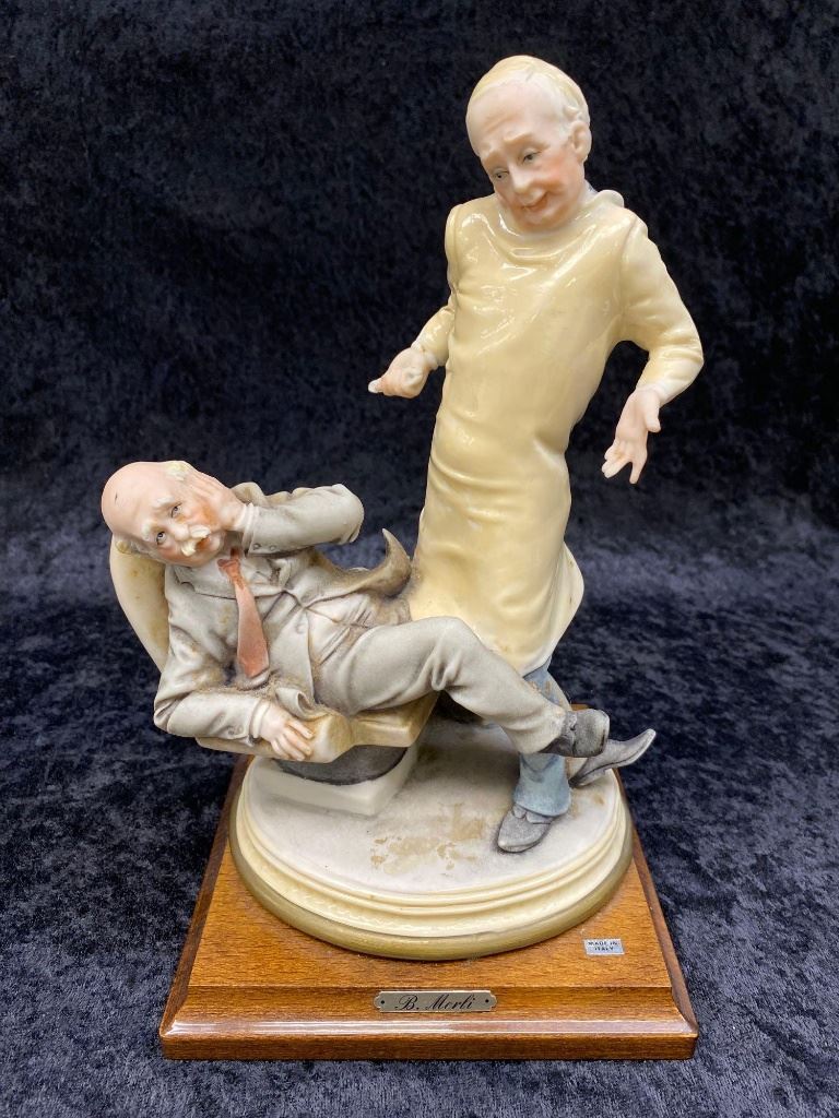 Italian Bruno Merli Capidomonte figurine of a dentist and patient.  The piece sits on a nice hard wood base marked, "MADE IN ITALY".  The work is in excellent overall condition with great movement and detail.  A great decorator piece.