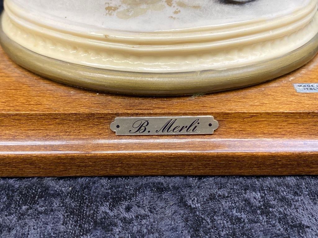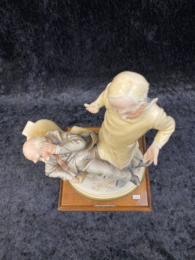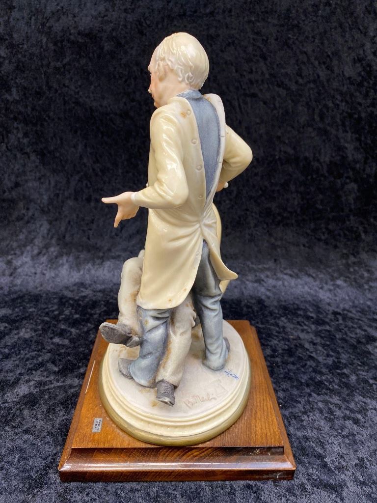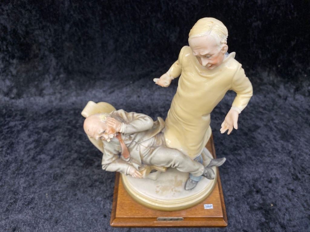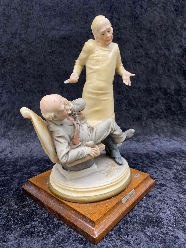 Italian Bruno Merli Capidomonte figurine of a dentist and patient.  The piece sits on a nice hard wood base marked, "MADE IN ITALY".  The work is in excellent overall condition with great movement and detail.  A great decorator piece.