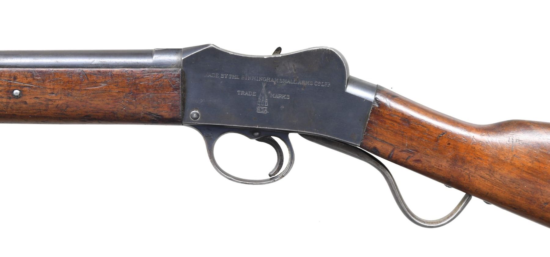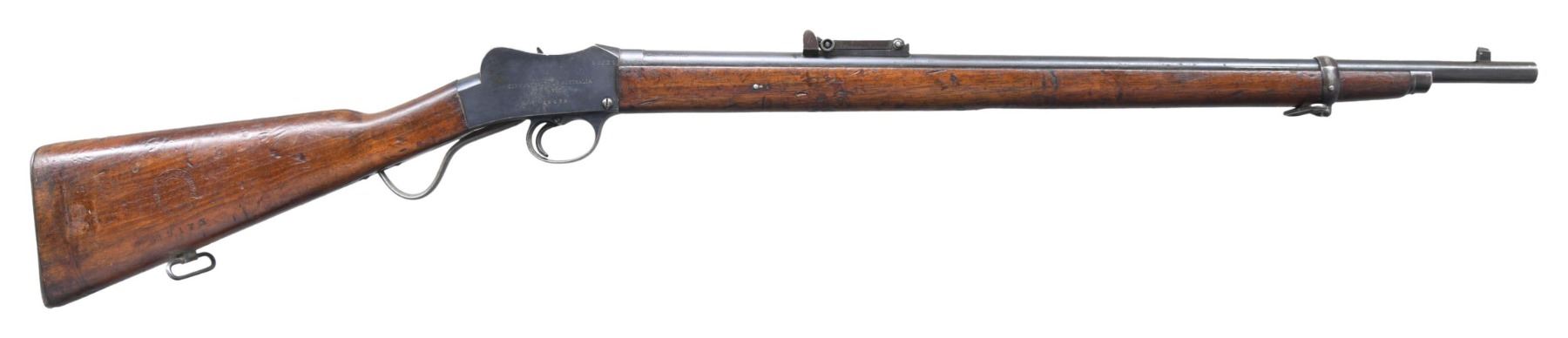 Cal. 32-20. S# 52235. Bbl. 25 1/4". Blade front sight. Ladder rear sight graduated to 600yds. Action has additional Australian issue number. Bbl., butt stock & breech all match either serial or issue numbers. Pre-WW1 Australian training rifle made on a Martini action by BSA. Bbl. top marked "32-20". Receiver top marked with Kangaroo. Left side of receiver has BSA markings. Right side of receiver has "COMMONWEALTH OF AUSTRALIA VIC" marking. Blued finish. Walnut stock set with Commonwealth of Australia roundel & 6/11 date. Bottom mounted sling swivels. CONDITION: stock set has a few gouges, scattered dings, scratches & handling marks. Upper buttplate screw is chipped & missing half. Metal retains 50% original blue with scattered fading to brown, oxidation, edge wear & handling marks. Action functions properly when hand cycled. Very good bright bore with strong rifling. (25-2499/MJC). CURIO. $400-600.