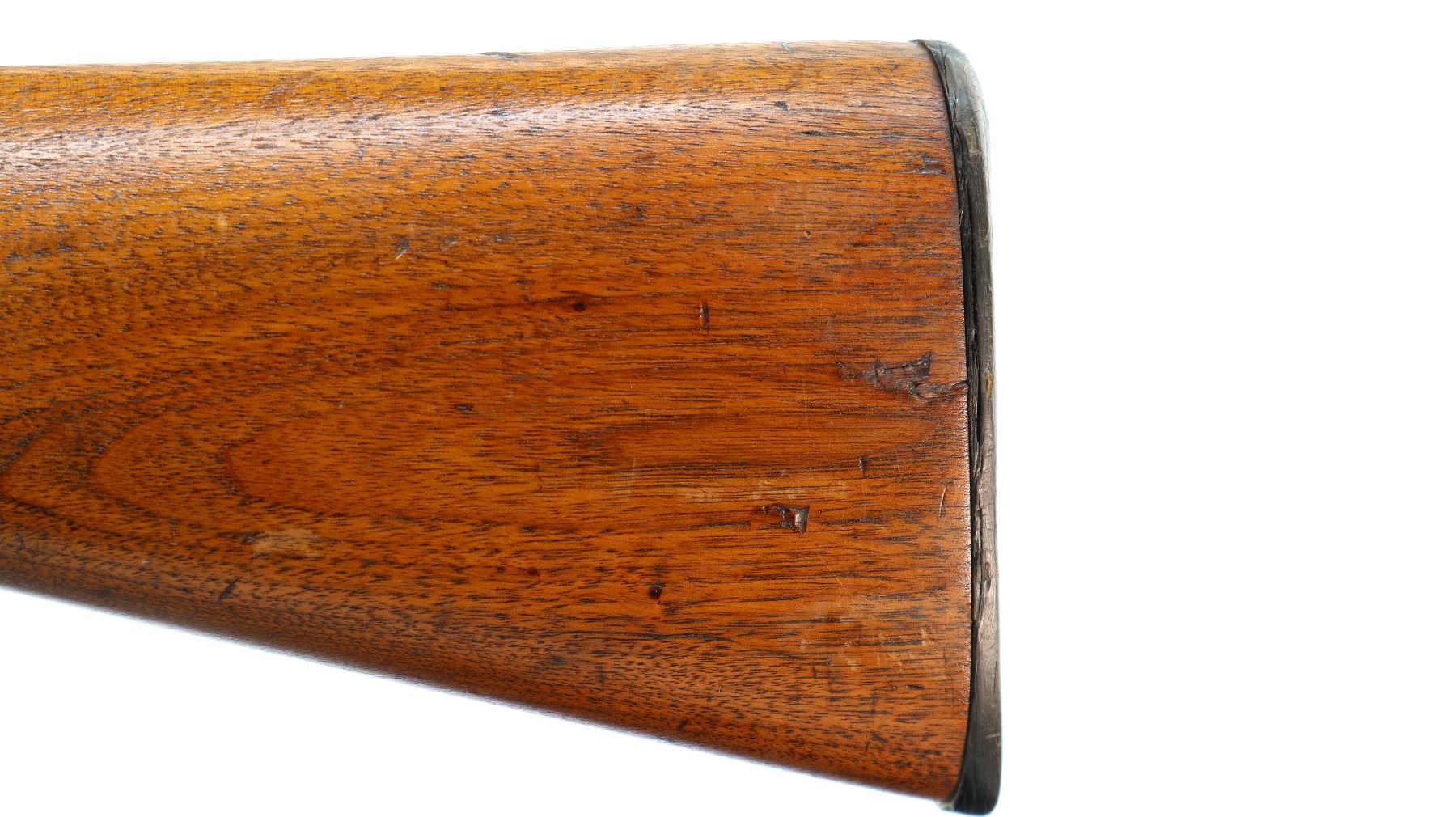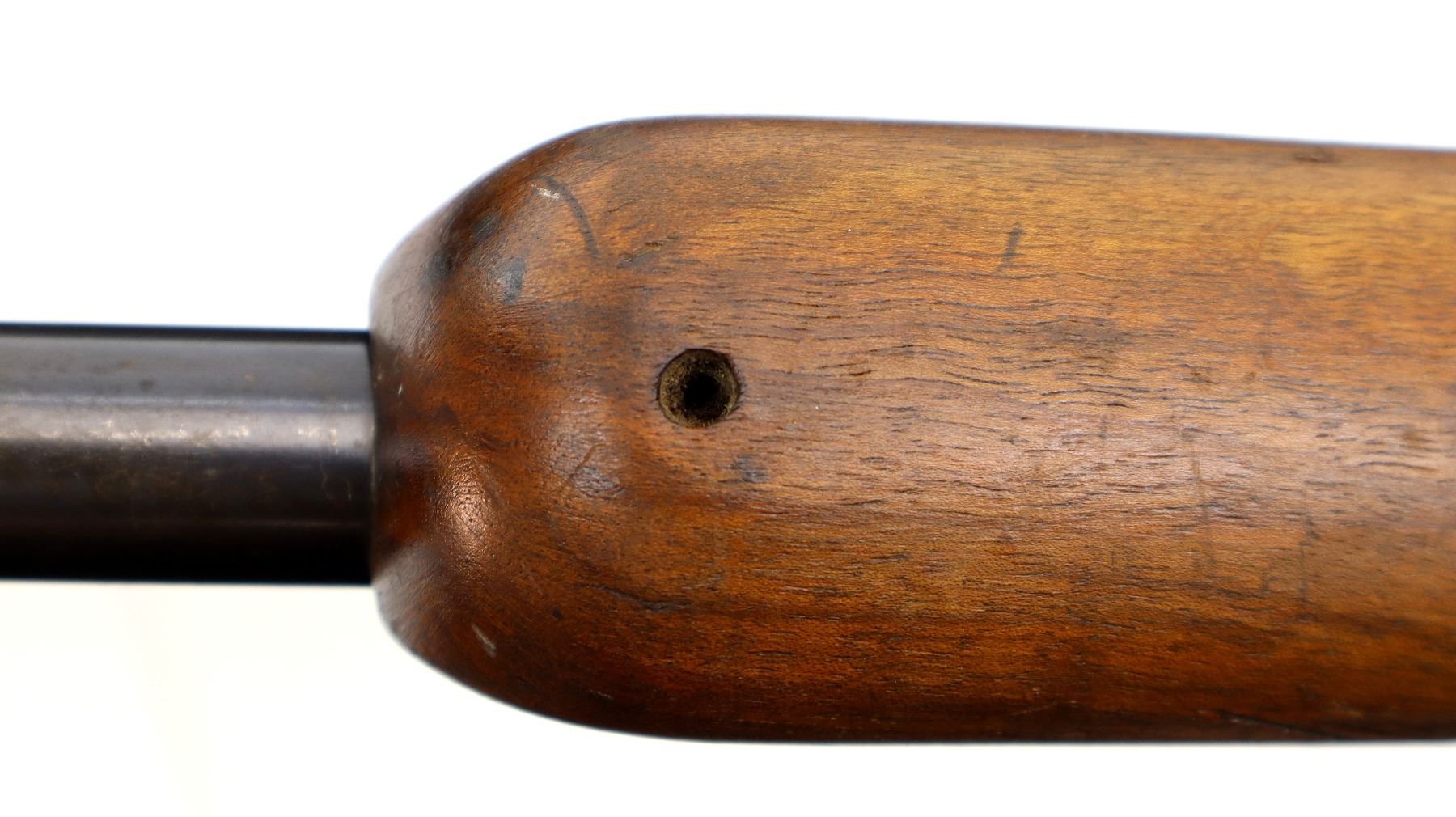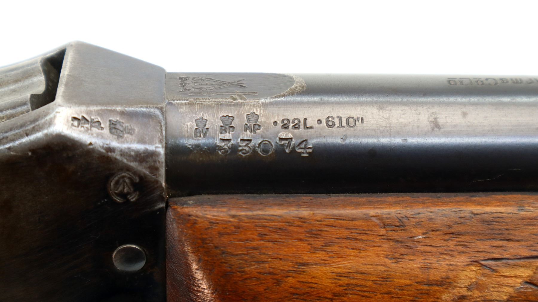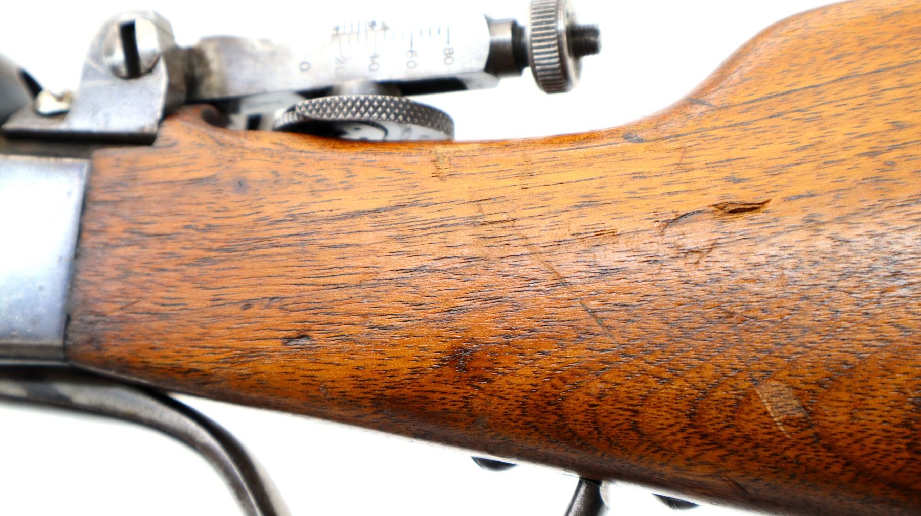 Main Description: Post front sight with hood and ramp, adjustable folding rear peep sight, blued finish, heavy barrel, receiver and butt stock have a C-Broad arrow stamped on them indicating Canadian Military Ownership, has a cocking indicator. Two piece wood stocks, checkered forearm with two extra holes, straight grip, checkered black polymer butt plate, unmarked brass stock disk, swivel studs.
