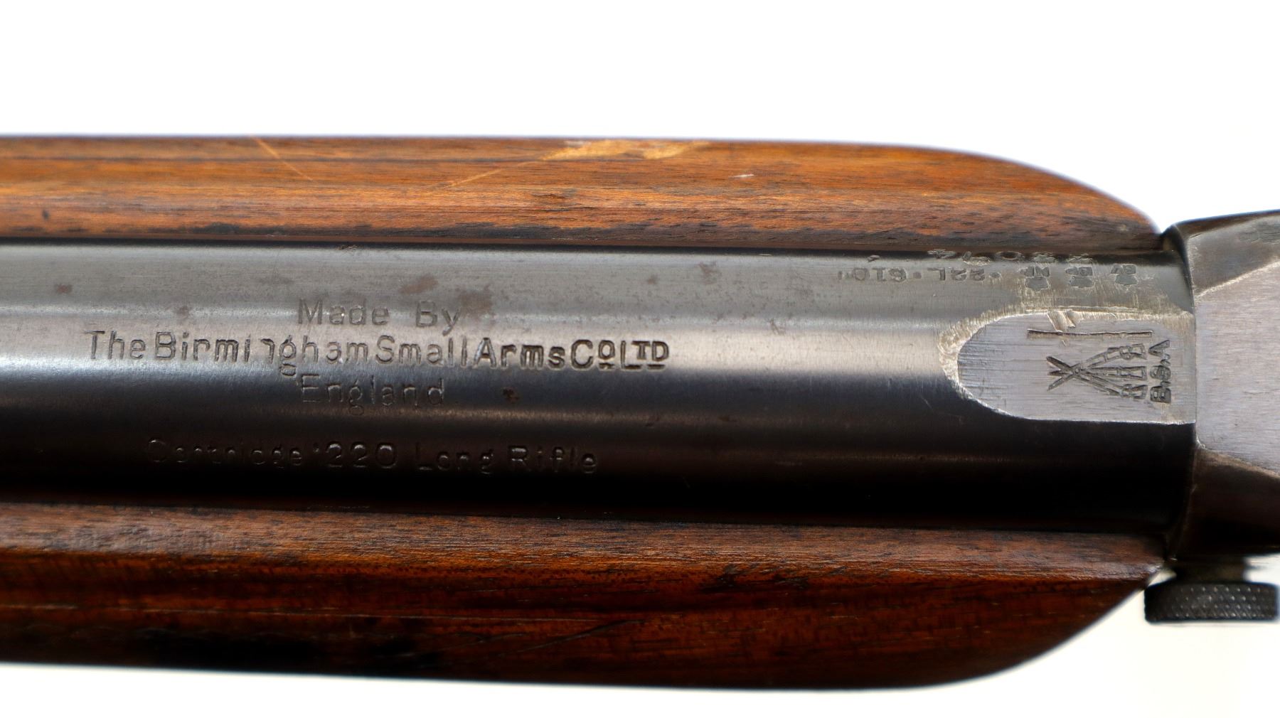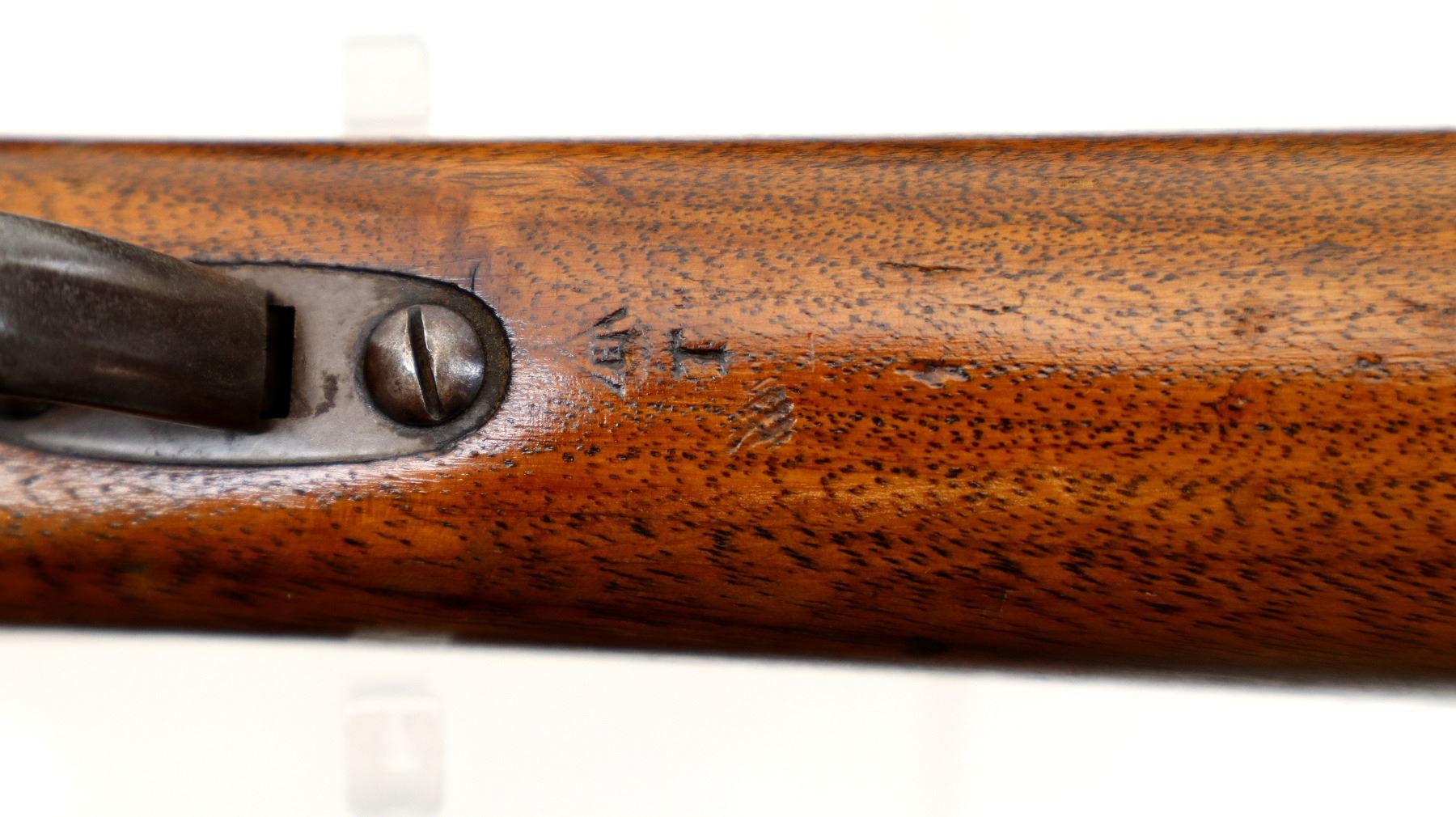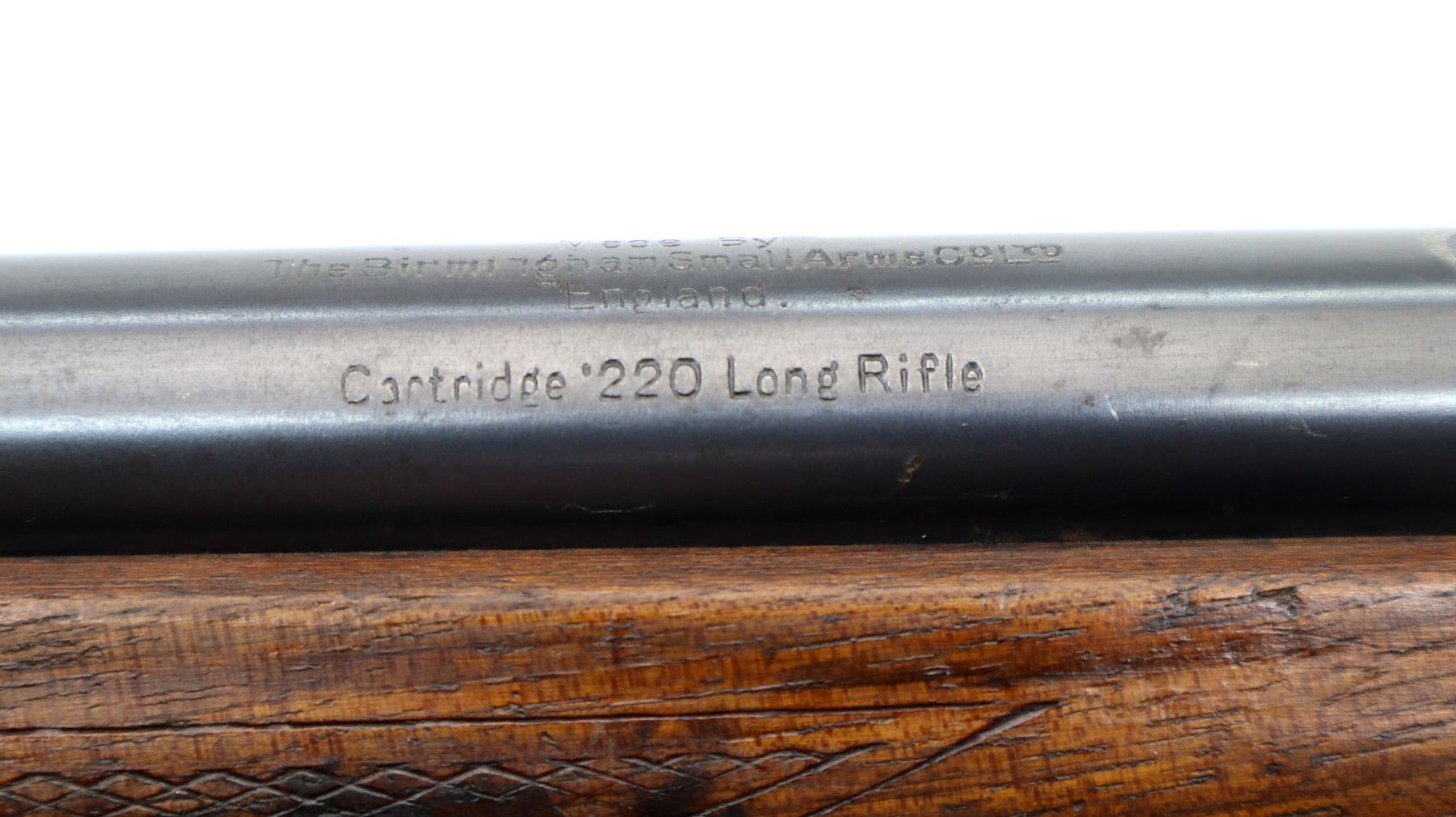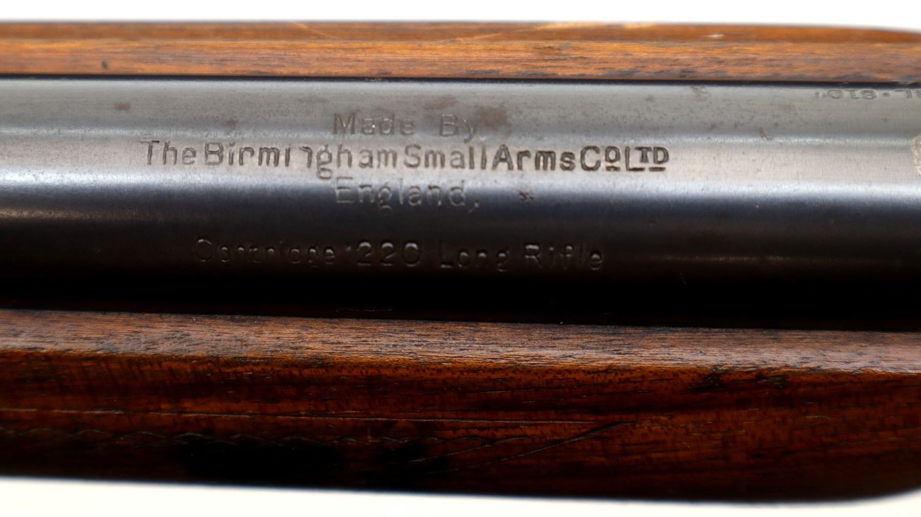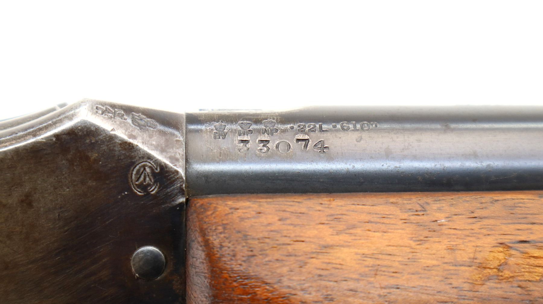 Main Description: Post front sight with hood and ramp, adjustable folding rear peep sight, blued finish, heavy barrel, receiver and butt stock have a C-Broad arrow stamped on them indicating Canadian Military Ownership, has a cocking indicator. Two piece wood stocks, checkered forearm with two extra holes, straight grip, checkered black polymer butt plate, unmarked brass stock disk, swivel studs.