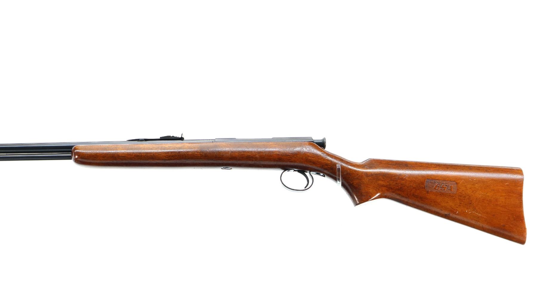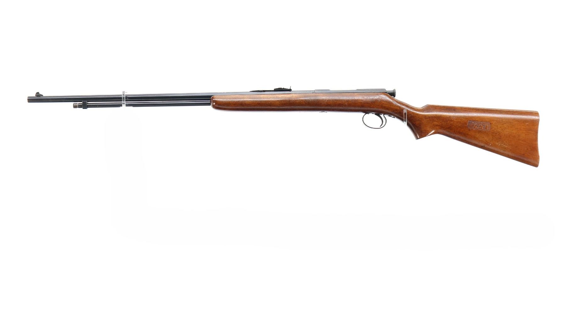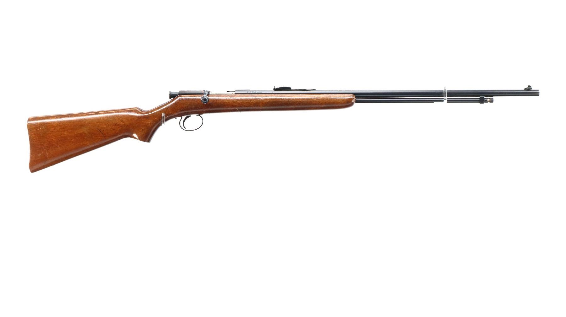 Main Description: Blade front sight, adjustable u notched rear sight, blued finish, smooth bolt knob. One piece wood stock, pistol grip, grooved butt.