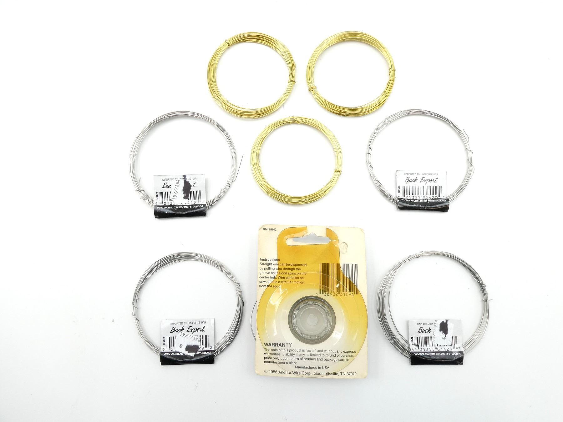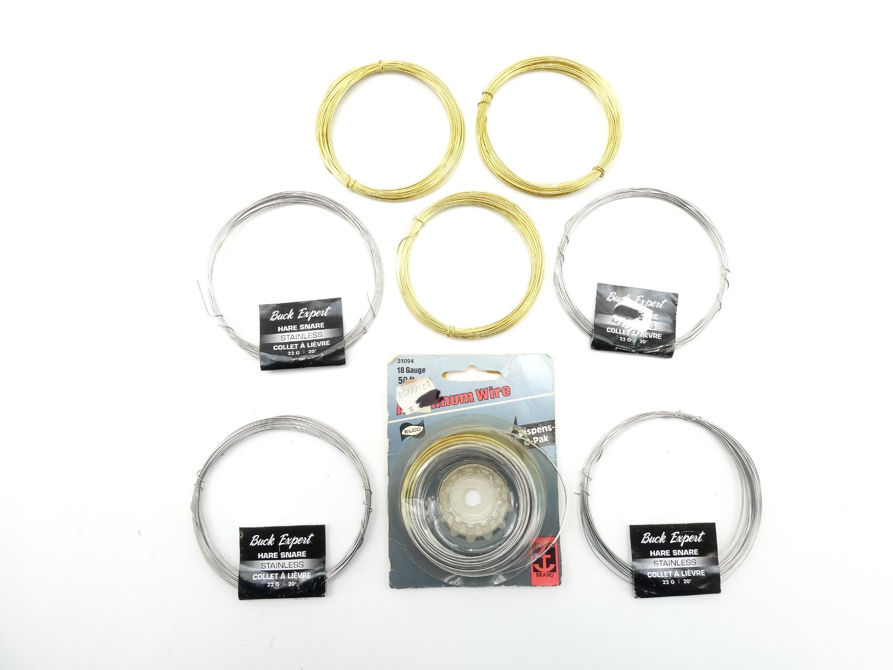LOT INCLUDES; (4) BUCK EXPERT HARE SNARE WIRE, STAINLESS, 22G, 20', (3) UNKNOWN BRASS SNARE WIRE & (1) ANCHOR BRAND DISPENS-O-PAK ALUMINUM WIRE, 18 GAUGE, 50FT, ITEM #: 31094, APPEARS NEW OLD STOCK, SEALED IN ORIGINAL PACKAGING (DAMAGED). SEE PHOTOS.