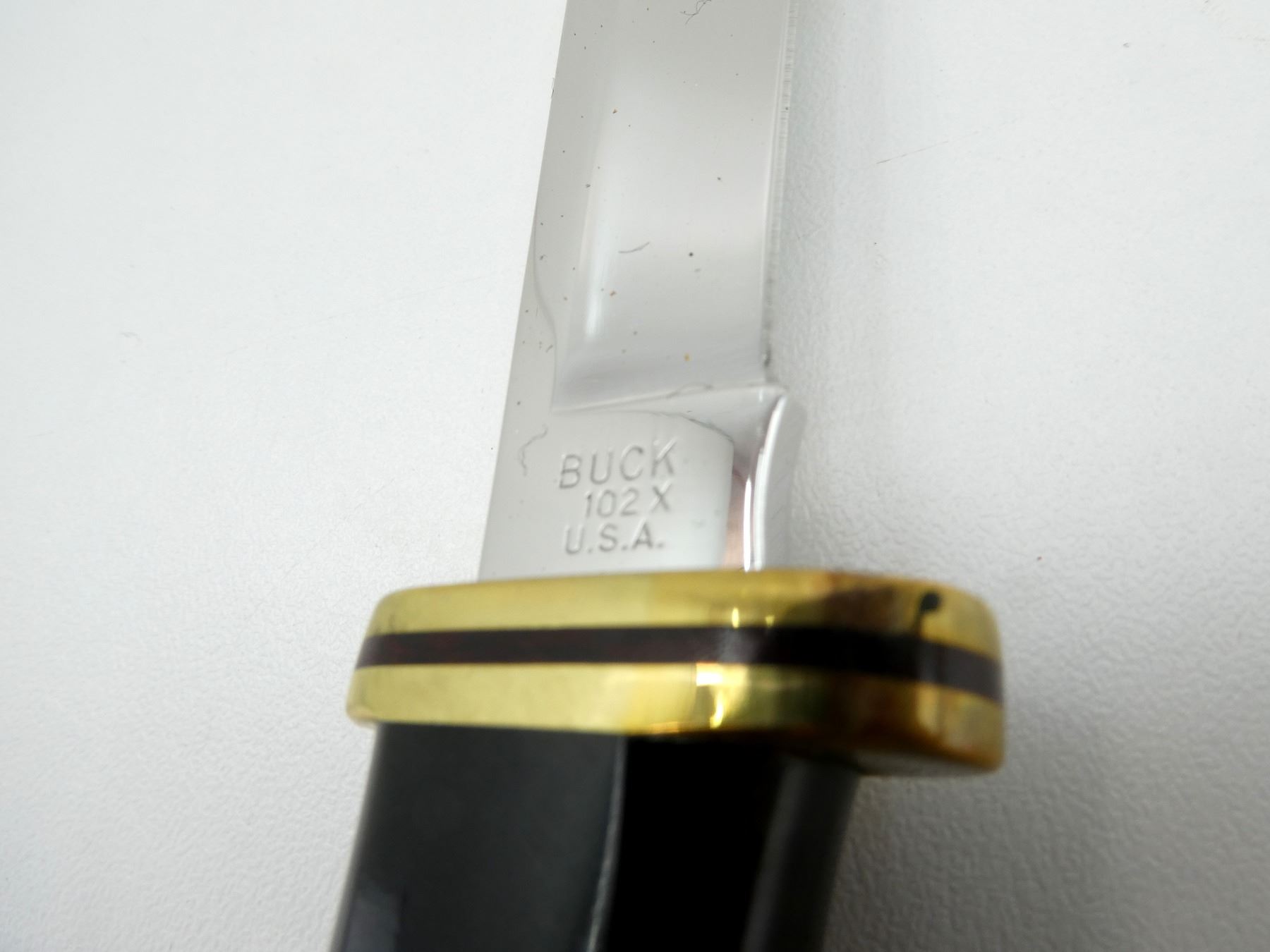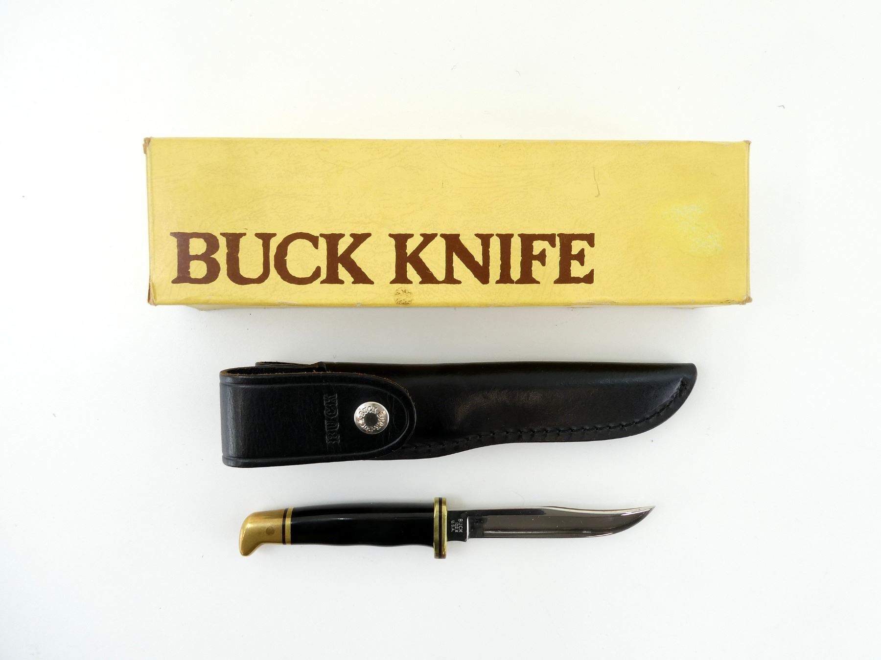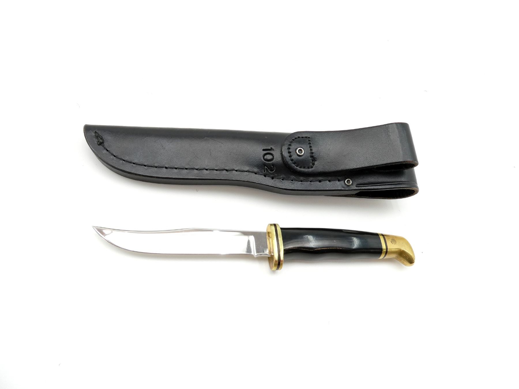 (1) STEEL BLADE, SYNTHETIC HANDLE, MARKED "102X", ETC., MODEL NO. 102, SHOWS WEAR & TEAR / USE MARKS, WITH BLACK LEATHER SHEATH, IN ORIGINAL PACKAGING, BLADE OVERALL LENGTH APPROX. 4". SEE PHOTOS.