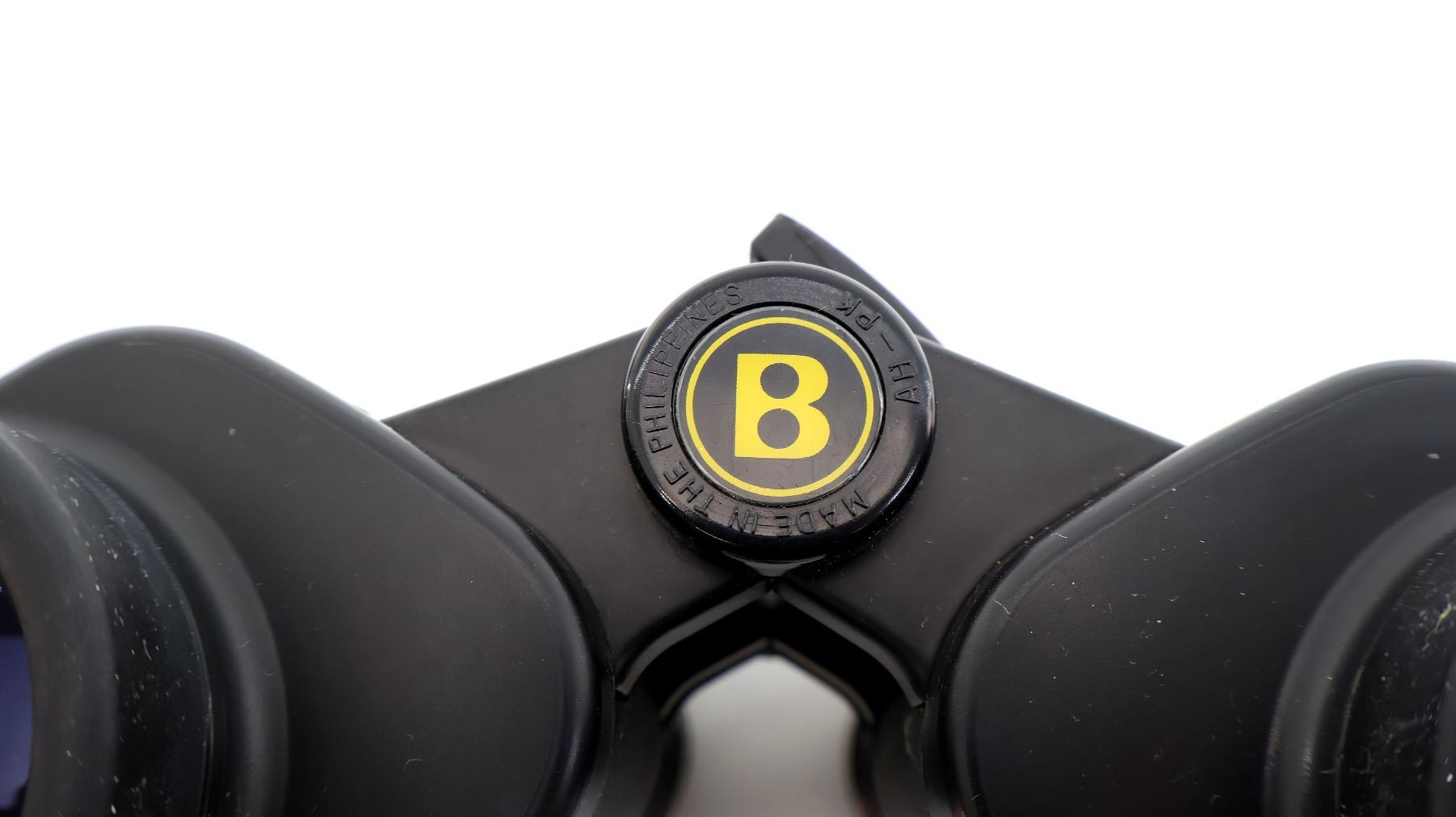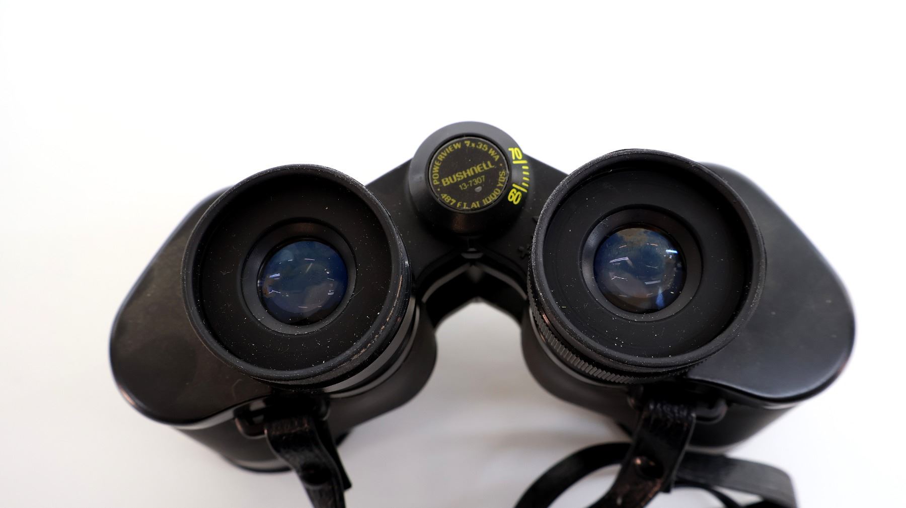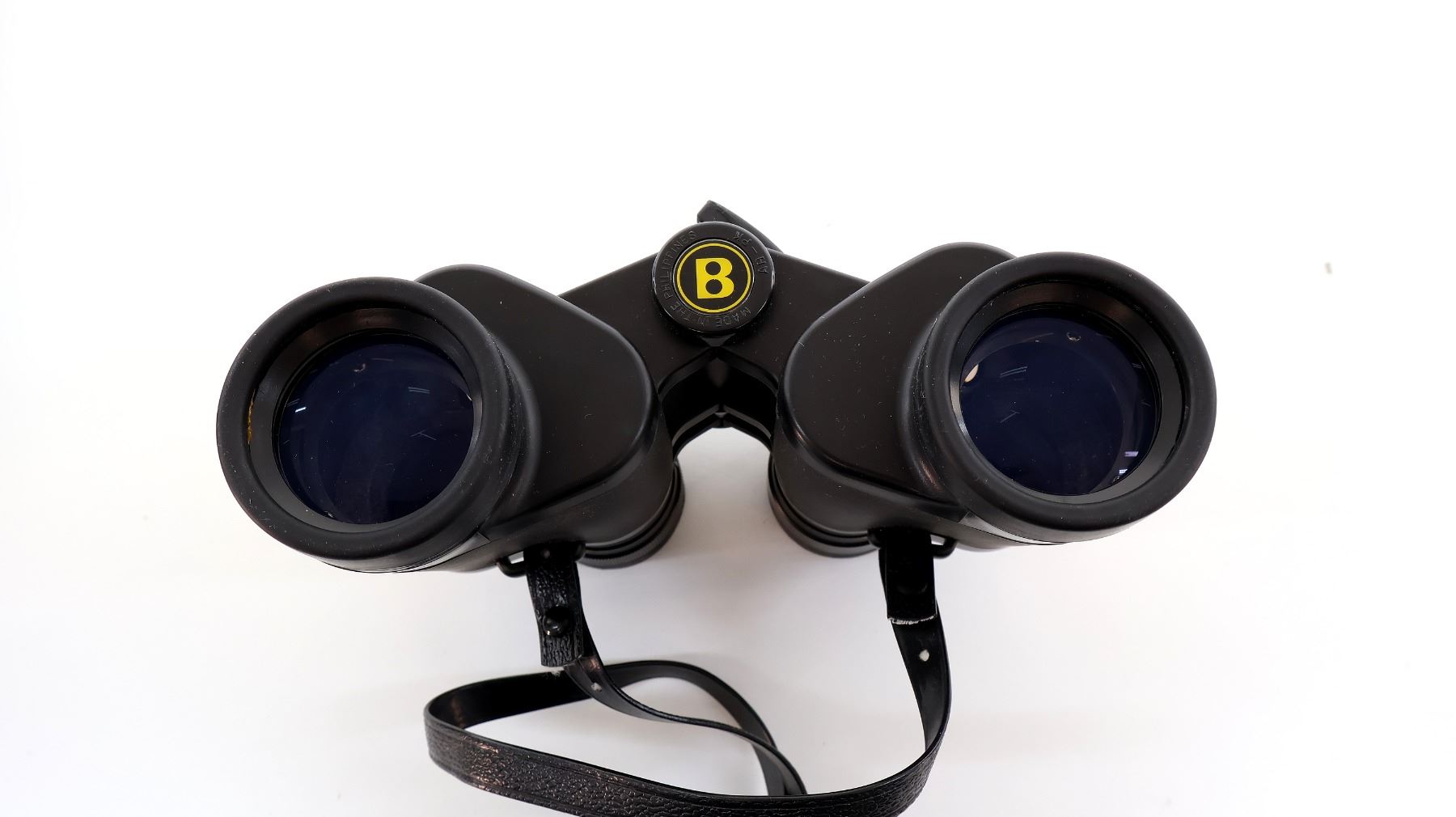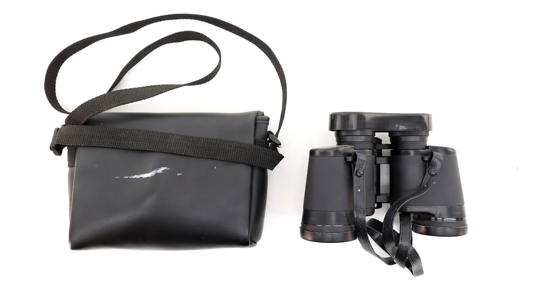 (1) CLEAR OPTICS, WORKING FOCUS DIAL, MARKED "487FT AT 1000YDS", ETC., WITH NECK LANYARD, LENS COVERS & CARRY CASE, SHOWS WEAR & TEAR / USE MARKINGS. SEE PHOTOS.