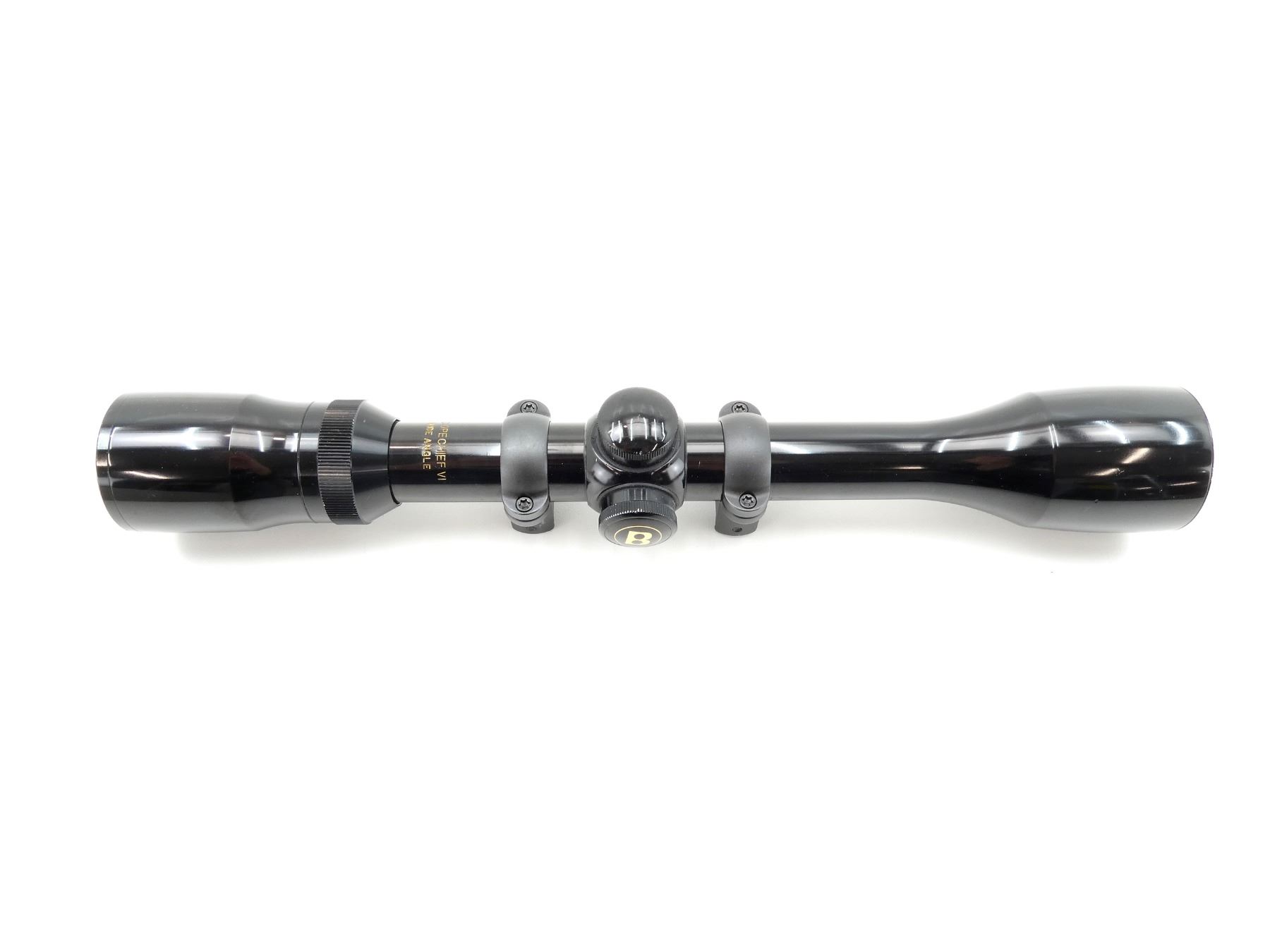 (1) CLEAR OPTICS, DUPLEX RETICLE, 1" TUBE DIAMETER, WIDE ANGLE, WORKING MAGNIFICATION RING, WINDAGE & ELEVATION KNOBS TURN, MARKED: "BUSHNELL SCOPECHIEF IV 4X40", "V211332", ETC., SHOWS SOME WEAR & TEAR / USE MARKS, WITH 1" SCOPE RINGS ATTACHED. MAY REQUIRE FITTING. SEE PHOTOS.