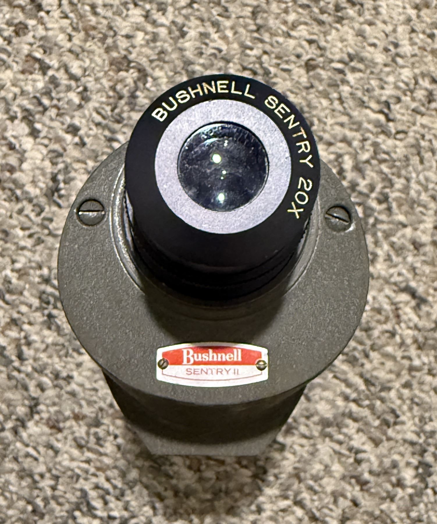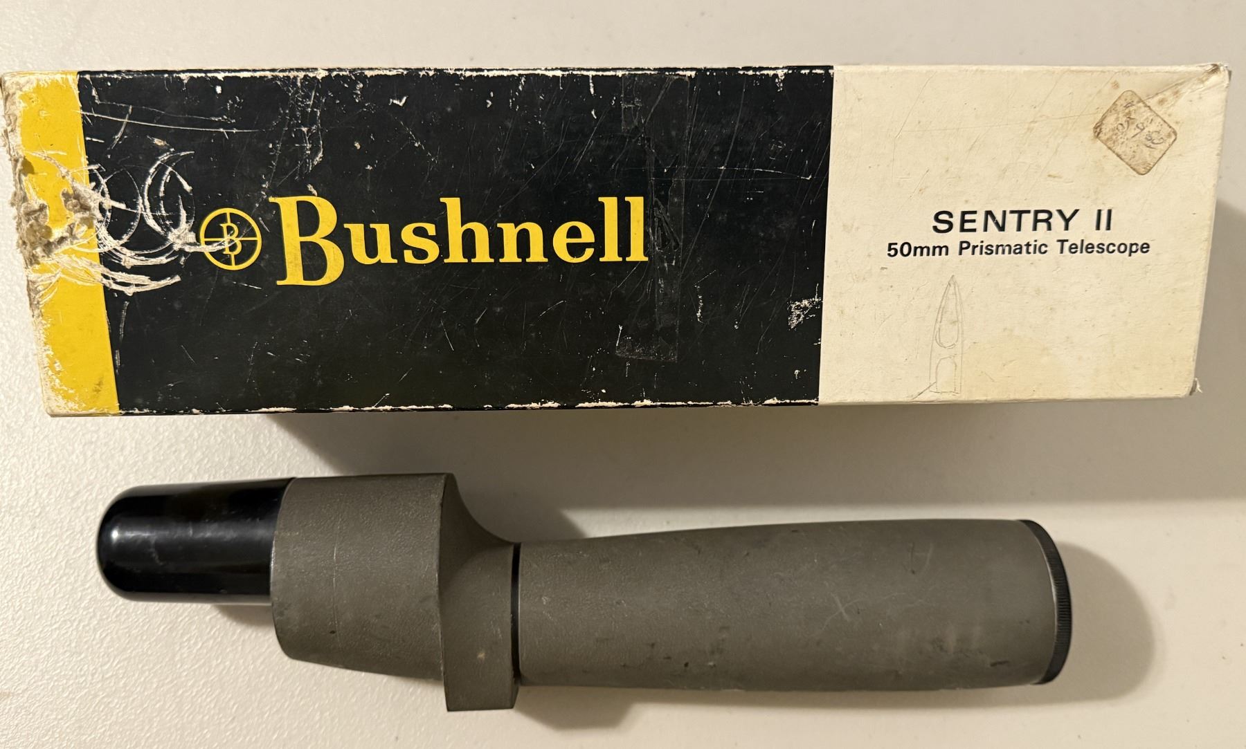 Bushnell Sentry II Spotting Scope, featuring the 20x eyepiece and the classic prismatic 50mm design. This unit is made in Japan and comes with its original Bushnell box (box shows wear and tear, as pictured). Serial No. 2293.
