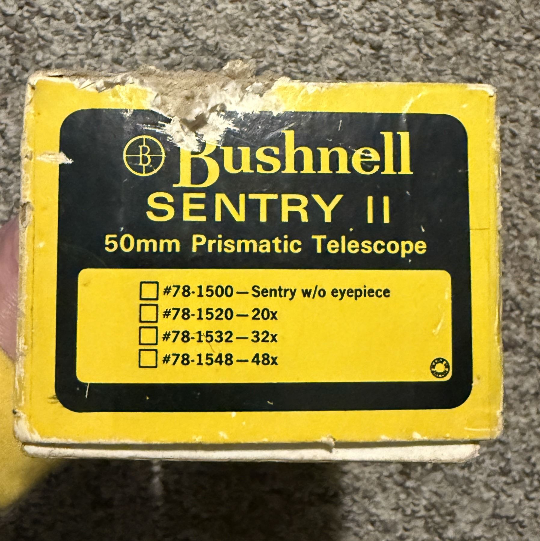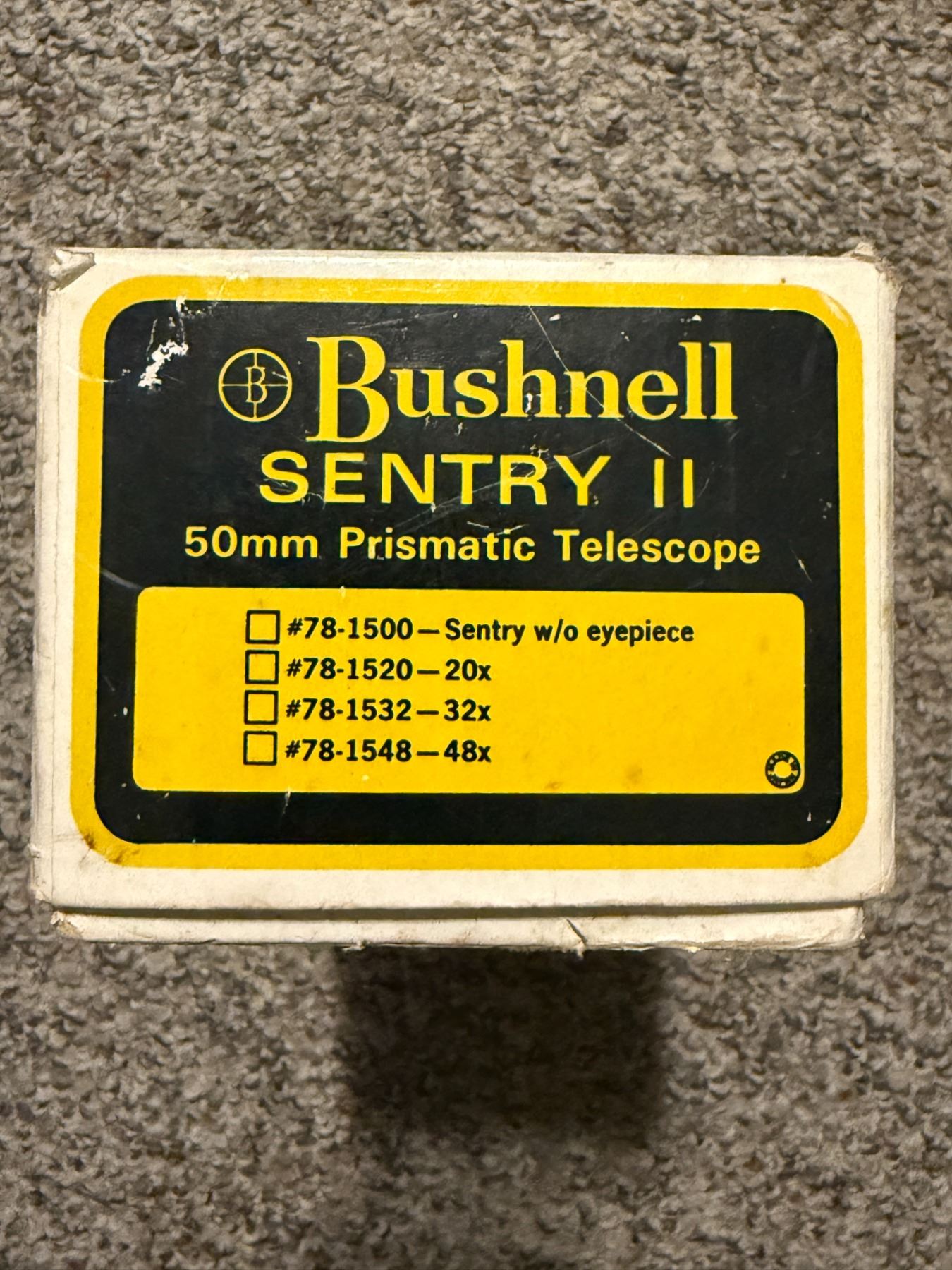 Rugged grey body with black eyepiece. Vintage optical quality – bright glass for its age. Includes original labeled box (#78-1520 – 20x)
