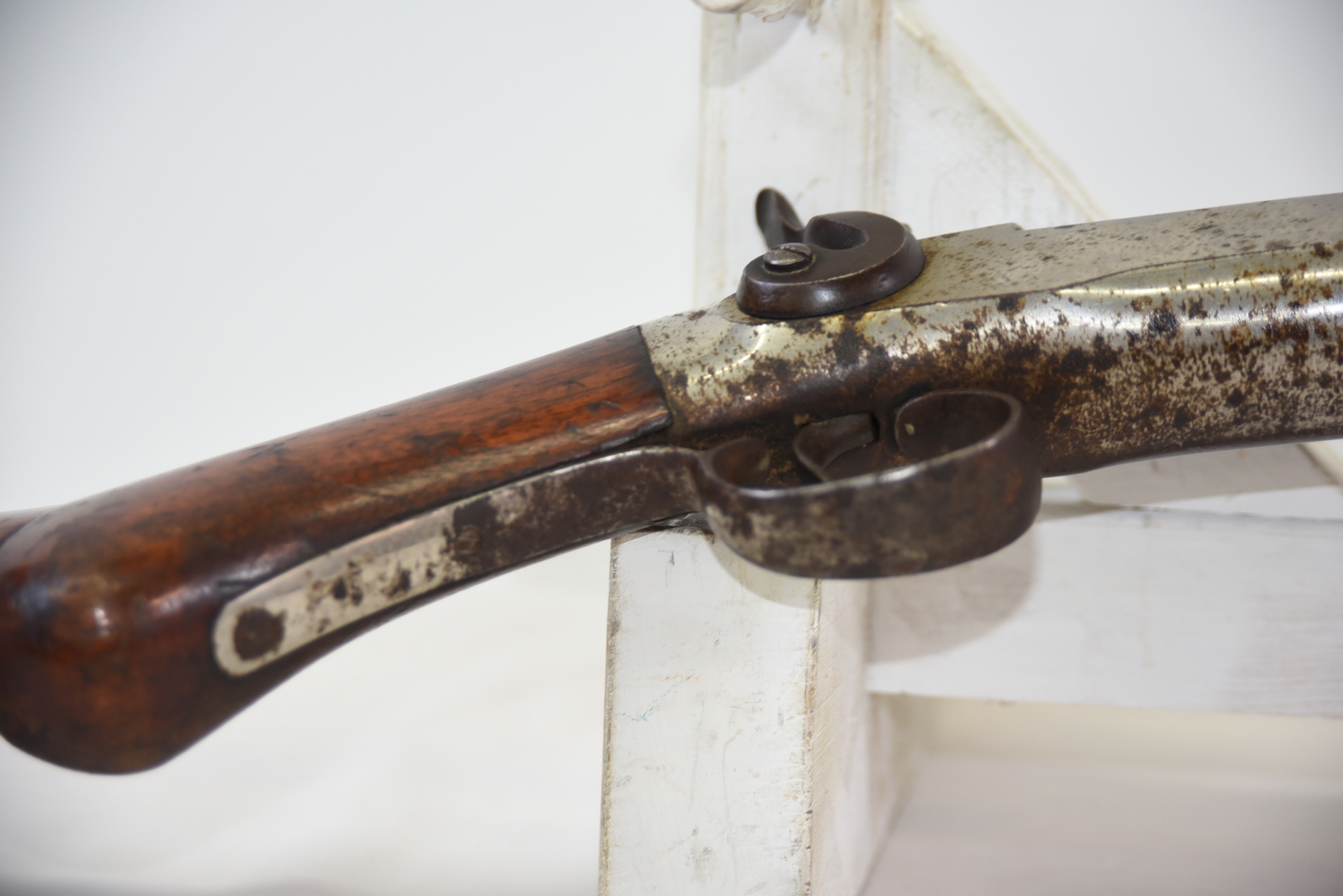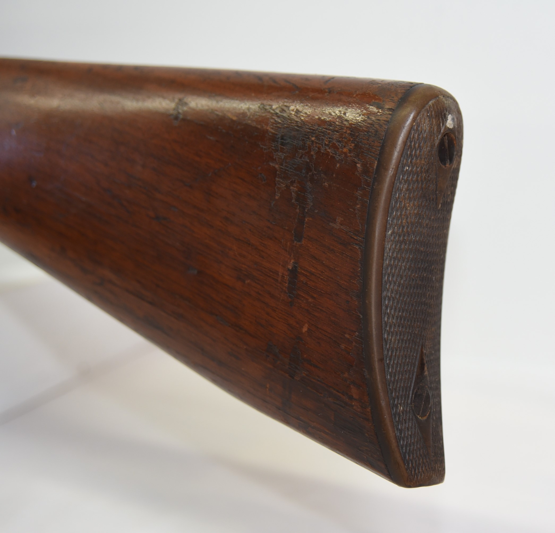 Wood stocks shows scratches, scuffs, dents, cracks; condition is poor.