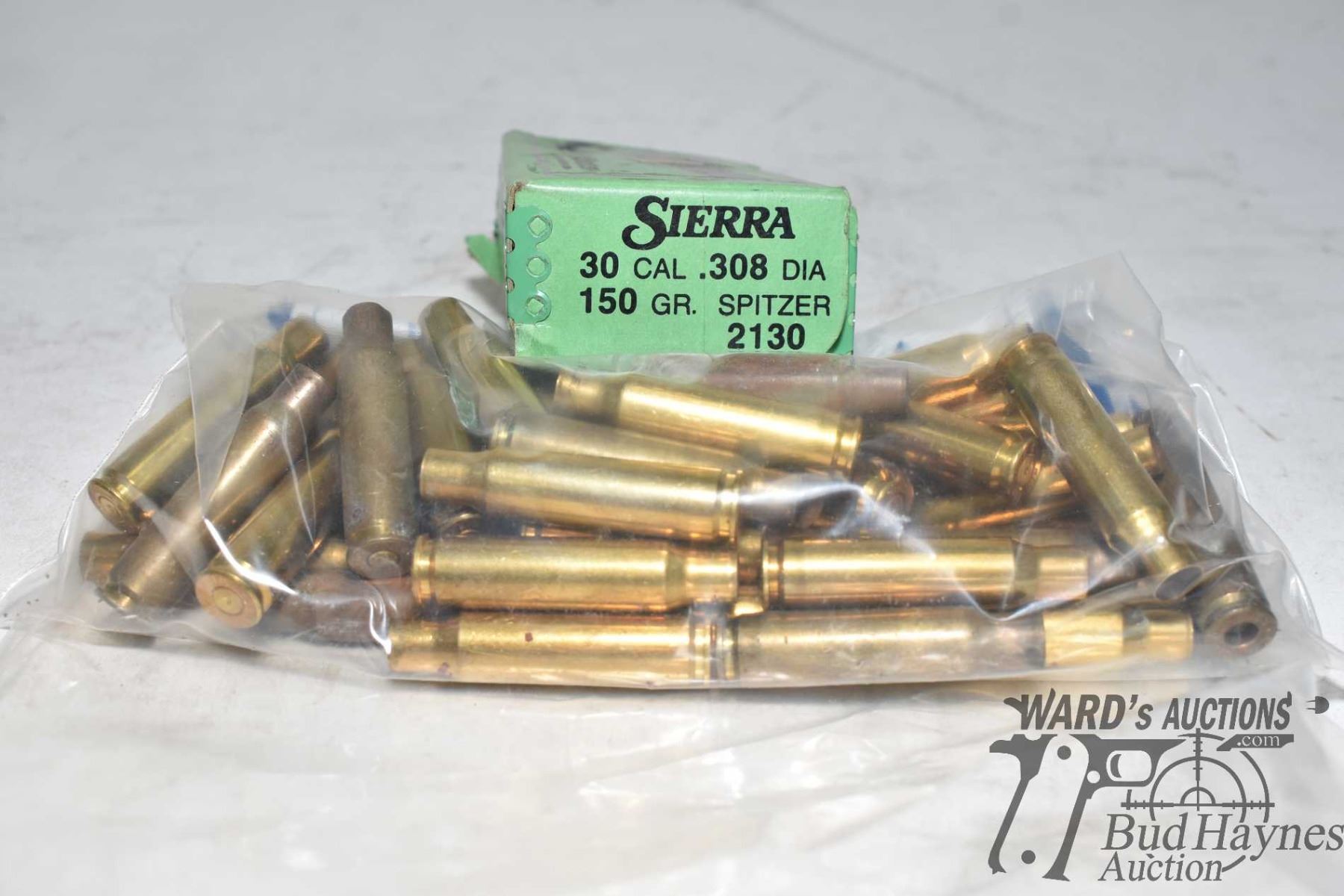 Bag w/ 44 .308 brass and one full 100 count box Sierra .30 cal 150 gr spitzer bullets