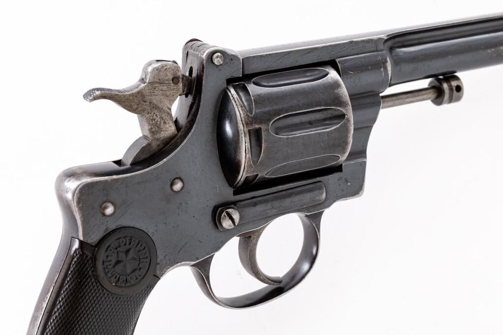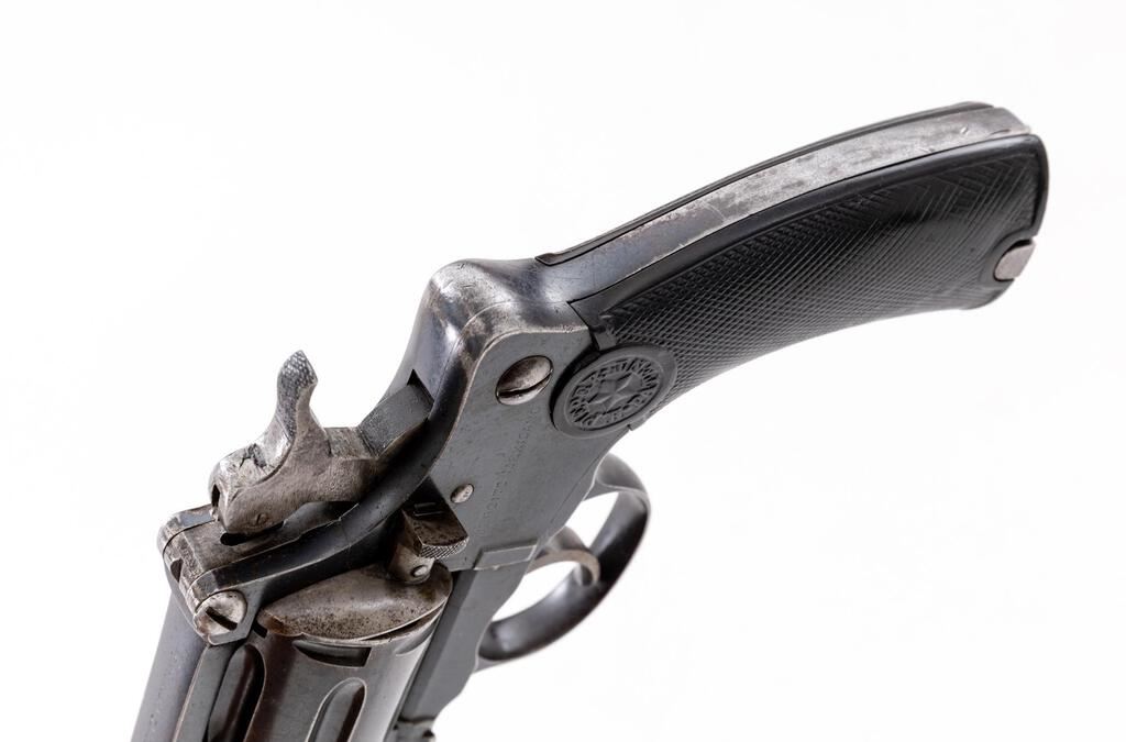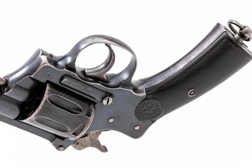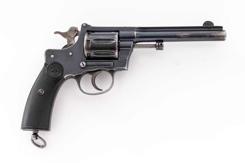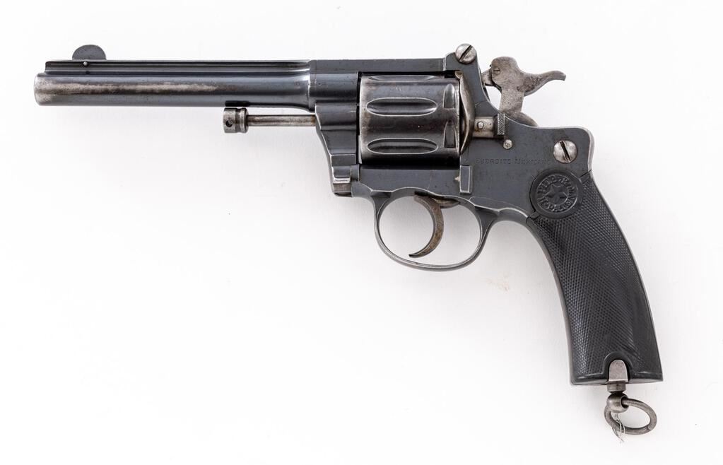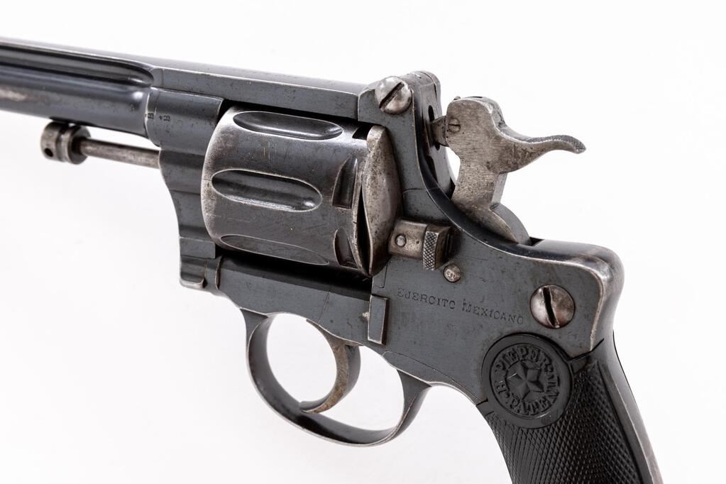 Belgian Pieper Model 1893 Mexican Army Contract Gas Seal Double Action Revolver, #1497, 7.65 Nagant CF cal., 5.5" round barrel marked "Ejercito Mexicano" ("Mexican Army") on topstrap and "(star)/B" at breech, with pinned blade front and notched rear sights; 7-shot "scoop-flute" cylinder has same marking; solid frame with same marking has integral trigger guard and grip straps with lanyard ring at butt, 2-pc. checkered hard rubber grips with "H. Pieper/Patent" in circular panel at top. Mfg'd late 1880s-early '90s, in 5,000 qty. for the Mexican gov't. Condition is near excellent retaining approx. 90% smooth original military blue, with light highpoint wear, sharp edges, and markings. Grips have light wear and sharp logos. Action is crisp, bore shines with sharp rifling. Unusual action and quite rare in this condition. Est.: $1,500-$2,000. (Antique)