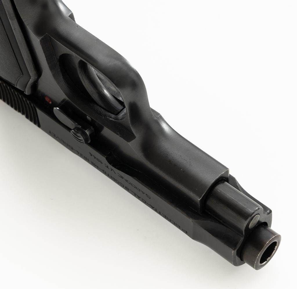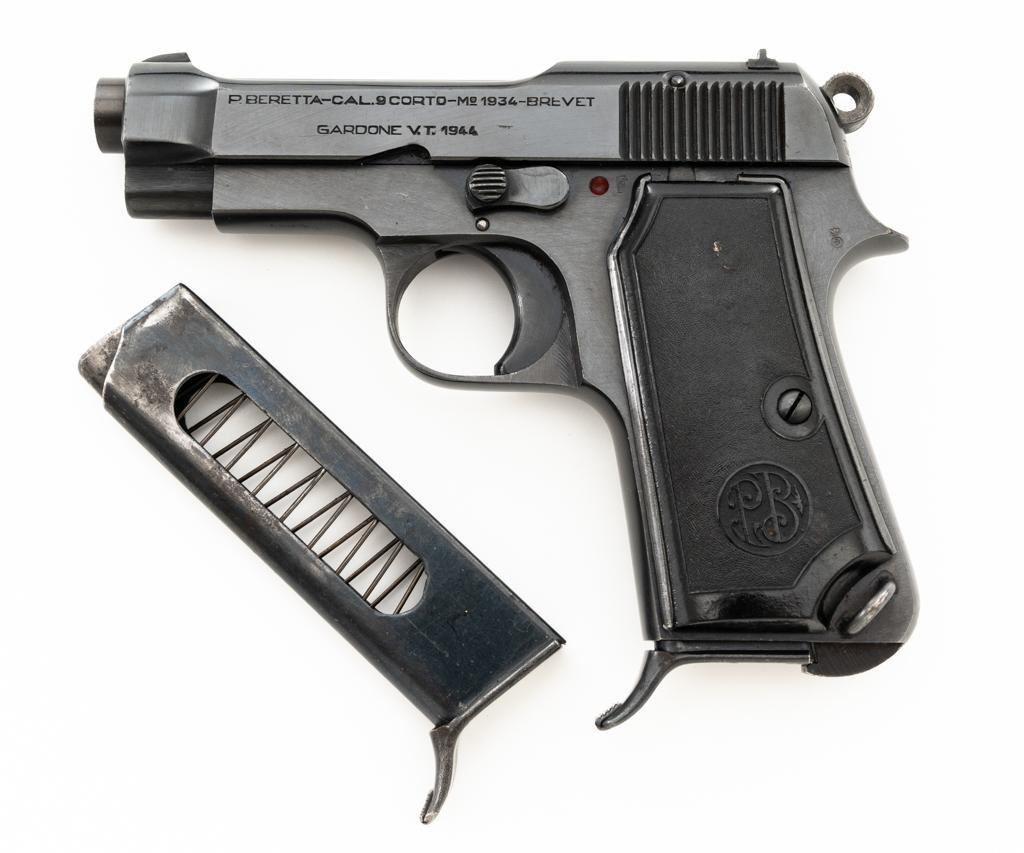 Beretta Model 1934 Semi-Automatic Pistol with Two (2) Magazines, #1620BB, .380 ACP cal., 3.5" barrel, blued finish, textured black plastic grips embossed with "PB" logos on both sides, blade front sight, fixed rear sight with square-notched groove, and fixed lanyard loop on left side of the frame. Both magazines are unmarked with blued finishes and finger extensions. Pistol is marked "P.BERETTA-CAL.9 CORTO-Mo 1934-BREVET/GARDONE V.T.1944" on left side of the slide. Matching numbers on frame and slide. No visible import marks. Condition overall near excellent, with the metal retaining almost all of its reblued finish. Grips with scattered light handling marks, mainly to the left side. Action operates smoothly. Bright bore rates excellent, with well-defined rifling. Est.: $250-$350. (C&R/PPT)