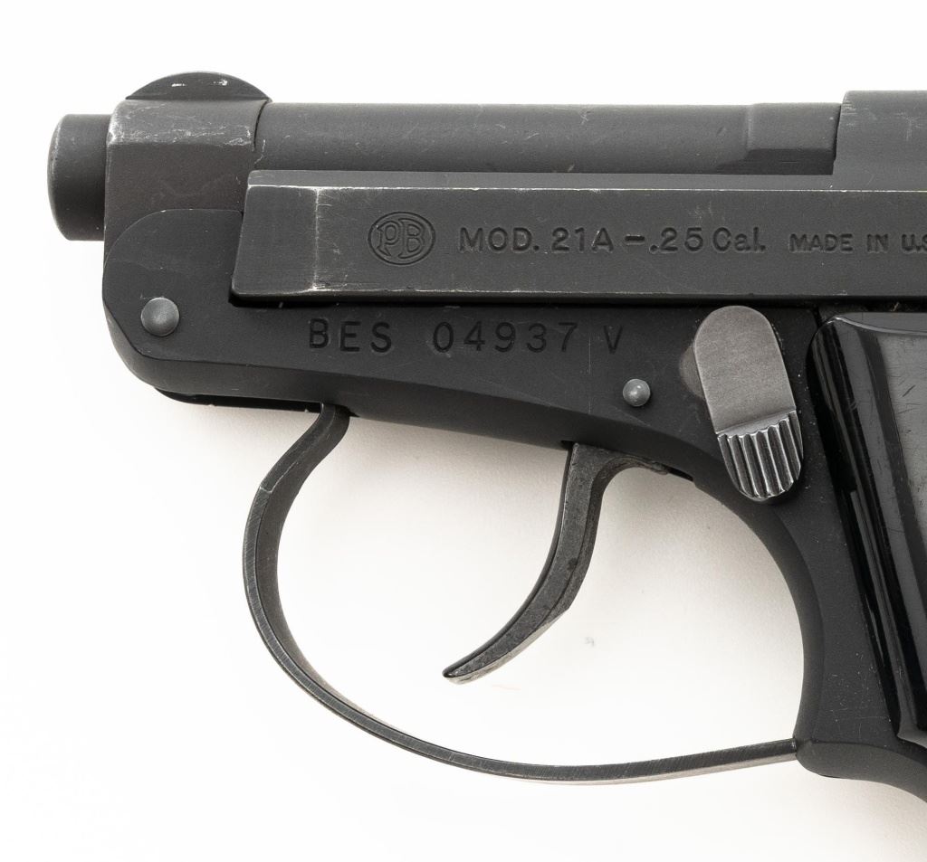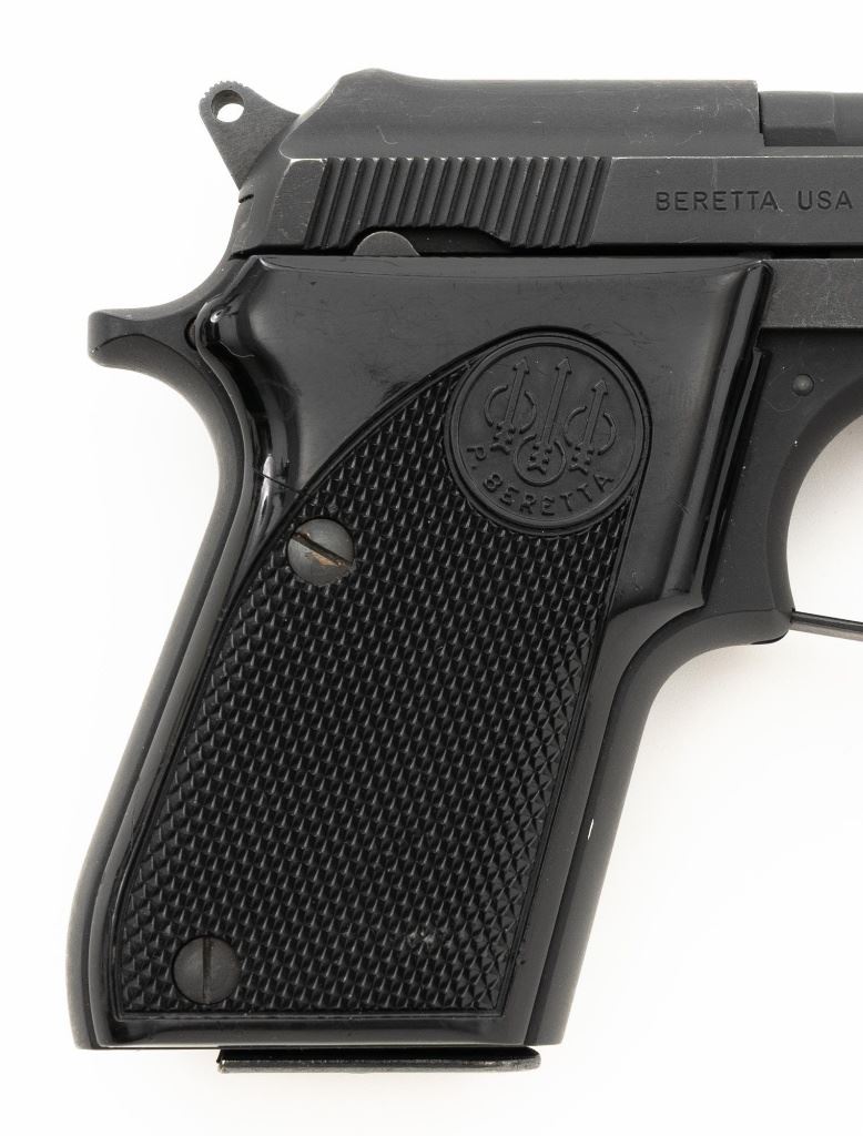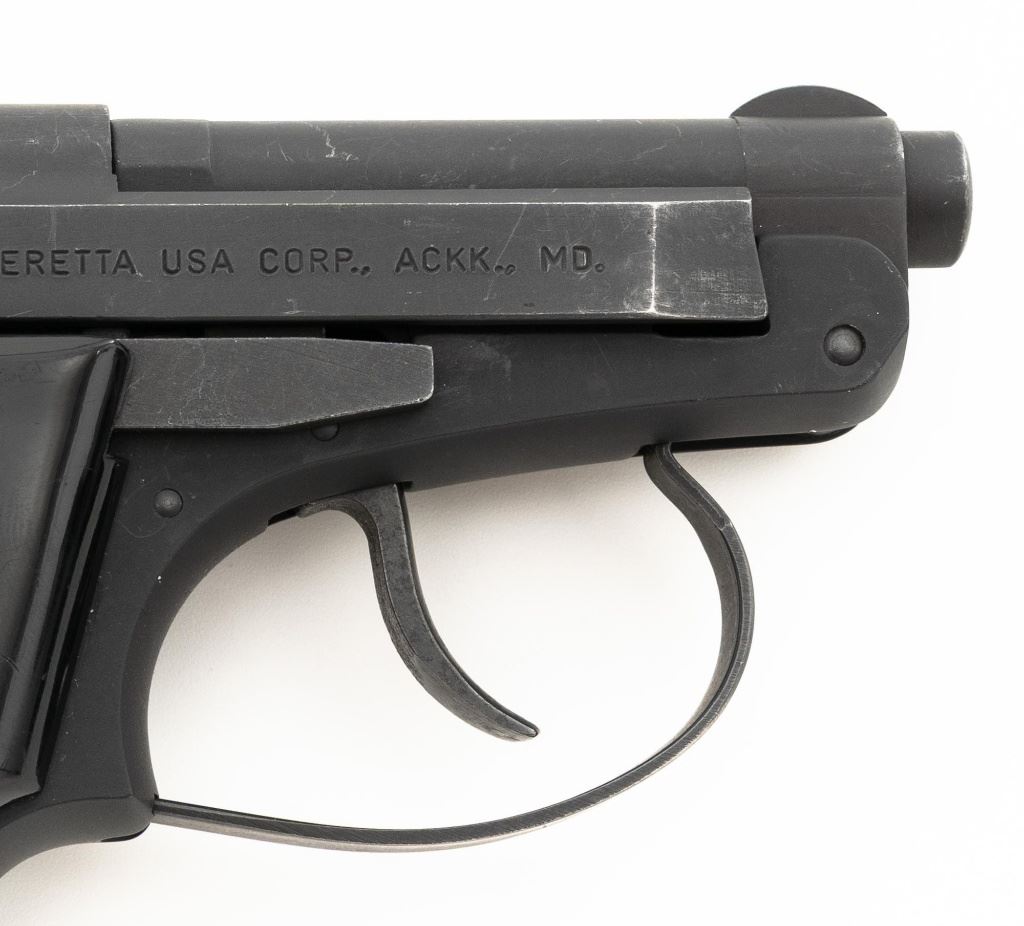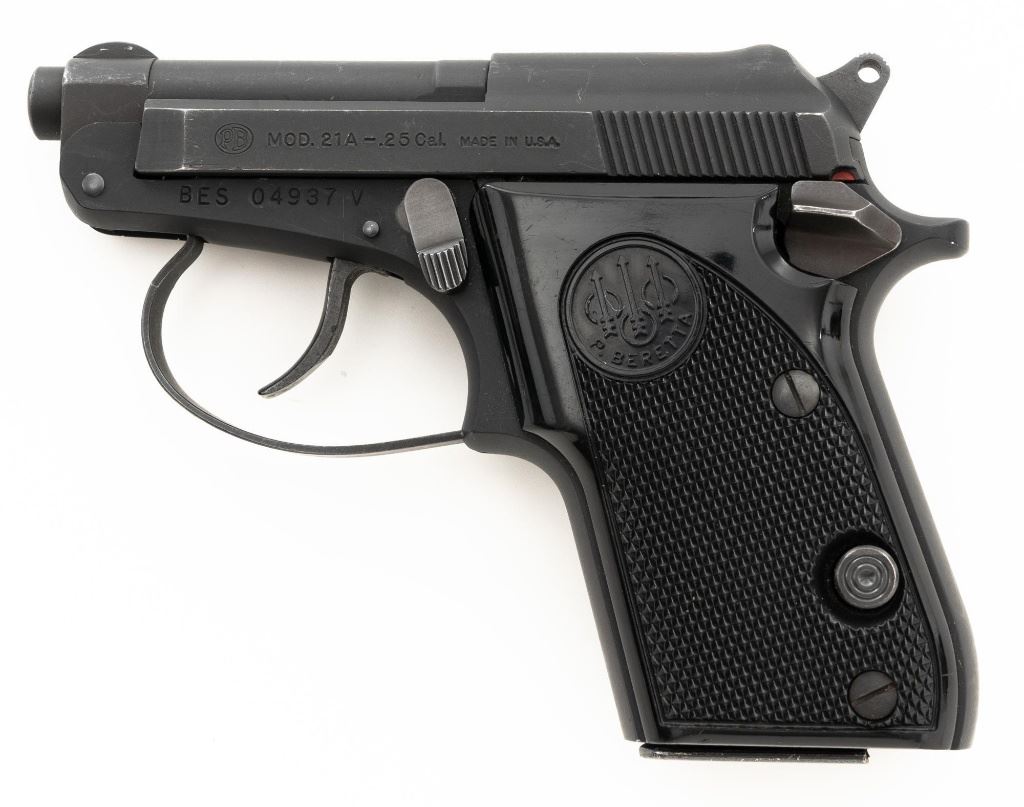 Beretta Model 21A Bobcat Double Action Tip-Up Semi-Automatic Pistol, #BES04937V, .22 LR cal., 2.4" barrel, matte blue finish, checkered plastic Beretta grips, low profile blade front sight, fixed square-notch rear sight, with one 7-round magazine. Pistol is in excellent overall condition, retaining approx. 97%-98% factory blue, with scattered light scratches and handling marks. Factory lettering is crisp. Grips are excellent with sharp checkering. Action functions smoothly. Bore is bright with excellent rifling. Est.: $300-$500. (Modern) (Not available to Calif. residents.)