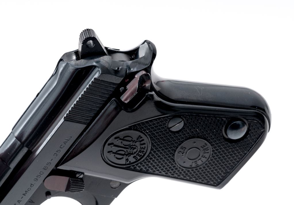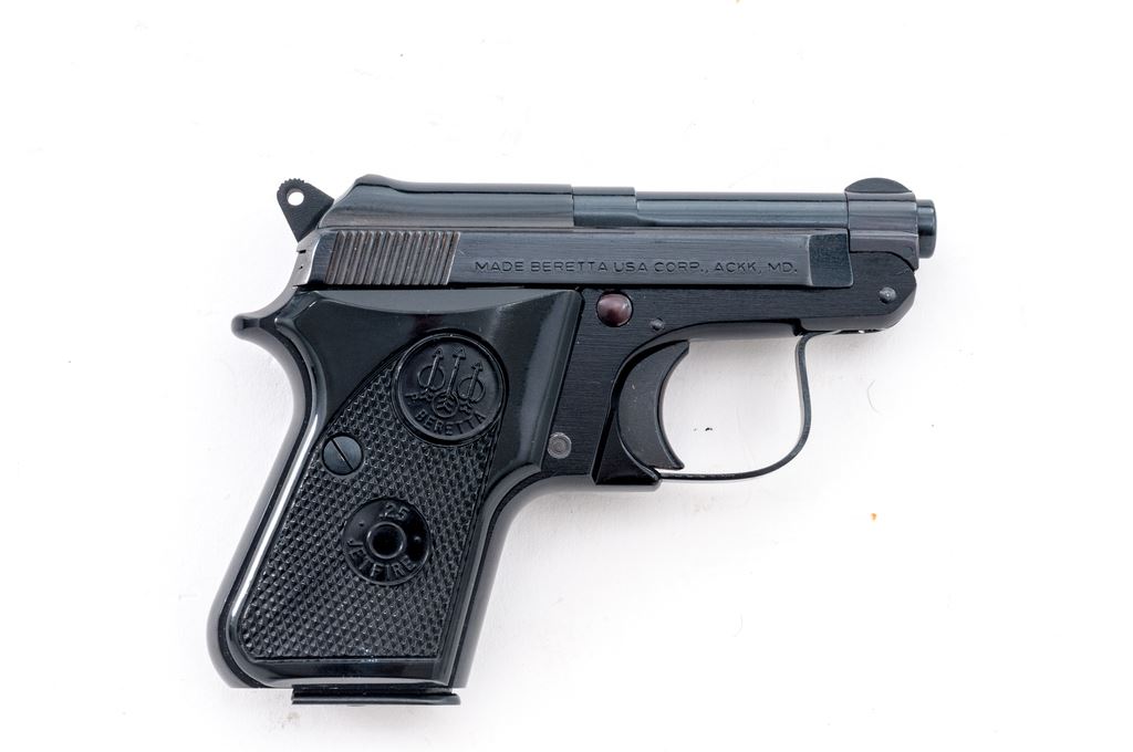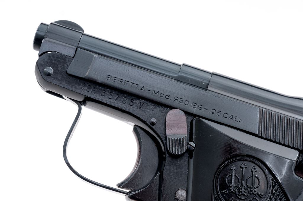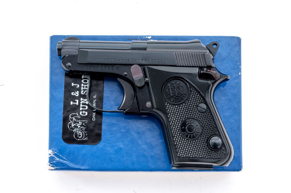 Beretta Model 950BS Jetfire Semi-Automatic Pistol, #BER63783V, .25 ACP cal., 2-3/8'' tip-up barrel, blued steel slide, black alloy frame, factory checkered black plastic grips,ÿstandard fixed sights, with one Beretta magazine. In the original two-piece box with matching end label. Condition is excellent retaining approx. 99% original finish. Metal and grips with a few slight handling marks, most noticeable on right side of frame and smooth portion of the left grip; grip checkering is sharp. Action operates smoothly, bright bore rates as excellent. Box shows moderate storage type wear, including creasing to parts of the lid. Est.: $250-$400. (Modern/PPT)
