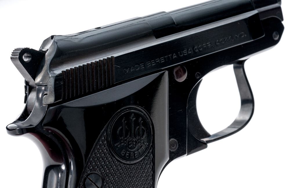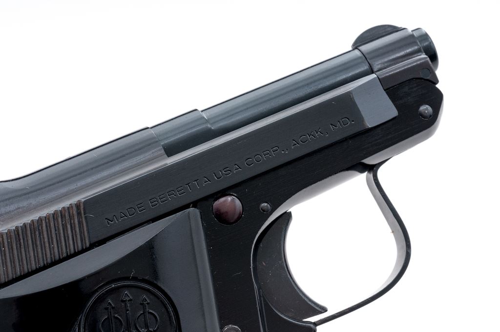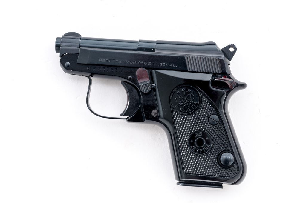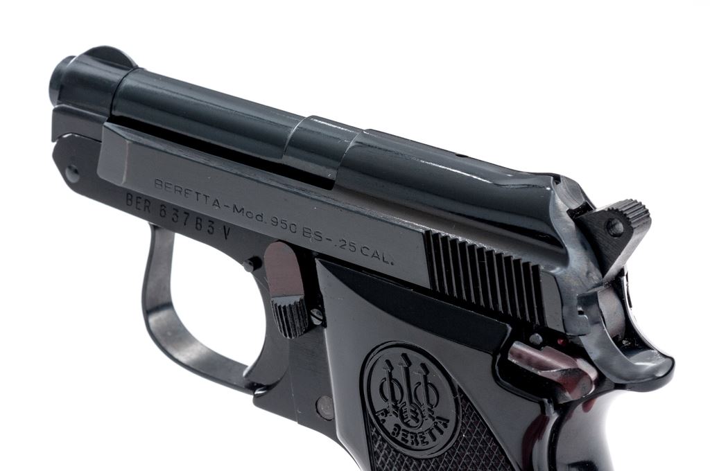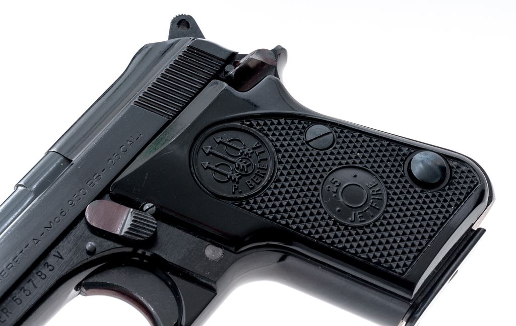 Beretta Model 950BS Jetfire Semi-Automatic Pistol, #BER63783V, .25 ACP cal., 2-3/8'' tip-up barrel, blued steel slide, black alloy frame, factory checkered black plastic grips,ÿstandard fixed sights, with one Beretta magazine. In the original two-piece box with matching end label. Condition is excellent retaining approx. 99% original finish. Metal and grips with a few slight handling marks, most noticeable on right side of frame and smooth portion of the left grip; grip checkering is sharp. Action operates smoothly, bright bore rates as excellent. Box shows moderate storage type wear, including creasing to parts of the lid. Est.: $250-$400. (Modern/PPT)
