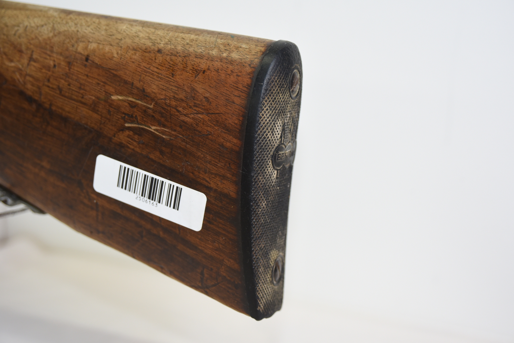 Wood stock shows cracks near the grip area, scratches, scuffs, finish wear, piece is missing from the rear stock; condition is poor.