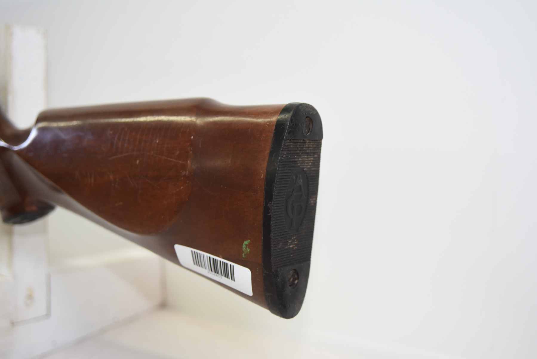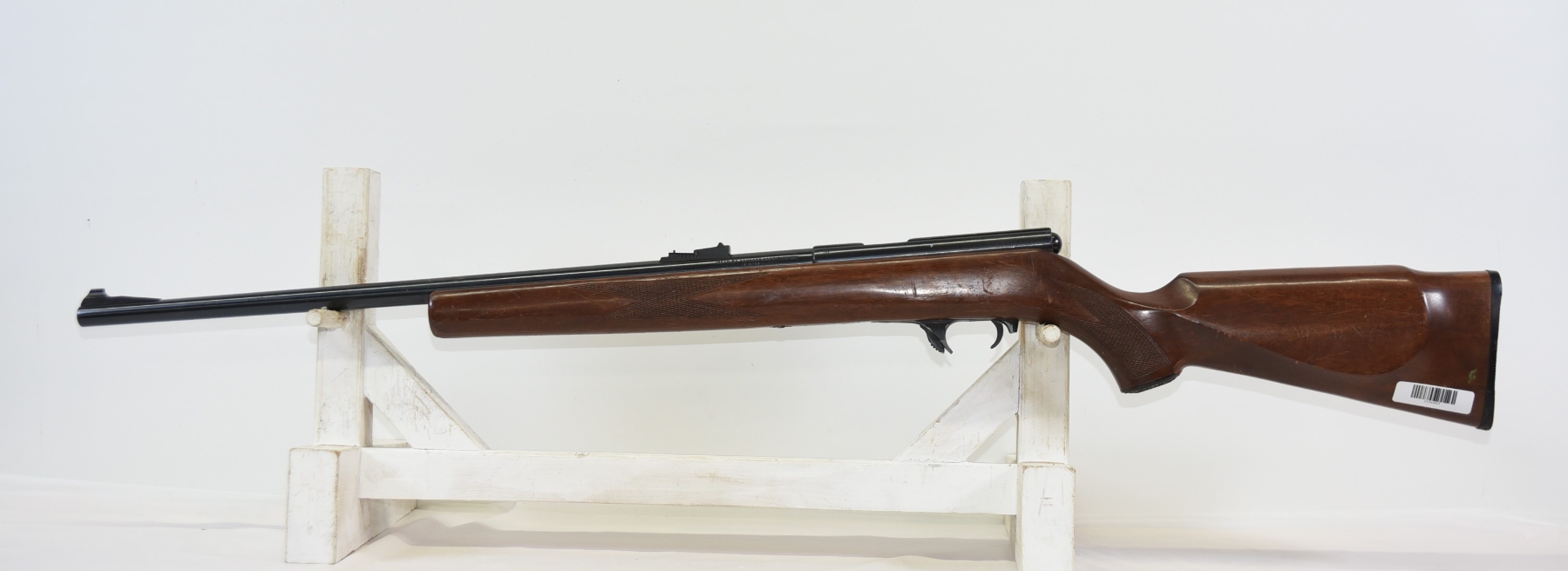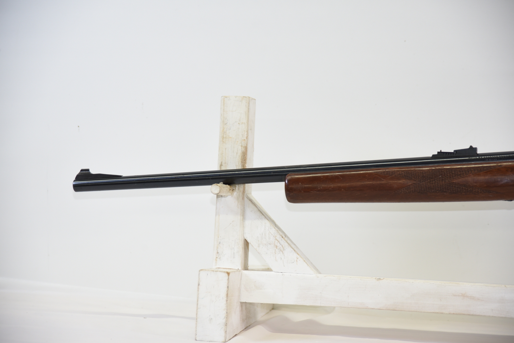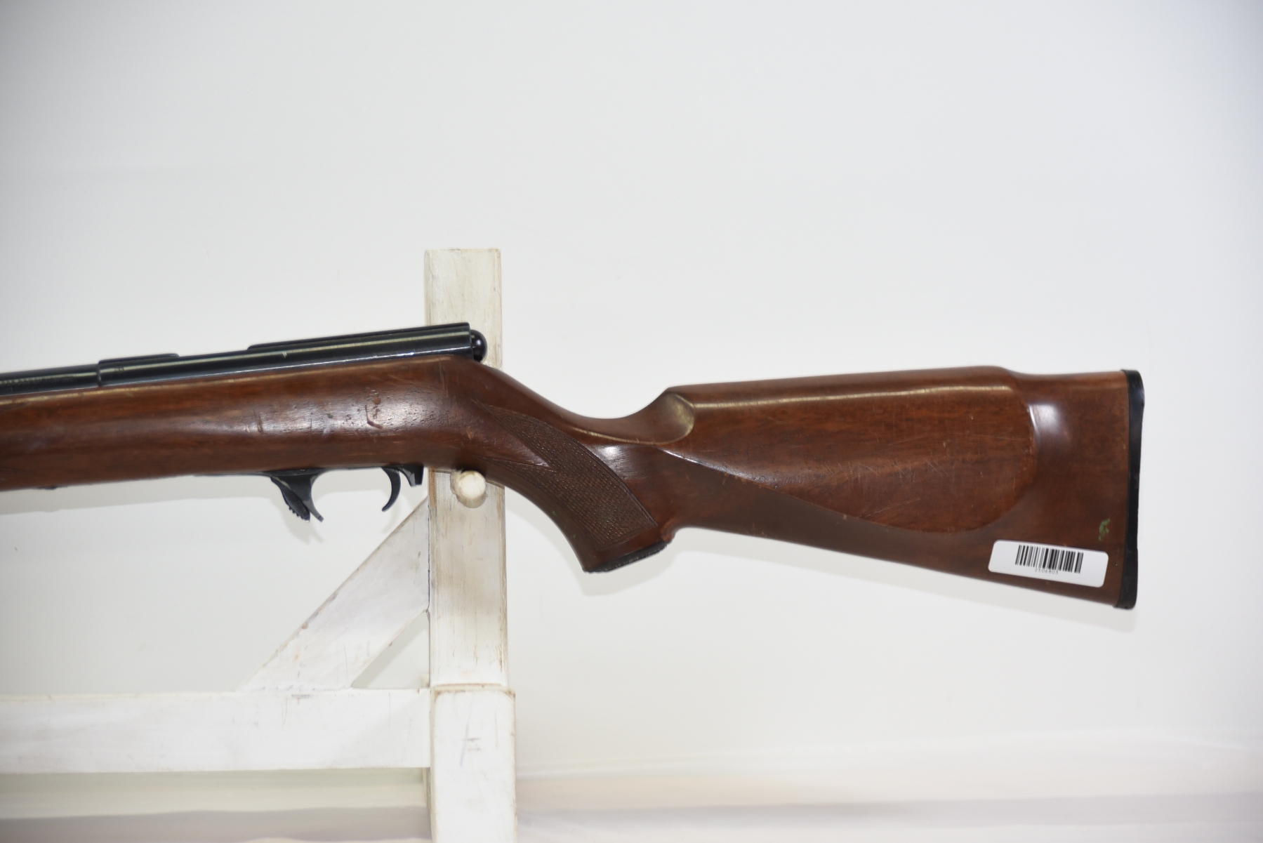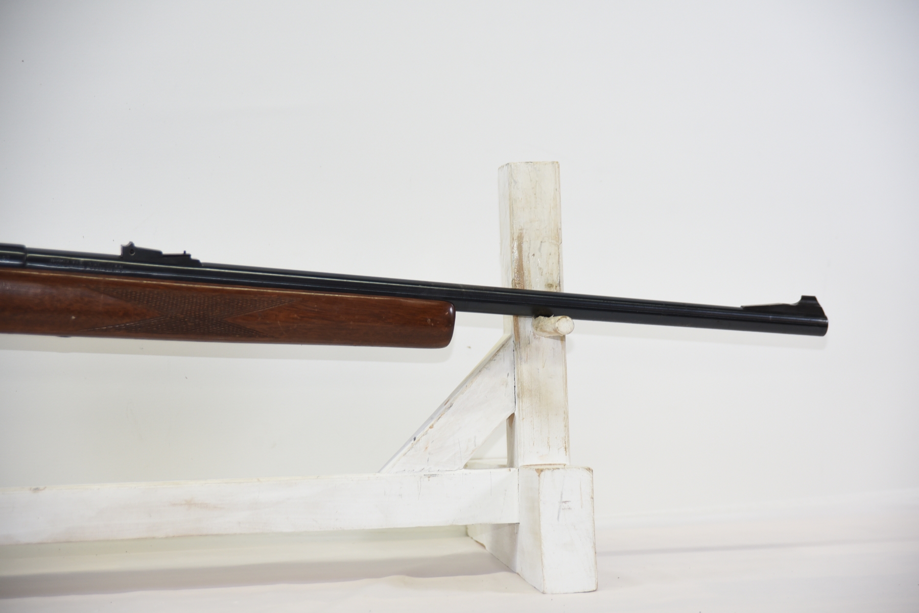 Wood stock shows lots of scratches, scuffs, light dents, trigger guard is broken; condition is good.