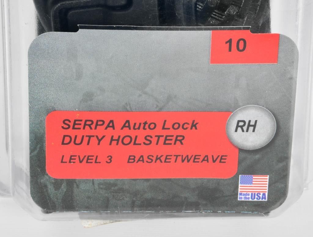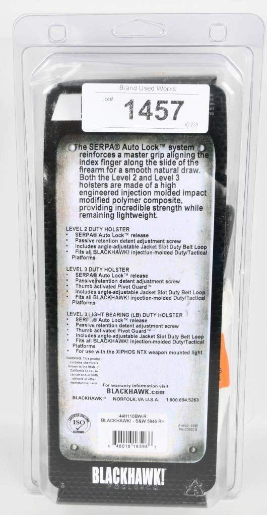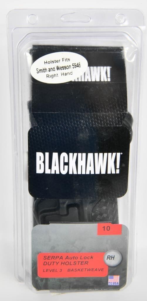 Hello bidders! Up for auction is a Blackhawk Serpa Auto Lock Duty Holster designed specifically for Smith & Wesson 5946 pistols. This level 3 right-handed holster features a durable basketweave design, providing both style and functionality for law enforcement professionals.
