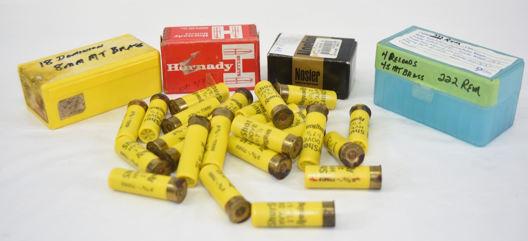 - 18 rounds Dominion 8mm shot brass