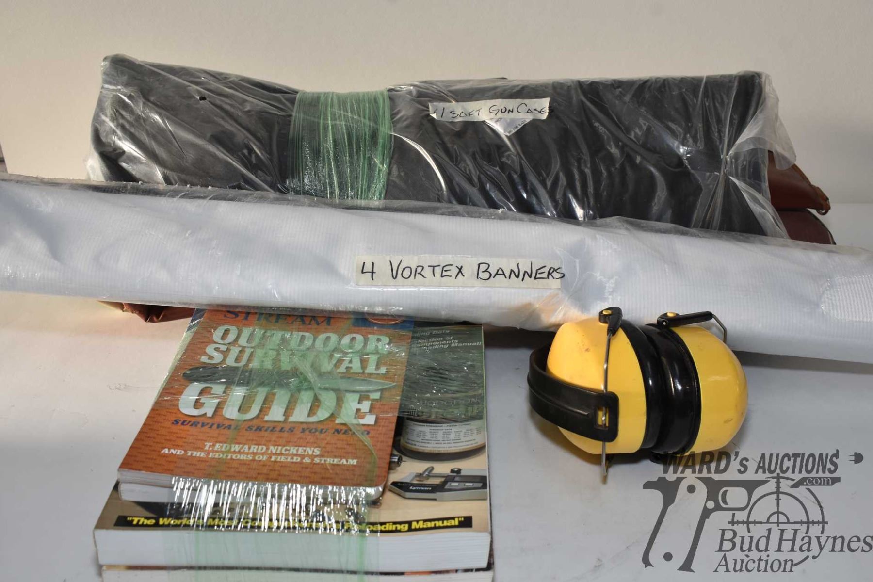 Box containing 2 Lyman reloading manuals, 2 outdoor books, a pair of ear muffs and 4 soft cases and Hornady poster