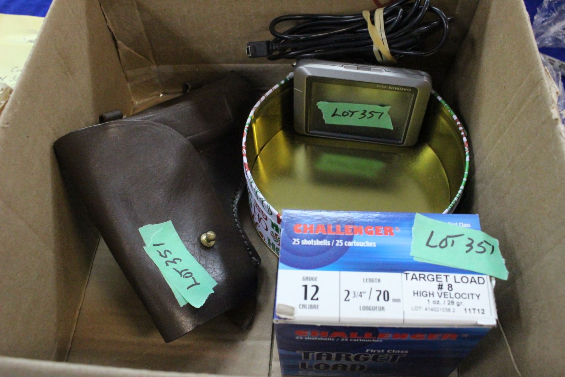 Box with Challenger, 12 ga, 2 3/4", Target Load; Pistol Holster & a GPS