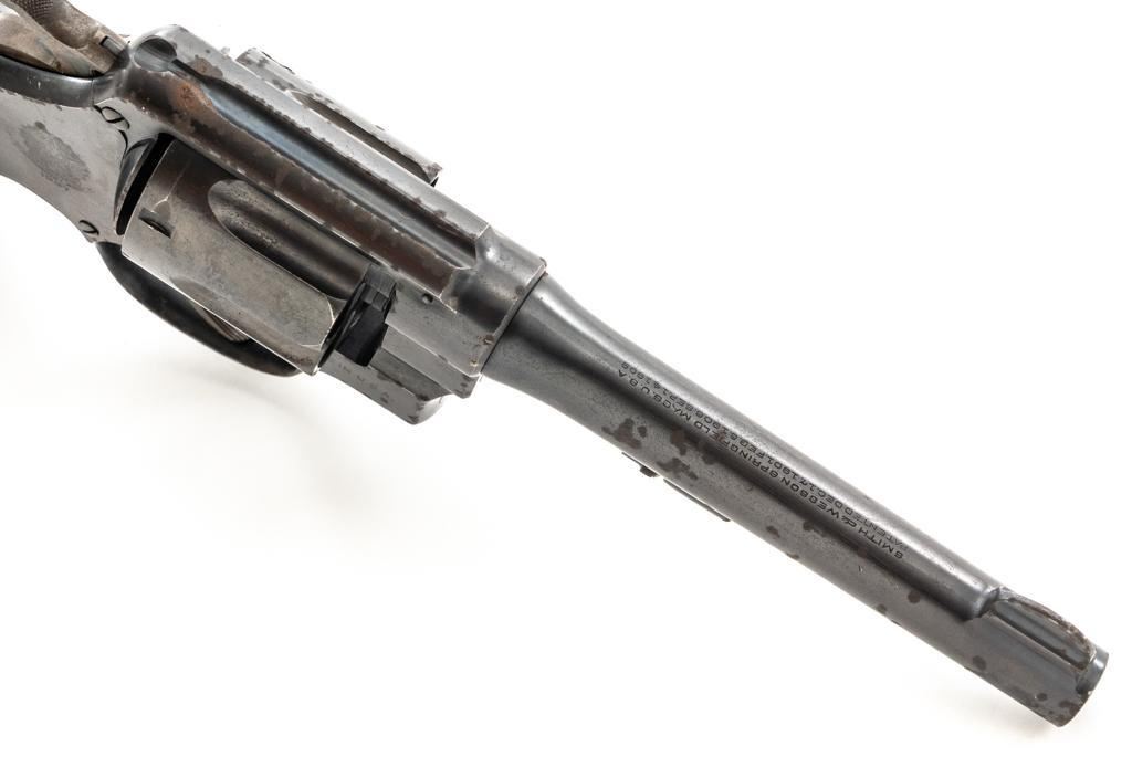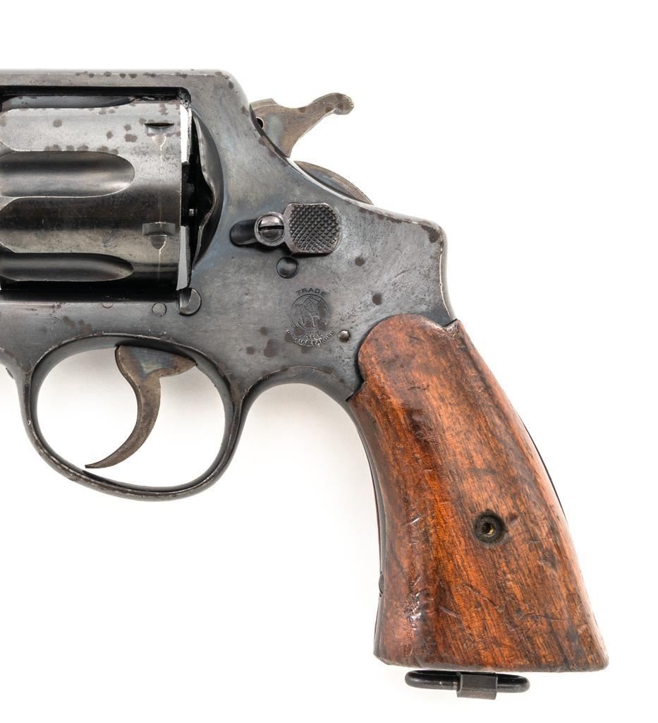 Brazilian Contract Smith & Wesson Model of 1917 .45 Hand Ejector Double Action Revolver, #208425, .45 ACP cal., 5.5" barrel, blue finish, smooth walnut two-piece grips, lanyard ring, 5-screw frame, half-round blade front and fixed square notch rear sight, with color case hardened hammer and trigger. Factory markings are clear, with a crisp Brazilian National Crest on the right side of the frame, dated 1937. Import marked on the left side of the grip frame, under the panel. Matching serial numbers on the cylinder, barrel, and frame. Revolver is in very good overall condition, retaining approx. 84%-86% thinning factory finish, showing moderate wear at the muzzle, light to moderate scattered spots of surface rust and corrosion. Top strap shows heavier rust due to poor storage. Trigger and hammer display muted color case hardening. Grips are in good condition, with dents and impressions consistent with service use and wear around the bases. Action fuctions well. Bore is good, with scattered light corrosion and defined rifling. Est.: $400-$700. (C&R/PPT)