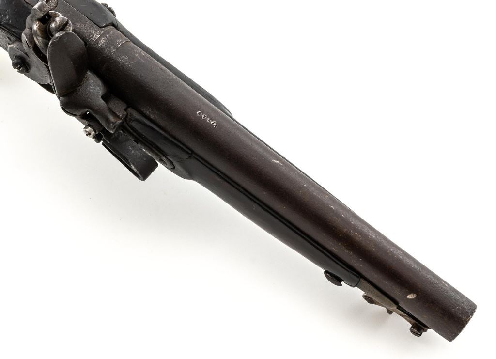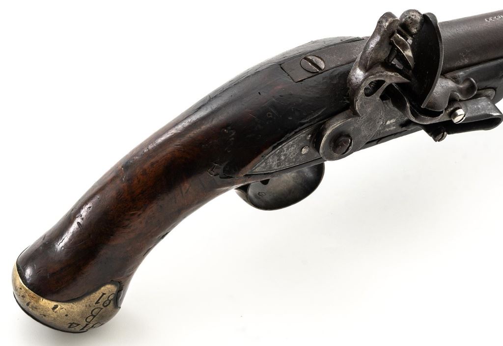 British 1796 Pattern Heavy Dragoon Flintlock Pistol, #2478, .75 cal., smoothbore, 9" round barrel with single flat iron key, bright finish hardwood stock; brass buttcap, trigger guard, and forend cap. No sights. Swiveling iron rammer is in good condition, it operates and locks in place smoothly. Two-line lockplate is marked "TOWER" on the tail and with "(Crown)/GR" and a Lock Viewers mark stamped under the pan. There is two-line engraving to the flat hammer. There are Proof and View marks stamped on left side of the barrel. Right side of the buttcap is stamped "1814/B/81". "(star)2478" is stamped on top of the barrel and partially on the lockplate. Condition overall is fair, barrel has dark brown patina, and the lockplate assembly shows darkening and patina. Wood is fair, with a glue repaired crack behind the lockplate, small cracks and chips to both sides of the forend. Hammer and frizzen spring operate smoothly. Hammer holds on half and full cock. Bore rates fair to good with surface rust but may clean better. Est.: $700-$900. (Antique)
