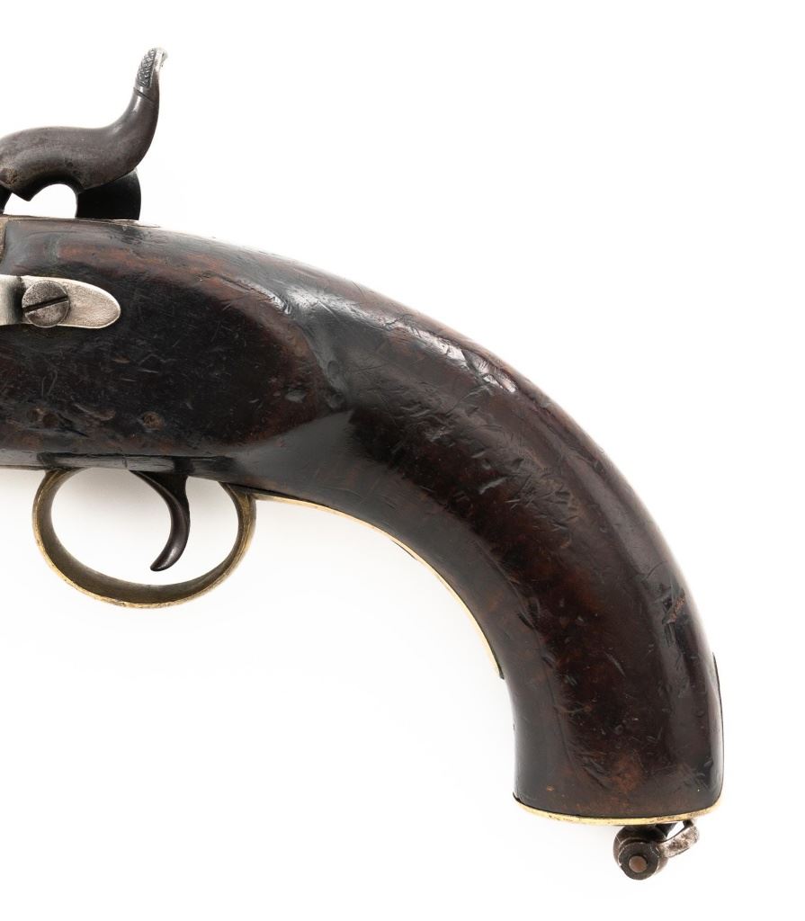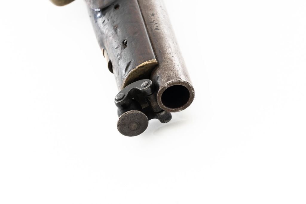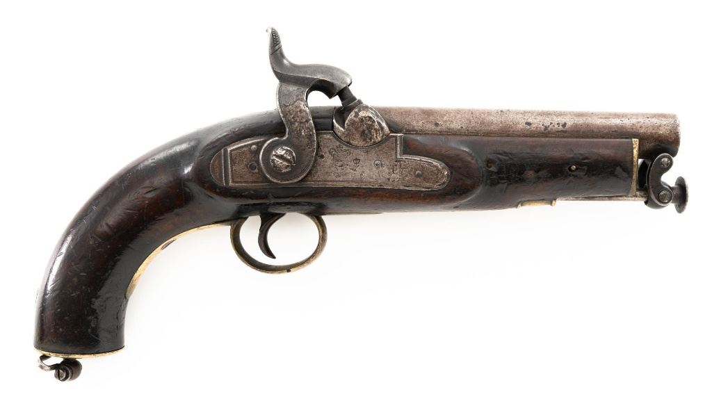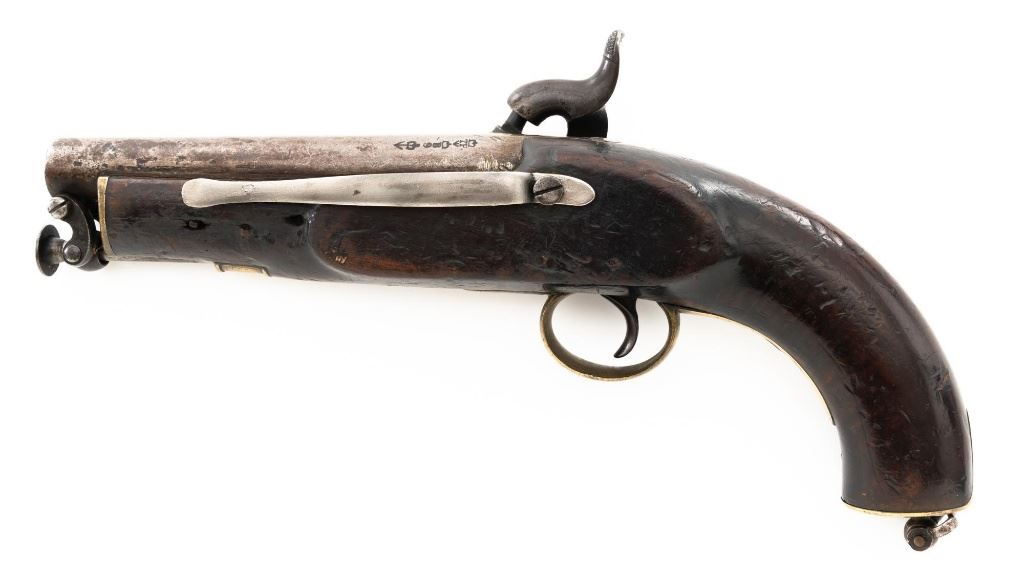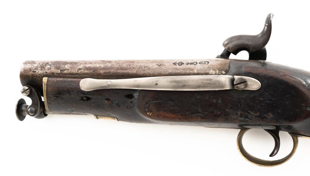 British 1839 Pattern Coast Guard Percussion Pistol, #NVSN, .67 cal. smoothbore, bright finish. Hardwood stock with brass trigger guard, buttcap, and rammer pipe. No sights. A captive swiveling iron rammer is mounted under the pinned barrel and a replacement lanyard loop is attached to the butt. Spring steel belt clip is attached to the left side. Lock plate is marked "(crown)/TOWER/(Unreadable date)/(Lock Viewers mark)". There are proof and inspection stamps on left side of the barrel. Condition overall is fair. Metal shows heavy use, wear, and patina. Wood with general bruises, handling marks, and areas of thinning to the finish. There is a 1.5" crack to left side of the forend. Action operates smoothly; hammer holds on half and full cock. Bore rates fair with visible fine rust that may clean better. Est.: $400-$700. (Antique)