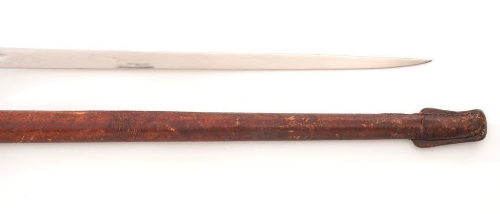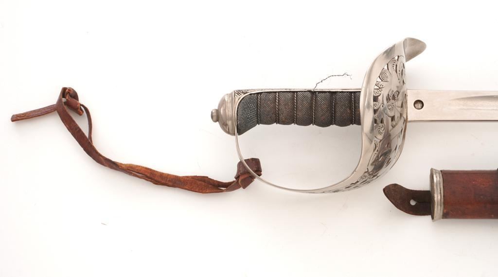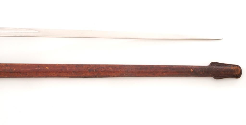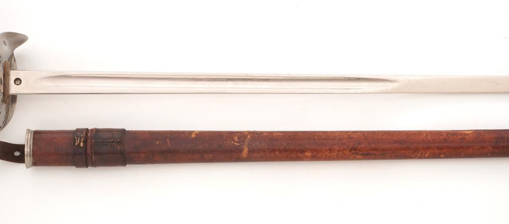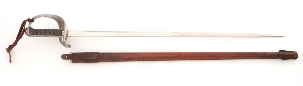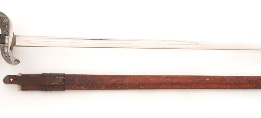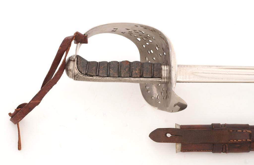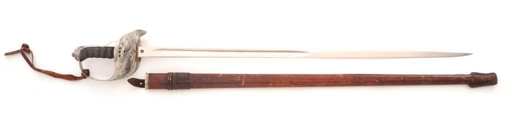British 1897 Pattern Infantry Sword with Scabbard, #M3991, 32.25" blade, 38.25" OAL. Blade is marked "ROBERTS & SONS/BIRMINGHAM/MAKERS TO THE WAR & INDIA OFFICES" on left side, with a silver "PROOF" button on the right side. Straight blade is marked with a "(crown)" over the British Royal Coat of Arms on the right side and a "(crown)" on the left side, with decorative motifs on both sides. Nickeled three-quarter basket hilt has a pierced foliage decorated guard marked with the Crowned Cipher of Queen Victoria. Shagreen grip is wrapped with spring steel wire with a checkered back strap and nickeled pommel. Condition is very good, blade appears to have been renickeled and the markings are now muted. Guard shows light use and toning. Grip shows wear and there is a loose wire on the right side. Leather knot is in fair condition. Scabbard is unmarked and has a brown leather cover on the body and a nickeled throat. Condition is fair with the leather showing craze cracking, scratches, and scuffs to the finish. There is a crack and separation to the drag but the wood interior appears intact. Blade enters and withdraws smoothly. Est.: $200-$400.