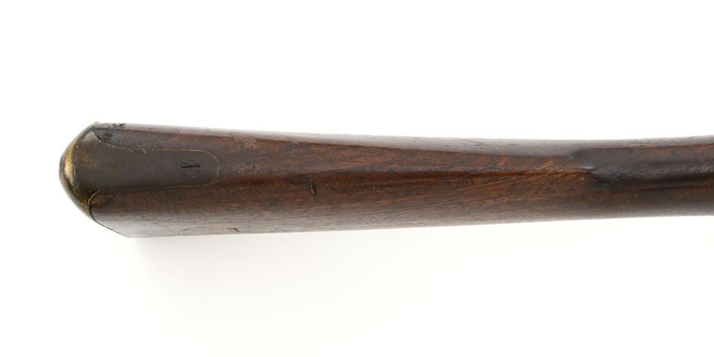 British Altered Pattern 1842 Rifled Musket, #NVSN, .702 cal., 39" round barrel with four-groove rifling, browned finish, walnut stock with brass trigger guard, buttplate, and three rammer pipes. Blade front sight and adjustable folding leaf rear sight with two "V"-notches, graduated to 1000 yards. Barrel is attached to the stock with three iron keys. A very good condition iron rammer is mounted under the barrel. There are sling swivels mounted to the trigger guard and forend. Rifle Musket was altered into its present configuration by rifling the barrel and fitting the rear sight. Lock plate has two line engraving and is marked "1849/ENFIELD/(Lock Viewers mark)" with a "(Crown)VR" on the tail. Left side of the barrel is stamped with Crowned Proof and View marks and a later "Opposing Arrows" sold out of service stamp. A clear Board of Ordnance "(Broad Arrow)BO" mark is stamped on left side of the buttstock and "YEOMANS" with crowned inspection marks are stamped on the underside of the buttstock. "C.O.BIRCHAM" is stamped on left side stock flat behind the rear lock nail. Condition overall is very good, with the barrel showing a mottled appearance from a partial cleaning. Lockplate and hammer have toning and spots of patina. Brass parts have a darkened patina. Wood is very good with handling marks and impressions to the darkened finish. Hammer operates smoothly and holds on the half and full cock. Bore rates good with several spots of pitting, otherwise bright with well-defined rifling. Est.: $700-$950. (Antique)