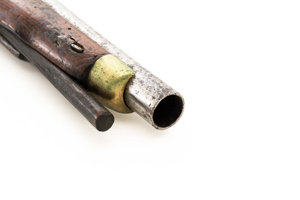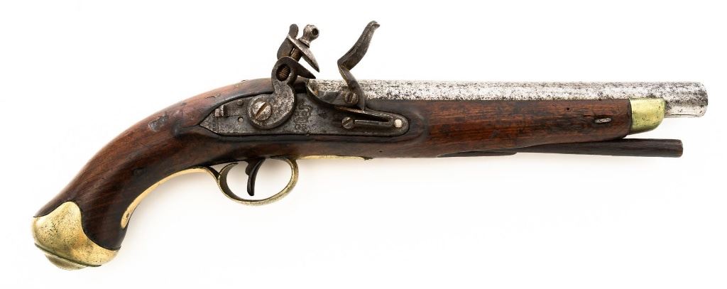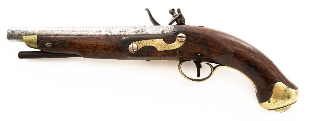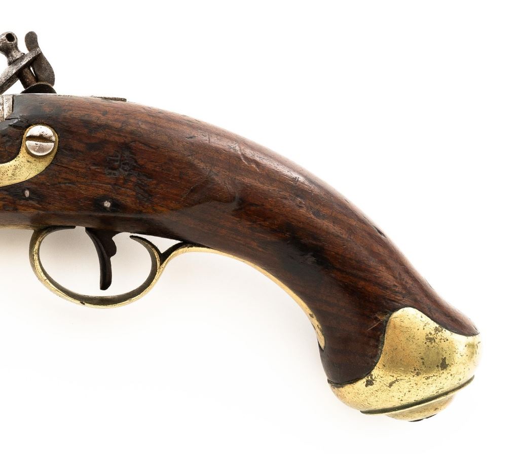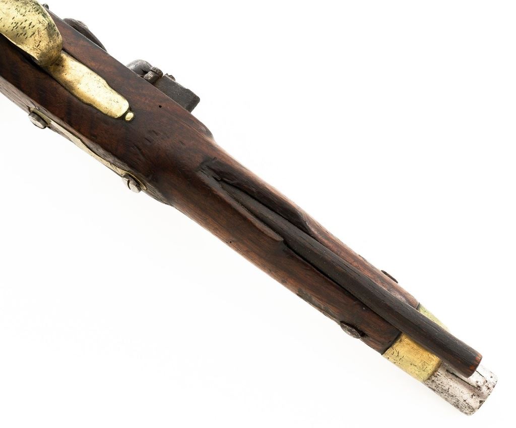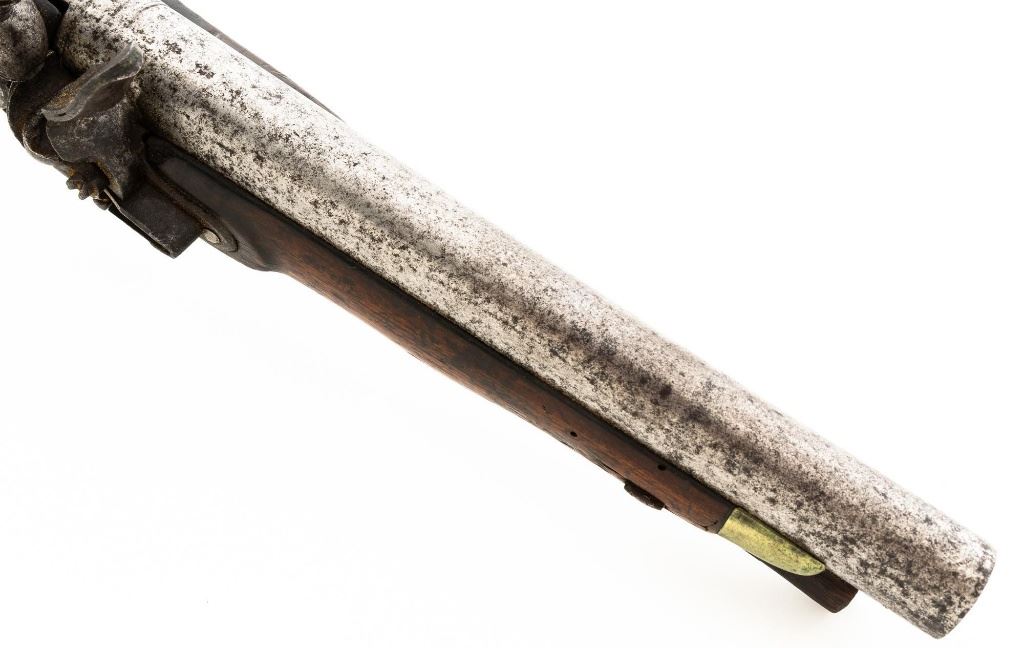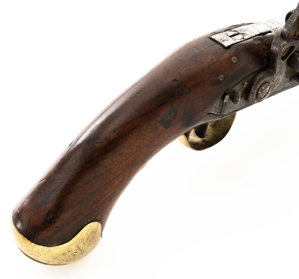 British Dragoon Flintlock Pistol, #NVSN, .69 cal., smoothbore, 9"round barrel with single flat iron key, bright finish, hardwood stock; brass buttcap, trigger guard, and forend cap. No sights. Hardwood rammer measures 8.25" long. Lockplate is marked "TOWER" on the tail forward of an engraved "W" with "(Crown)/GR" and a Lock Viewers mark stamped under the pan. Top of the barrel is stamped with a Proof and View mark and there is a "(Crown)14" inspectors mark stamped into the barrel tang. "TB" stock makers initials are stamped into the left side stock flat. Condition overall is fair. Barrel has been cleaned and now shows pitting and patina. Lockplate assembly is darkened with patina. Brass fittings have patina and handling marks. Wood is fair with cracks to right side of the forend, behind the barrel tang, and behind the lock plate. Action and frizzen spring operate smoothly. Hammer holds on half and full cock. Bore rates fair with rust but may clean better. Est.: $600-$800. (Antique)