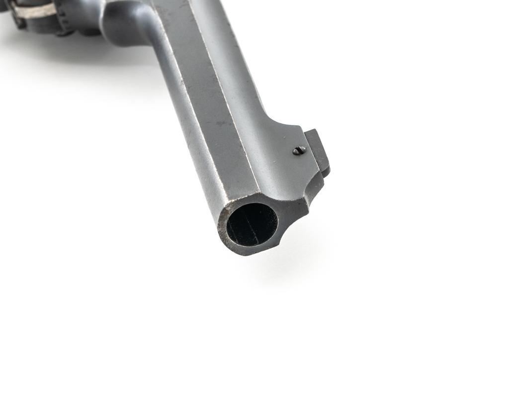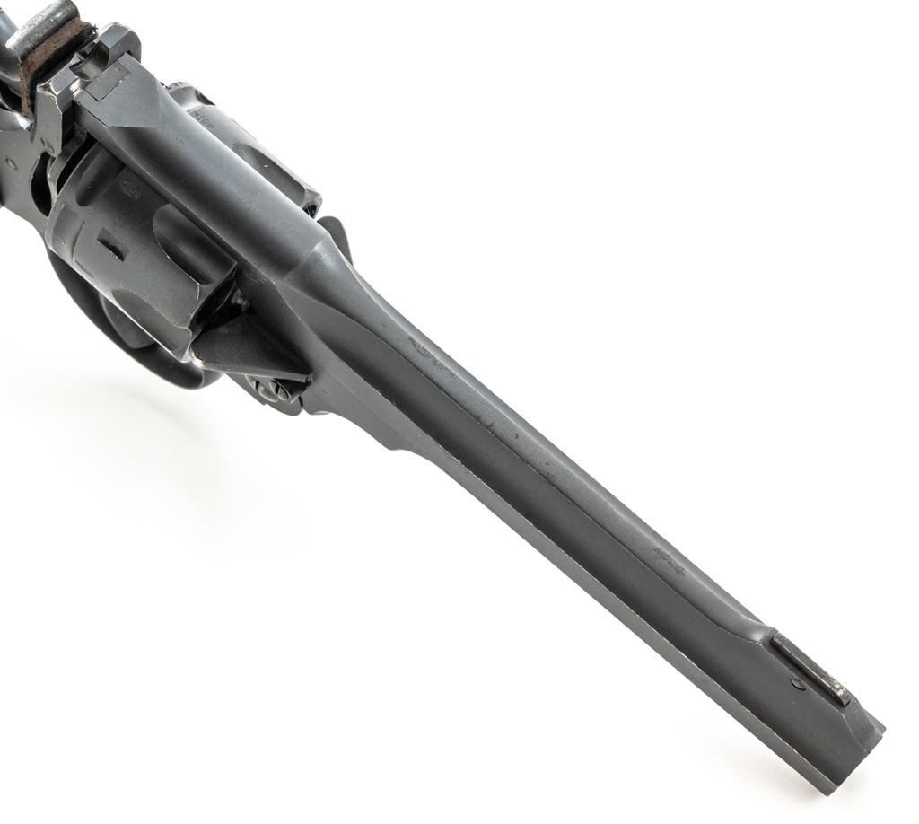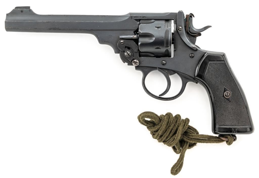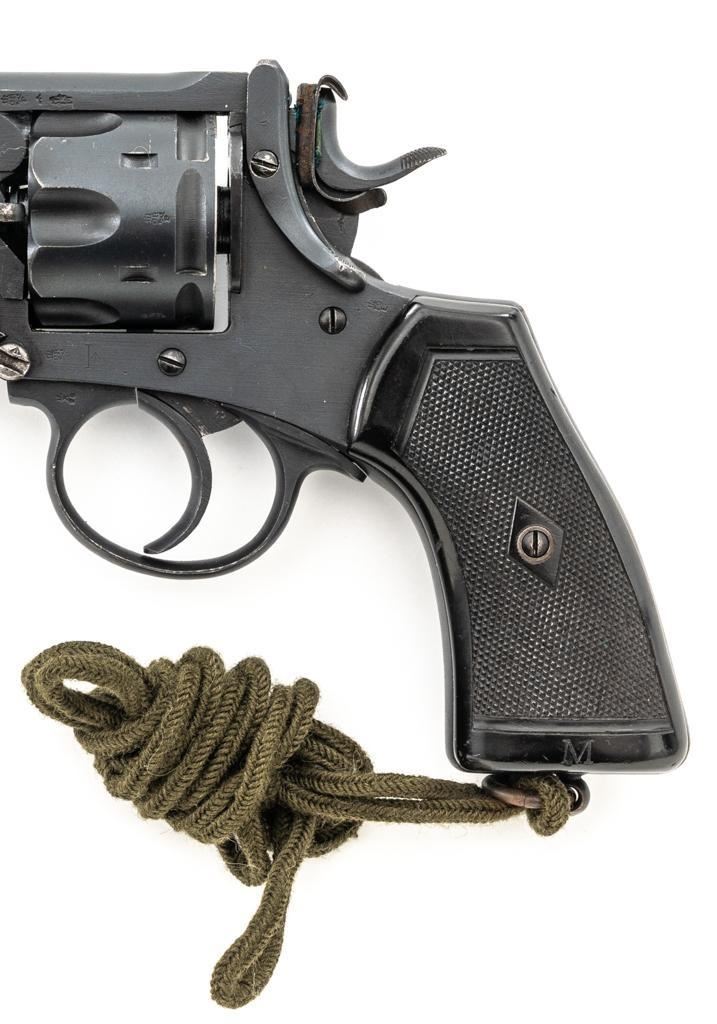 British Enfield No.1 Mk VI Double Action Revolver, #A6767, .45 ACP cal., 6" flat sided barrel, blued finish, checkered black plastic grips marked "M" on each side, pinned blade front sight, fixed rear sight with "U"-notched groove, and swiveling steel lanyard ring at bottom of the grip frame, with an excellent condition green lanyard. A leather protector is attached to face of the hammer. Right side of the frame is marked "ENFIELD/Mk(crown)VI" with a "25 (in service stamp)/(proof stamp)/(broad arrow)/(view inspection mark)" on left side of the barrel strap. Pistol was in Australian service and is stamped with a "D(broad arrow)D" and "784" rack number on the rear grip strap. With "(broad arrow)D" on left side of the frame and barrel. Matching numbers. No visible import marks. Cylinder was importer converted to .45 ACP caliber by machining off the rear. Condition overall is fine, retaining approx. 95% reblued finish, showing a few old patina spots to the barrel. Grips are very good, showing handling marks and areas of flattening to the checkering. An "M" has been scratched into the bottom of the right grip. Action locks up, cycles, and ejects smoothly. Bore is bright with very good, clearly defined rifling. There is some mild pitting visible in the chambers. Est.: $400-$600. (C&R/PPT)